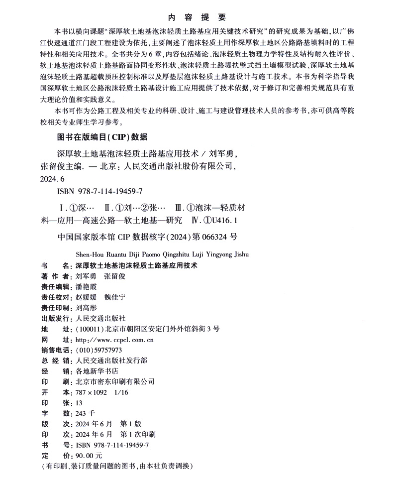 书名:深厚软土地基泡沫轻质土路基应用技术