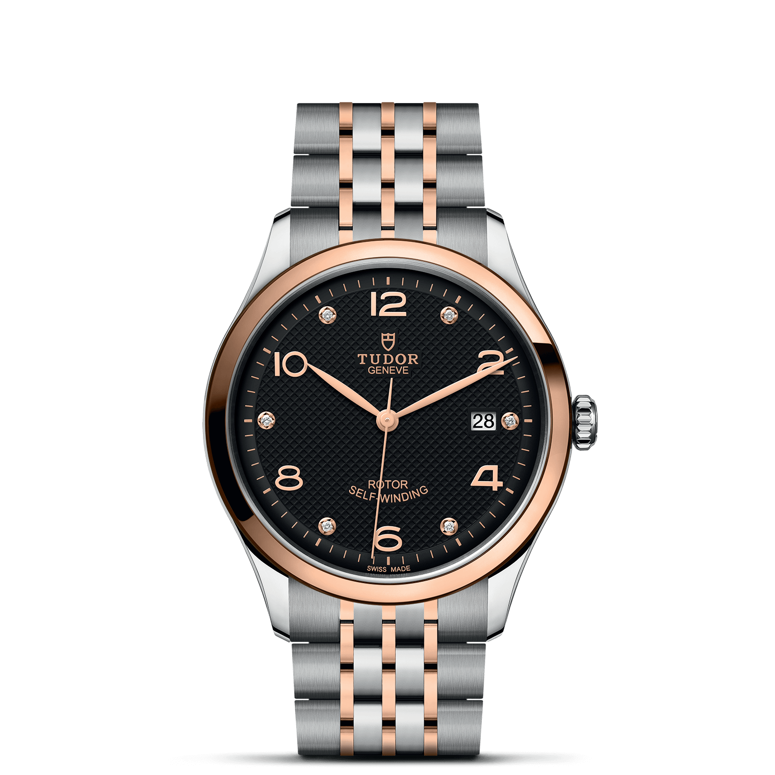 玫瑰金首排中央链节位于6点钟及12点钟位置;其他精钢中央链节覆有0.2毫米18K玫瑰金薄层