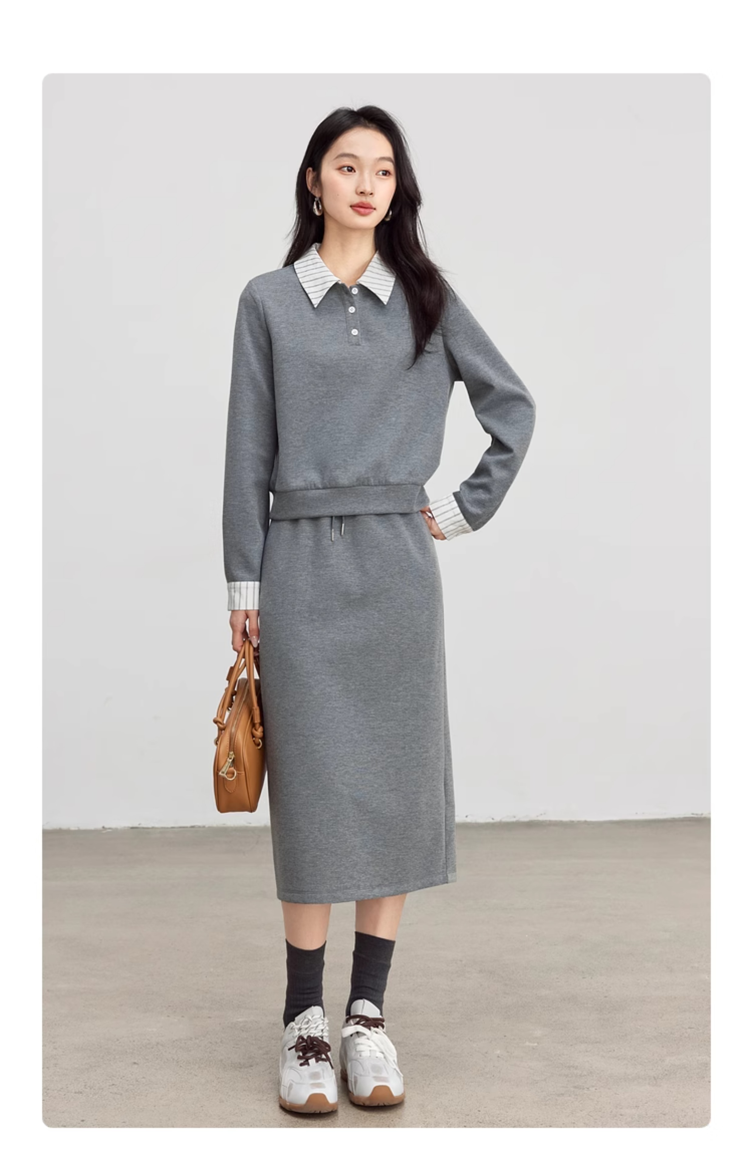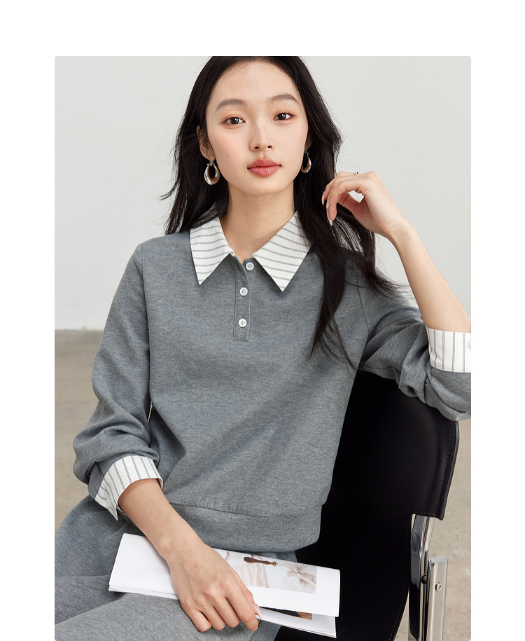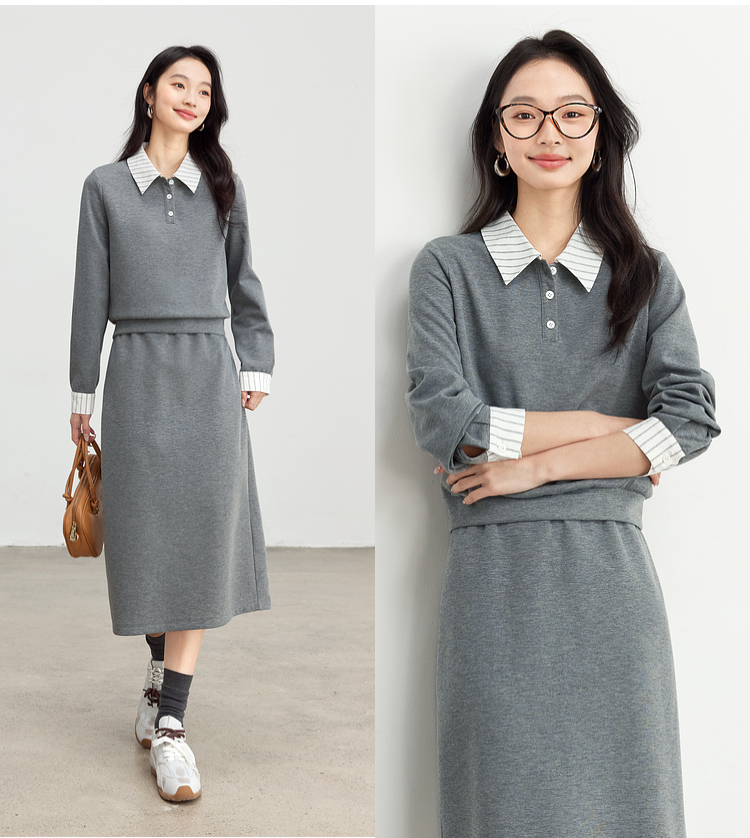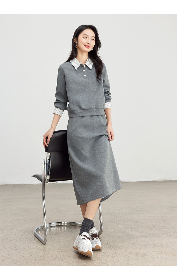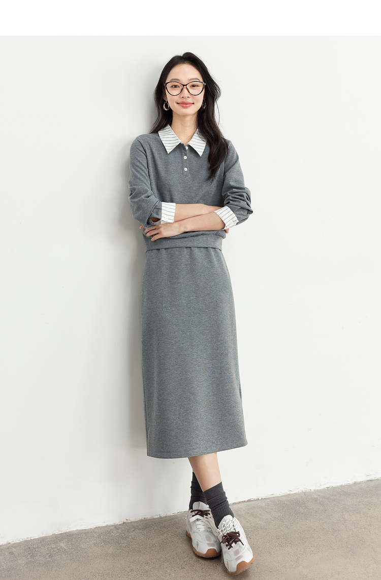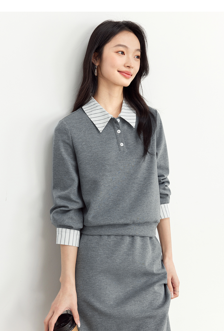 【年终特卖】熙世界休闲条纹衬衫领卫衣套装女秋直筒半身裙两件套