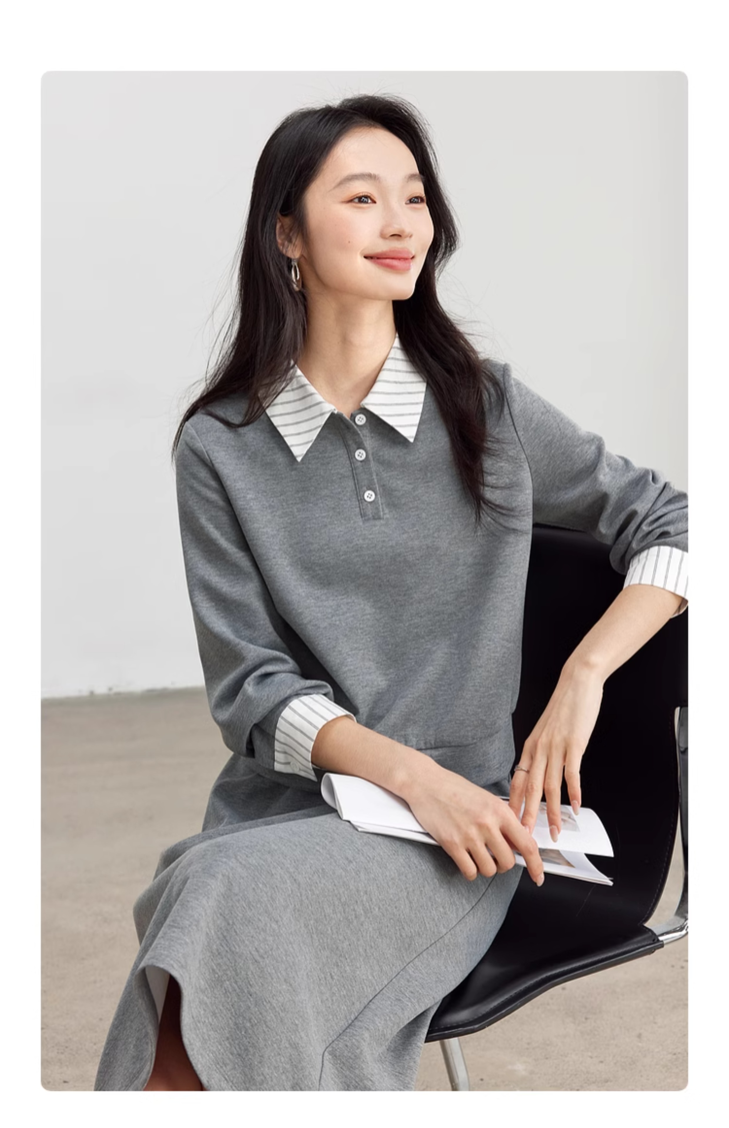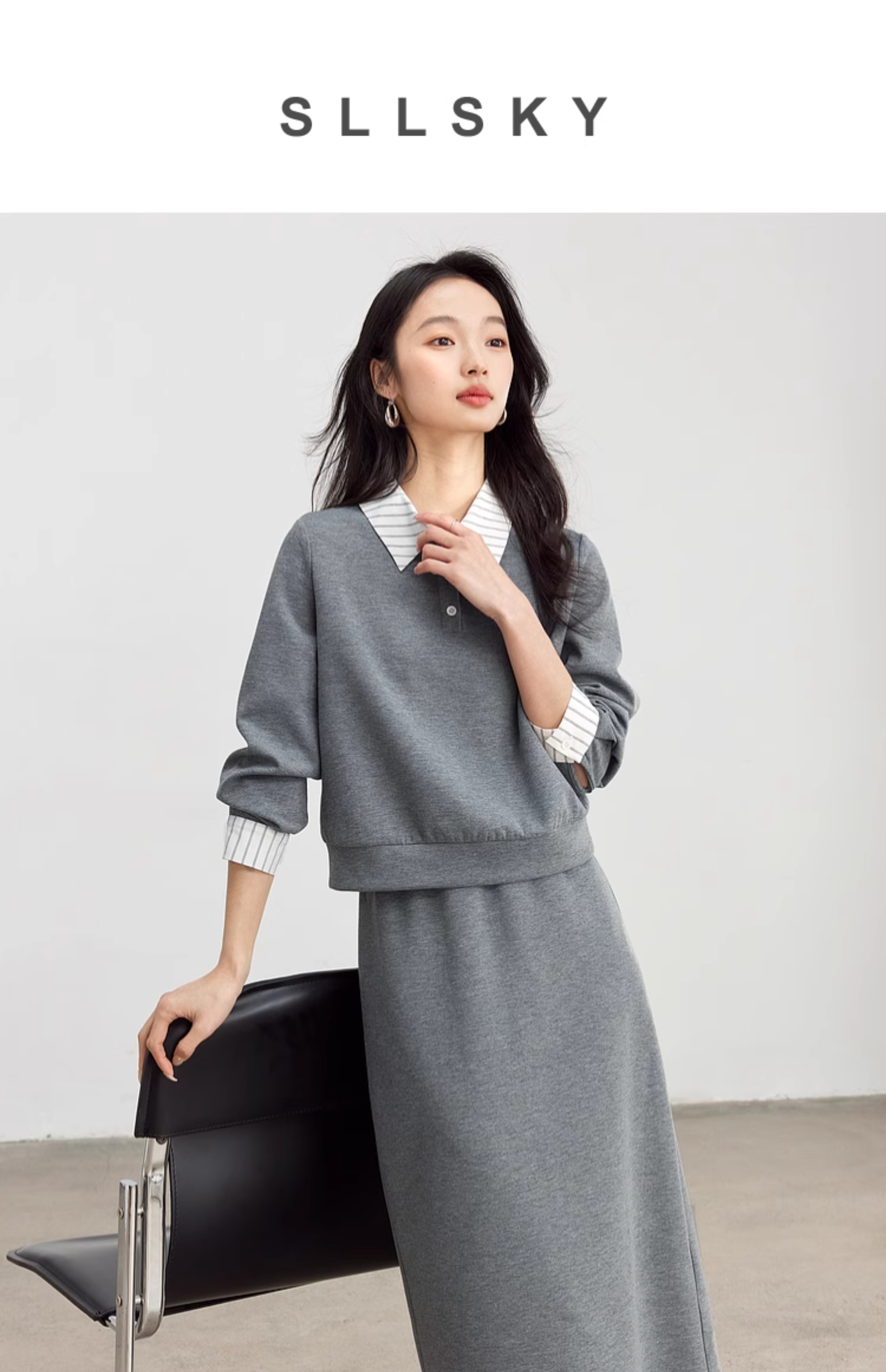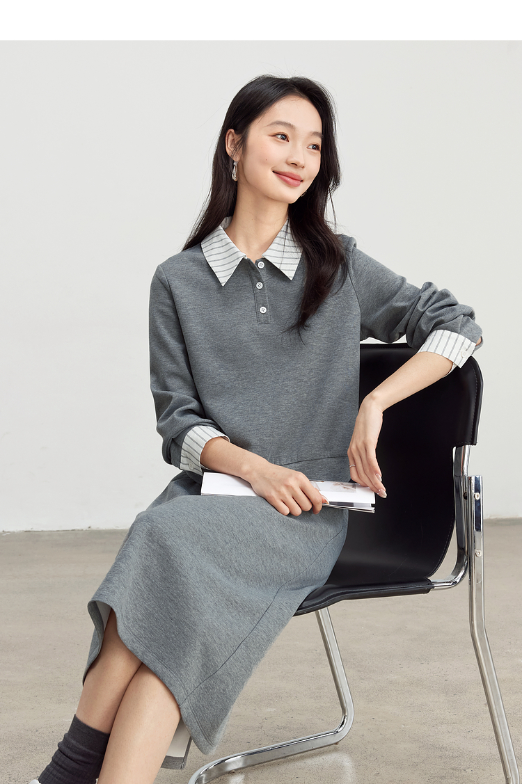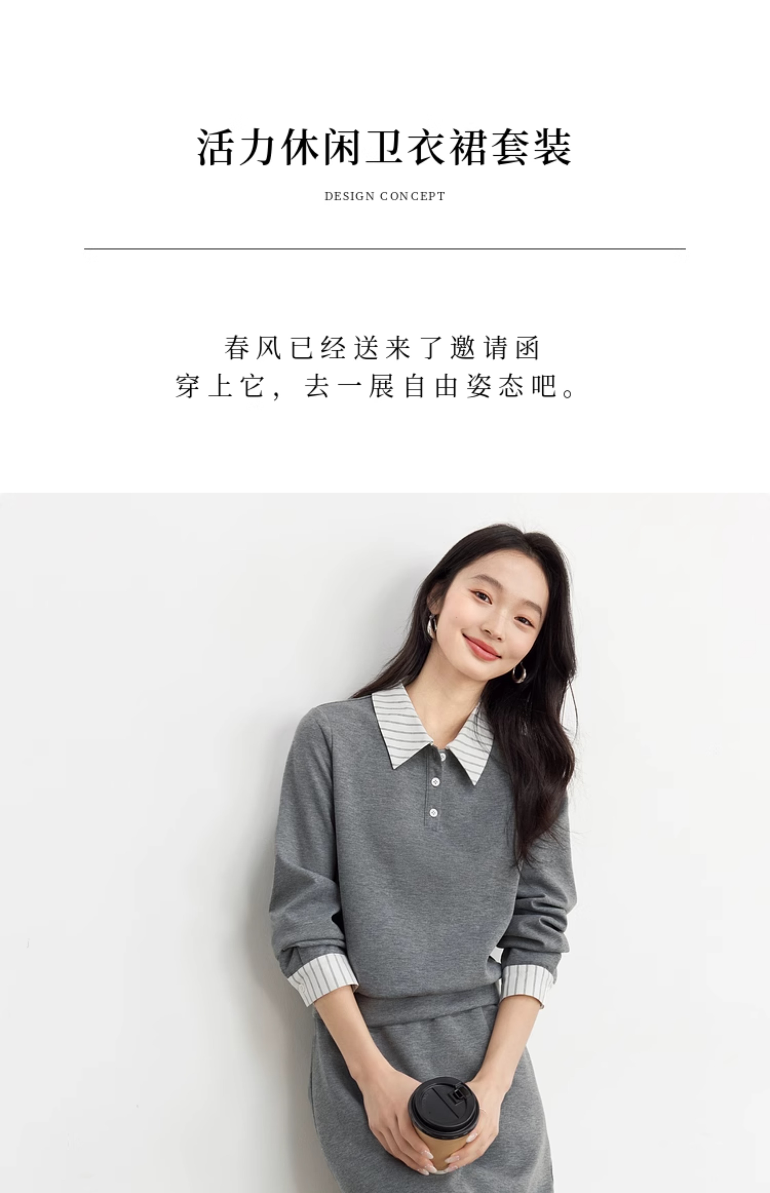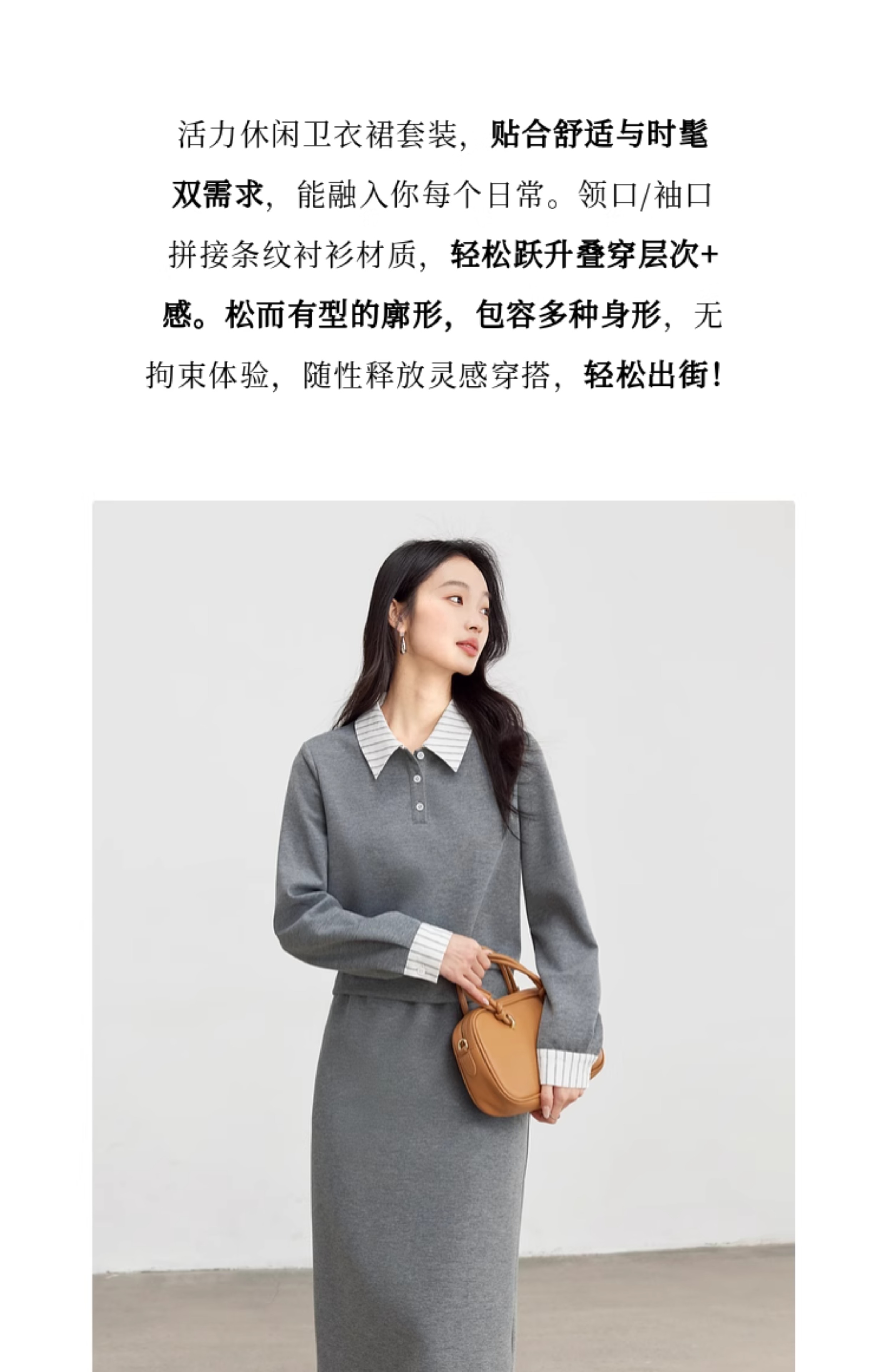 【年终特卖】熙世界休闲条纹衬衫领卫衣套装女秋直筒半身裙两件套