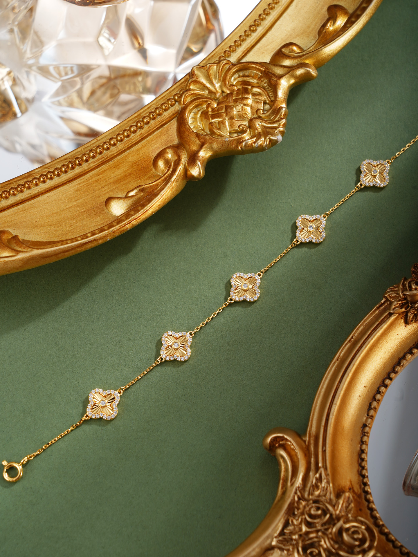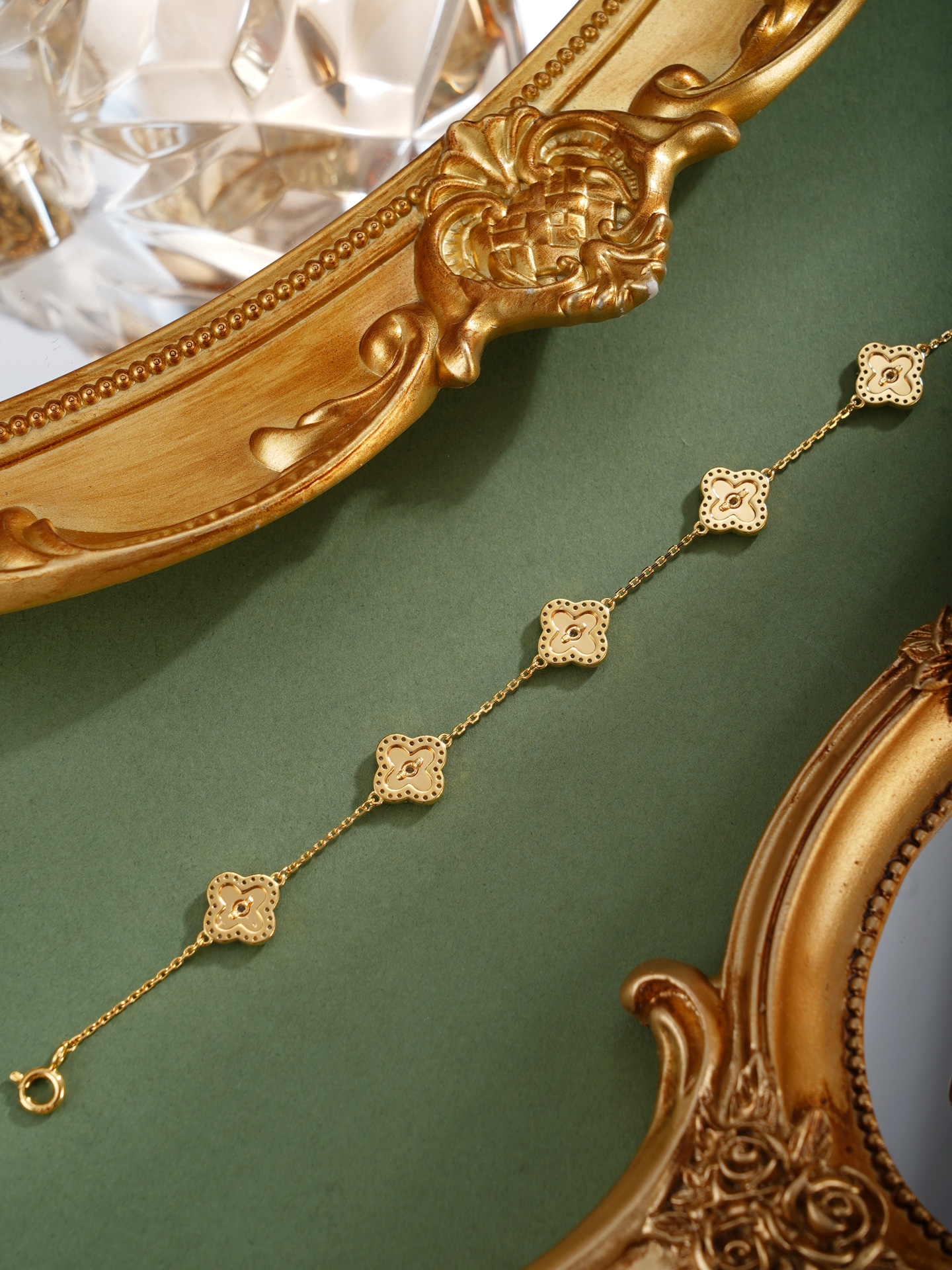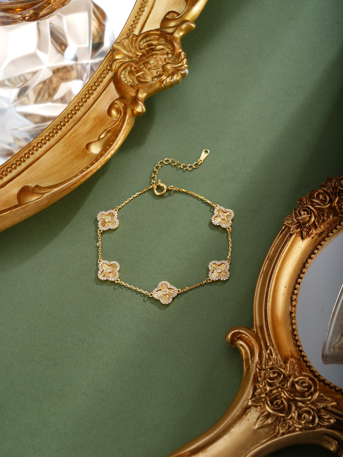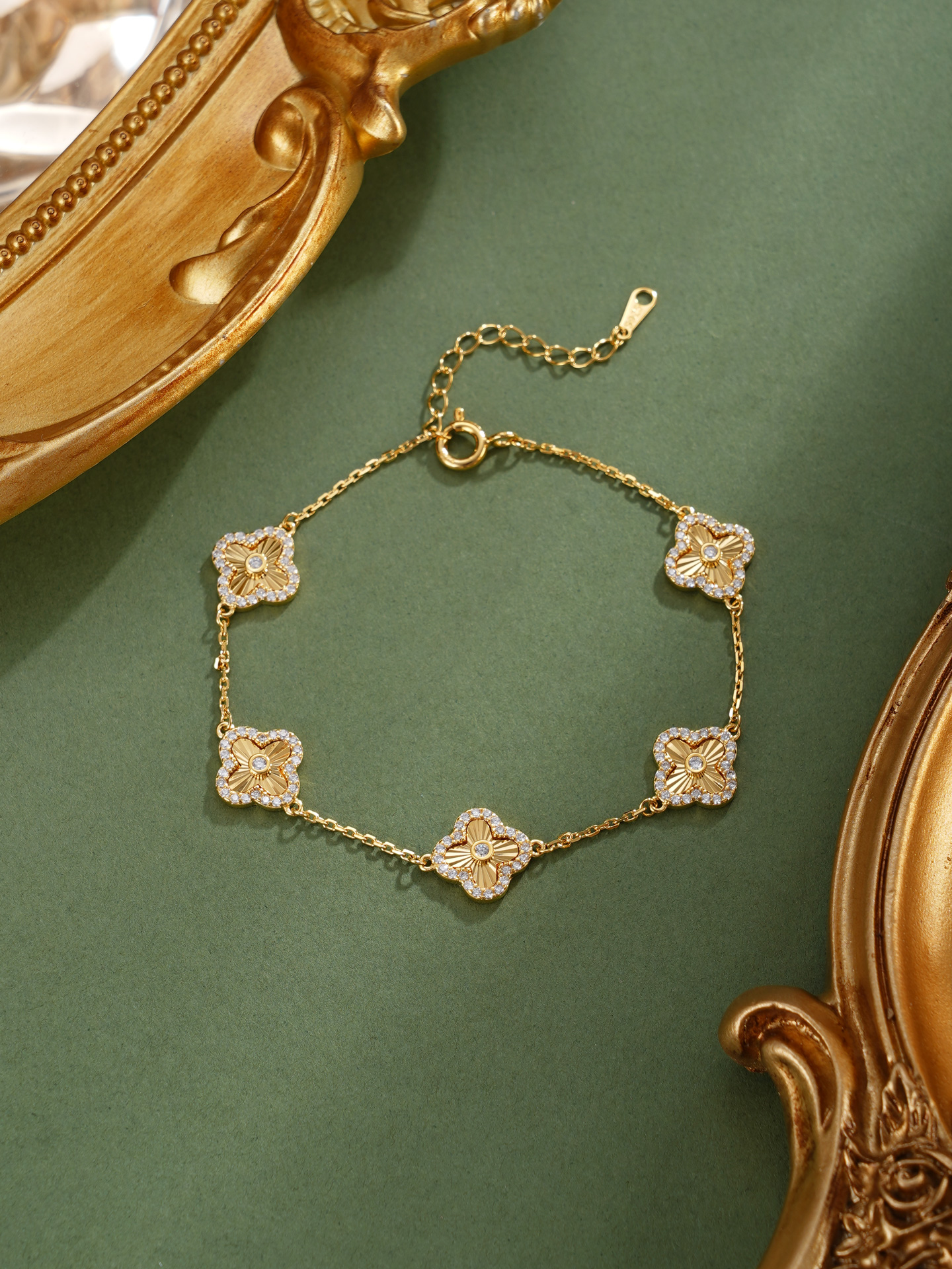 【寓意】:四叶草藏"幸运、希望、真爱、健康"四重吉兆,纯银四叶草手链采用镀金工艺,取名“四叶明媚”,寓意人生四福俱全,明媚安好。