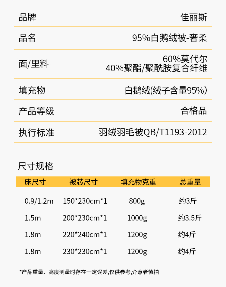 佳丽斯鹅绒羽绒被95白鹅绒冬被芯加厚保暖抑菌鹅绒被子轻柔御寒
