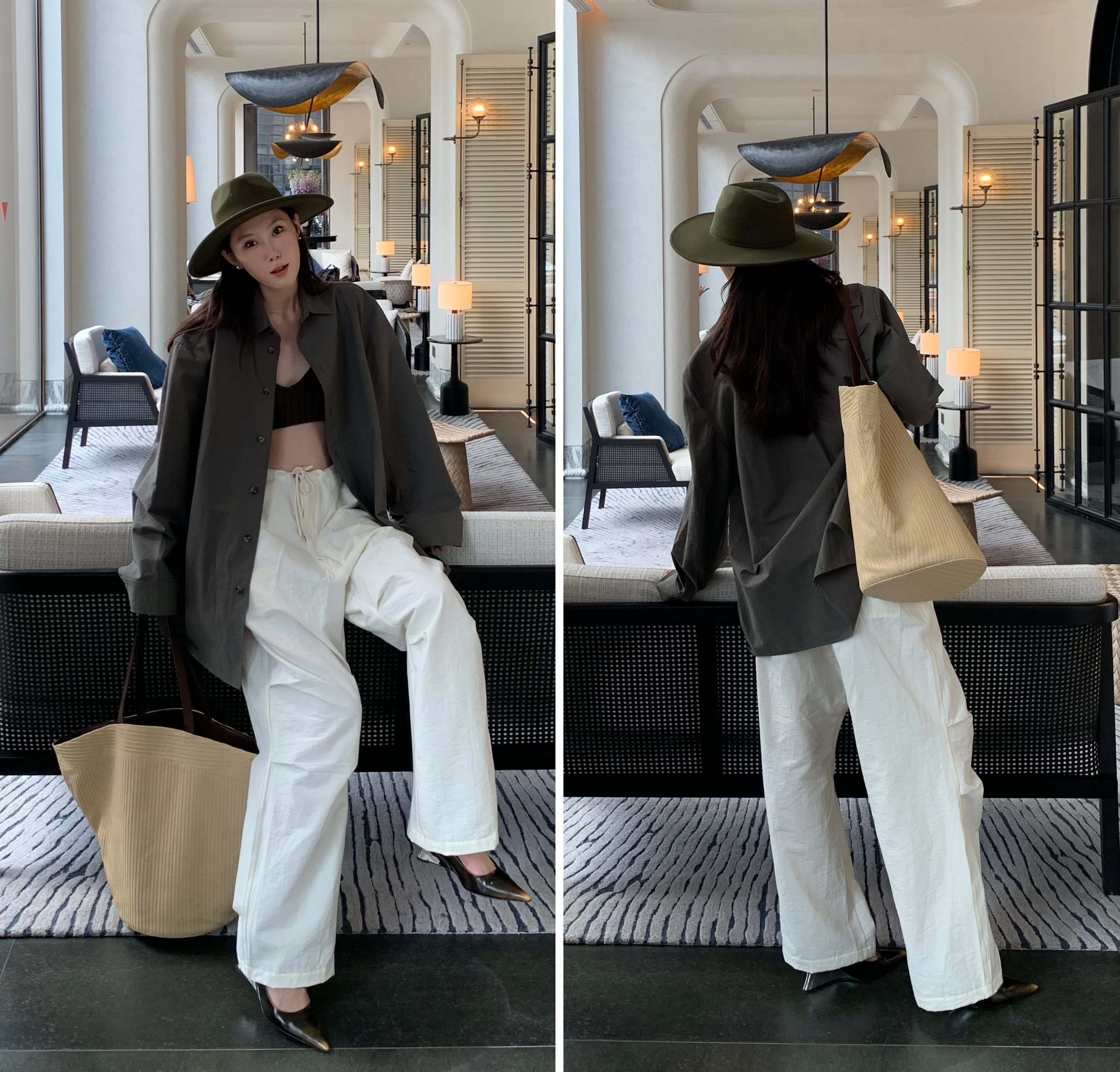 HIDEMI 自然白简约设计感竖压纹褶皱感衬衫套装 衬衫/阔腿裤