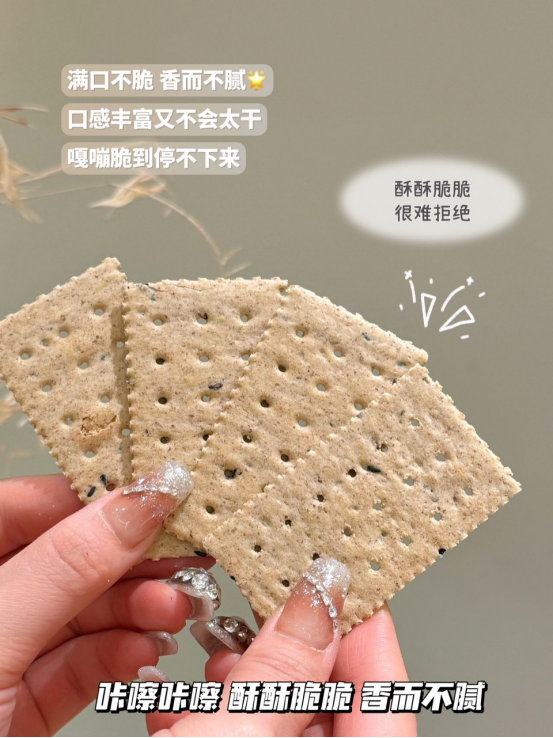 真材实料看得见: 打开就能看到饼干上满满全麦粉、黑芝麻、 健康的麦香香味在口腔萦绕~ 有种减肥时期吃到肉🥩的满足感~ 口感也非常有惊喜,入口特别酥脆。