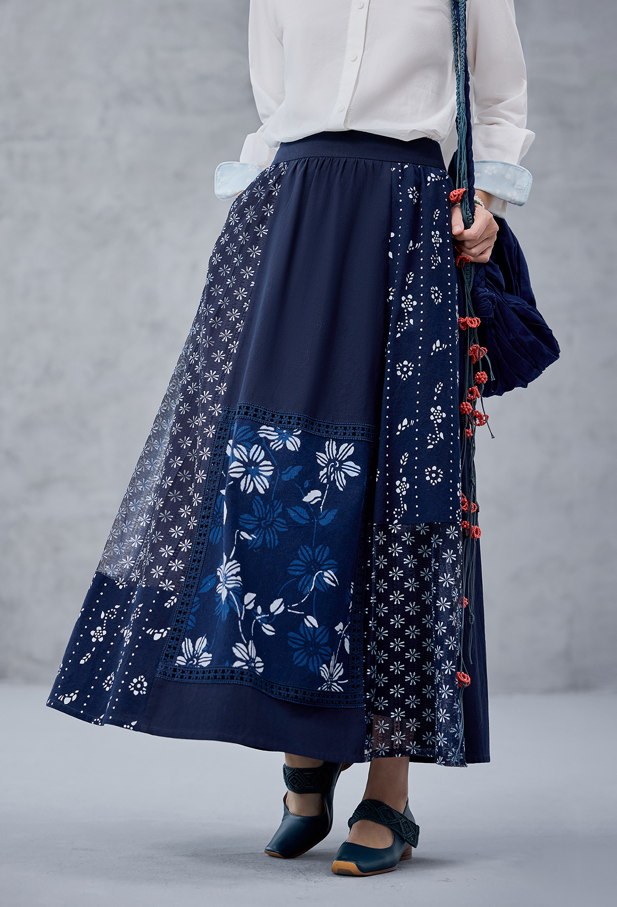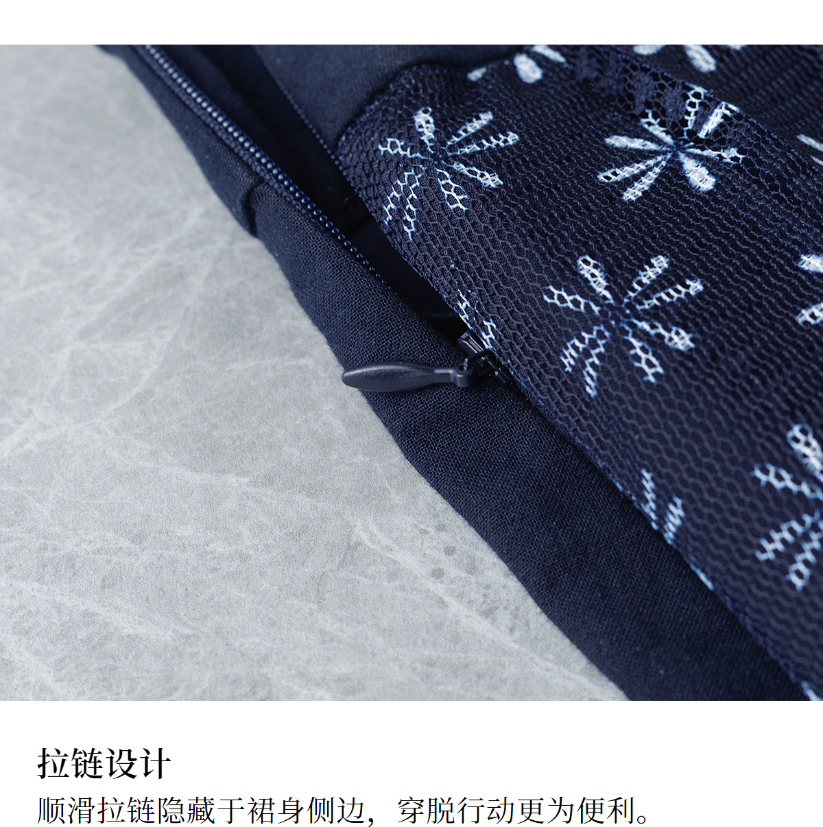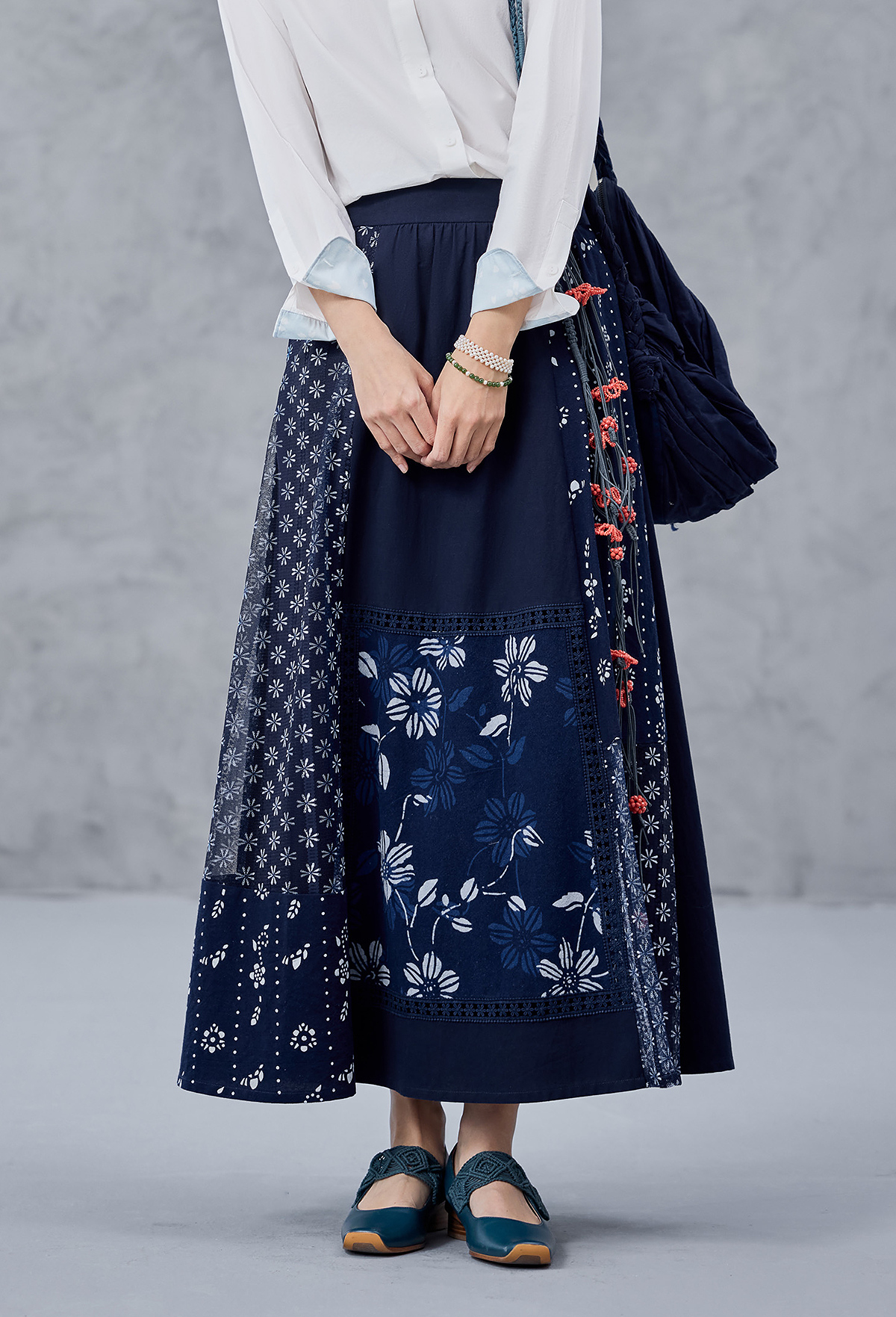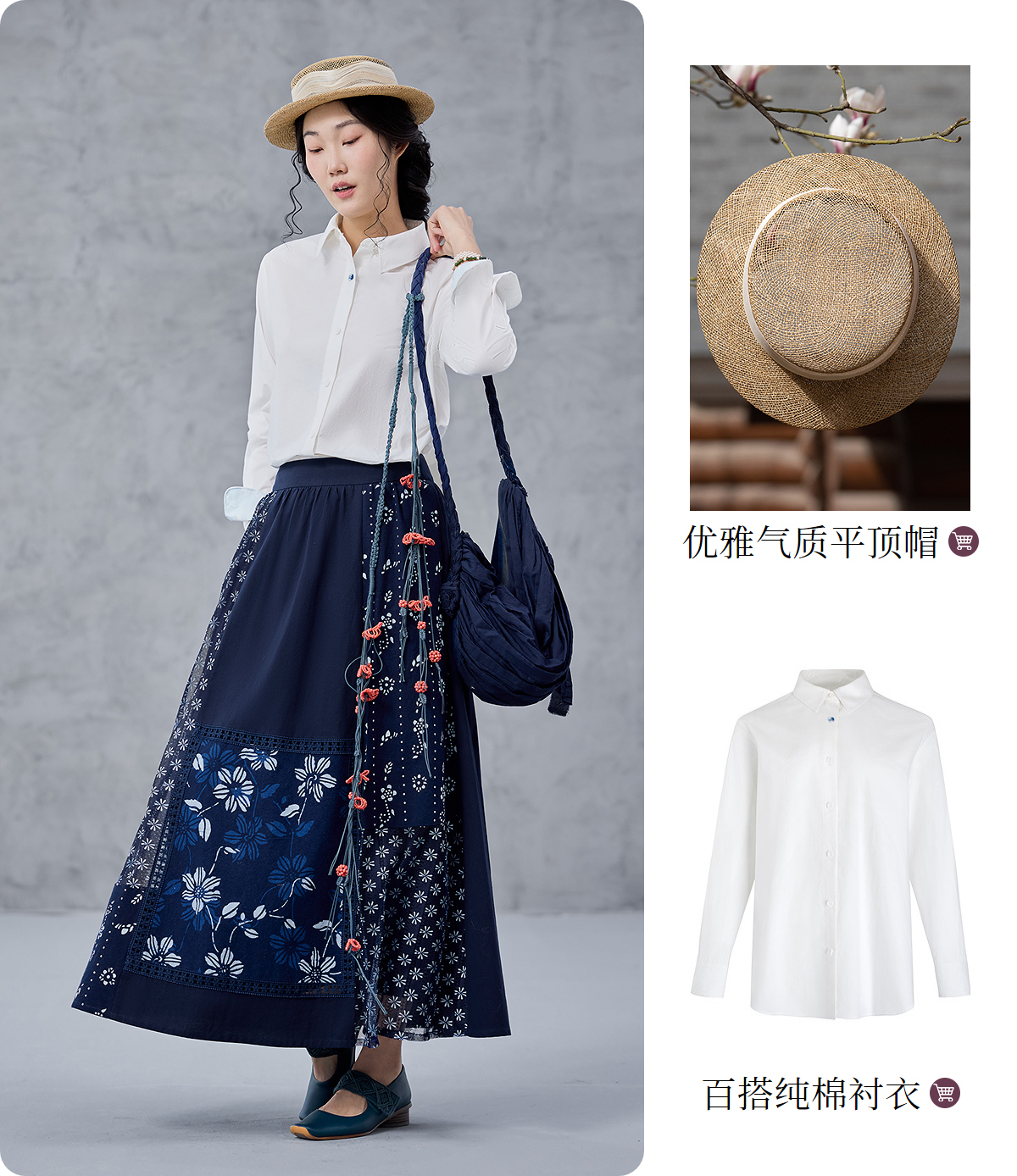 【林栖设计小店】(现货)纯棉半身裙蓝印花布铁线莲拼蕾丝花边复古2025春夏新品裙子女1952008