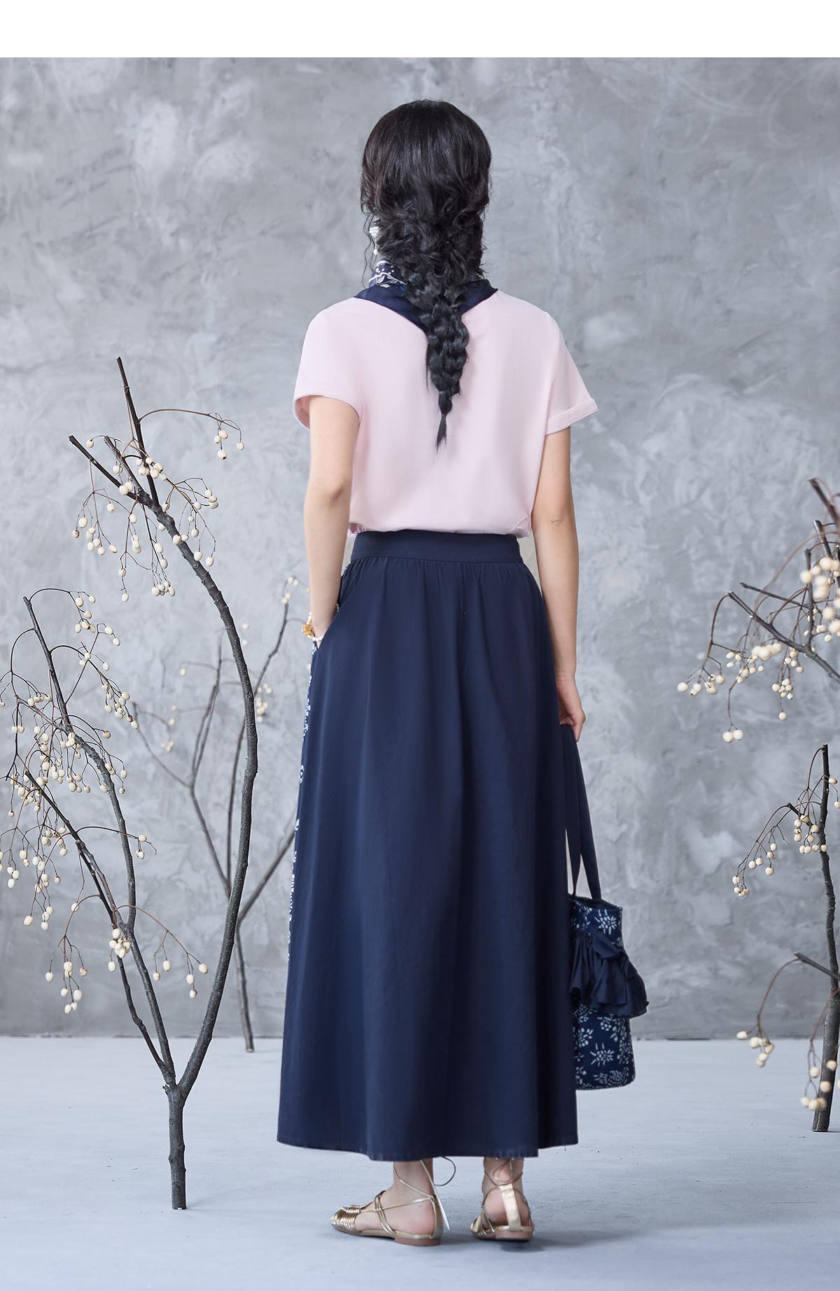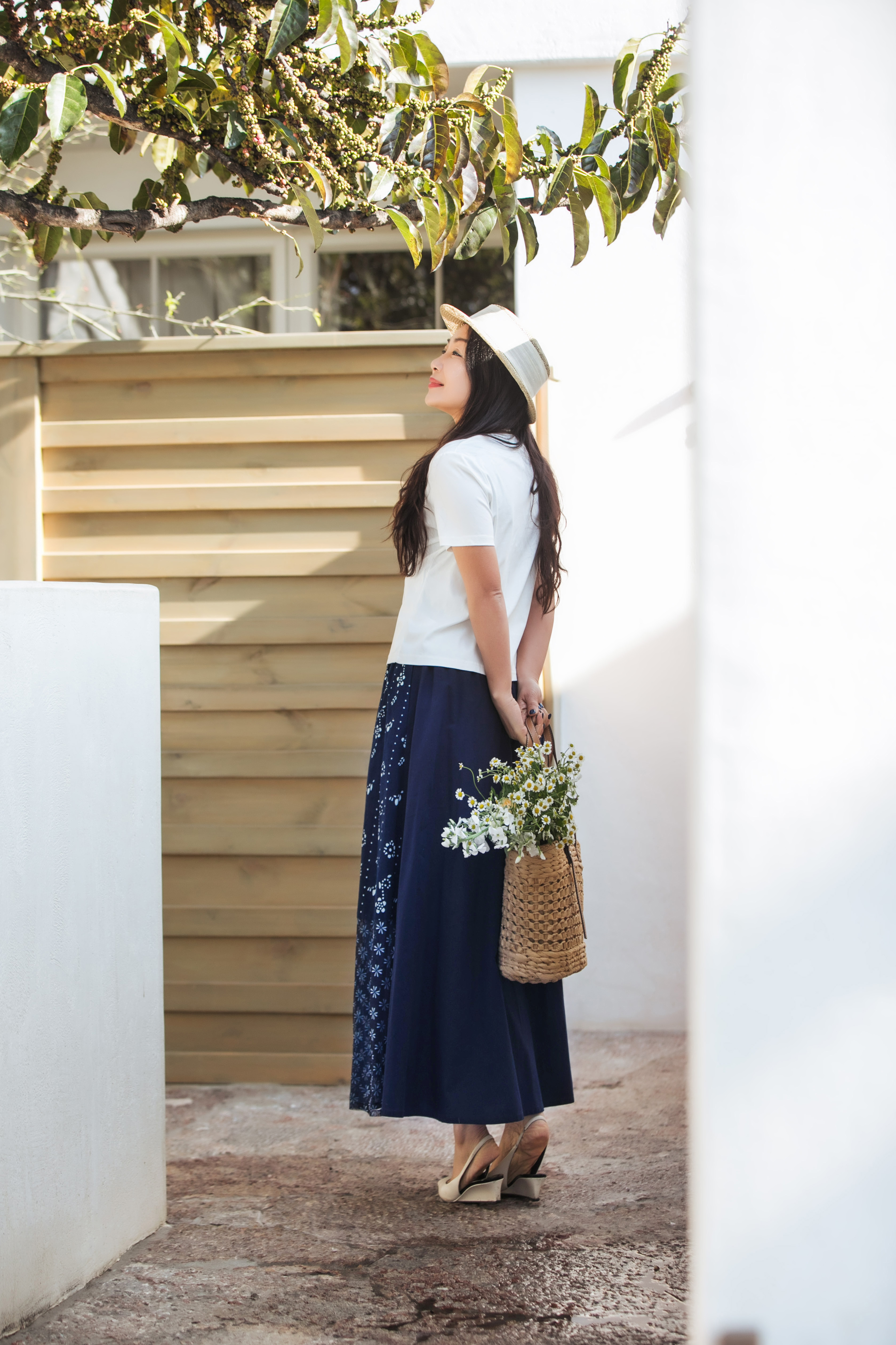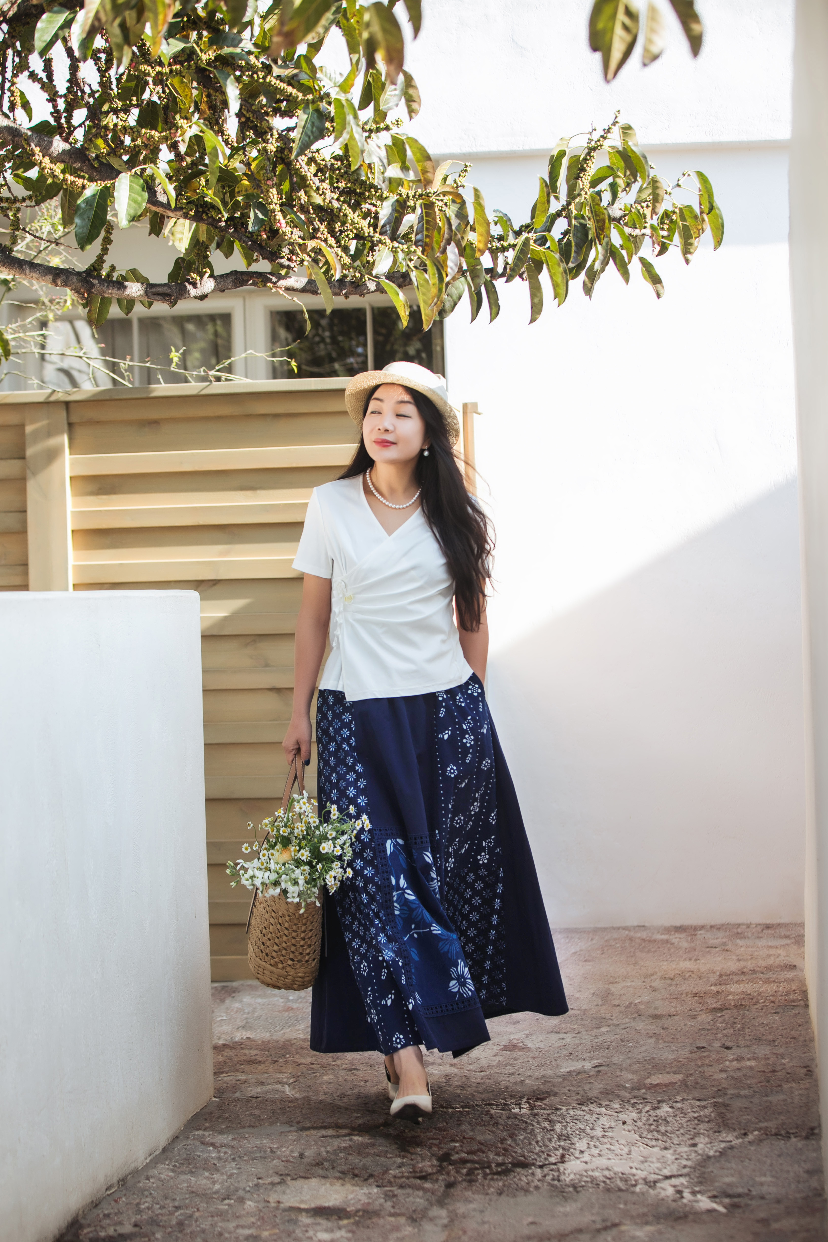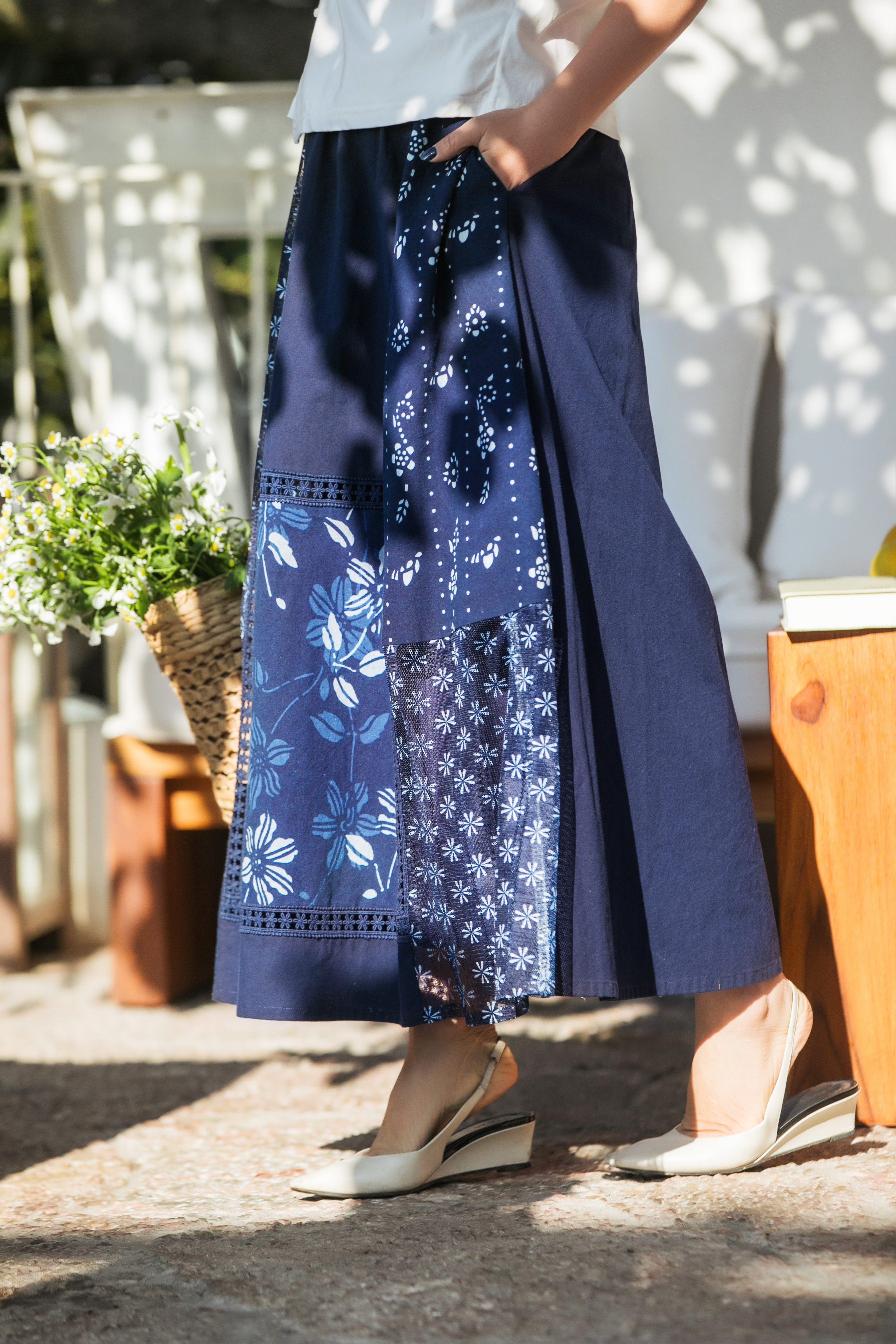 【林栖设计小店】(现货)纯棉半身裙蓝印花布铁线莲拼蕾丝花边复古2025春夏新品裙子女1952008
