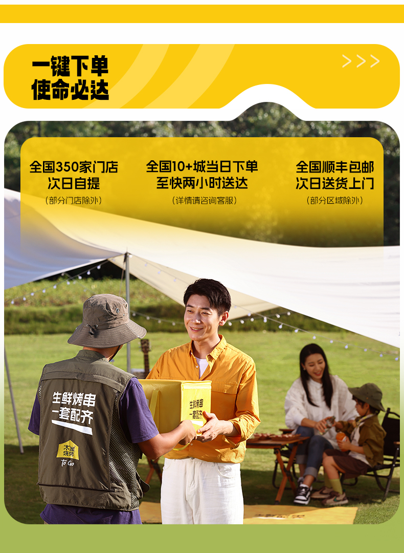 木屋烧烤半成品套装,一键下单,使命必达。 -全国300家门店支持次日到店自提 -全国顺丰包邮,当日下单,次日顺丰送货上门(部分区域除外,实际以顺丰时效为准)