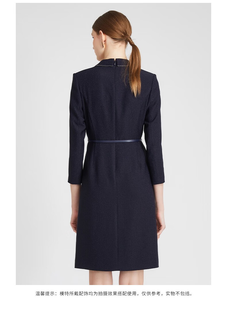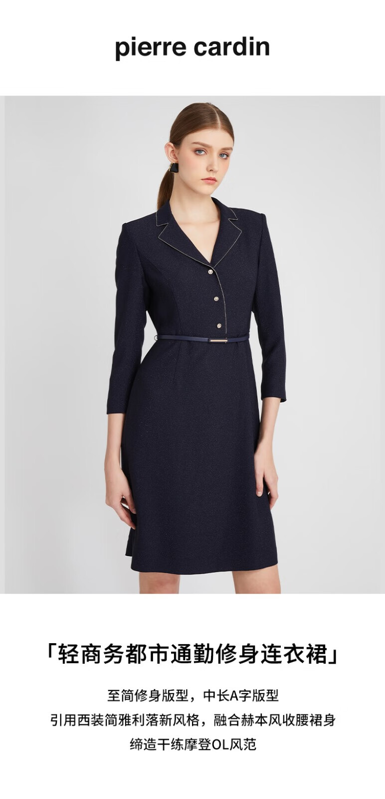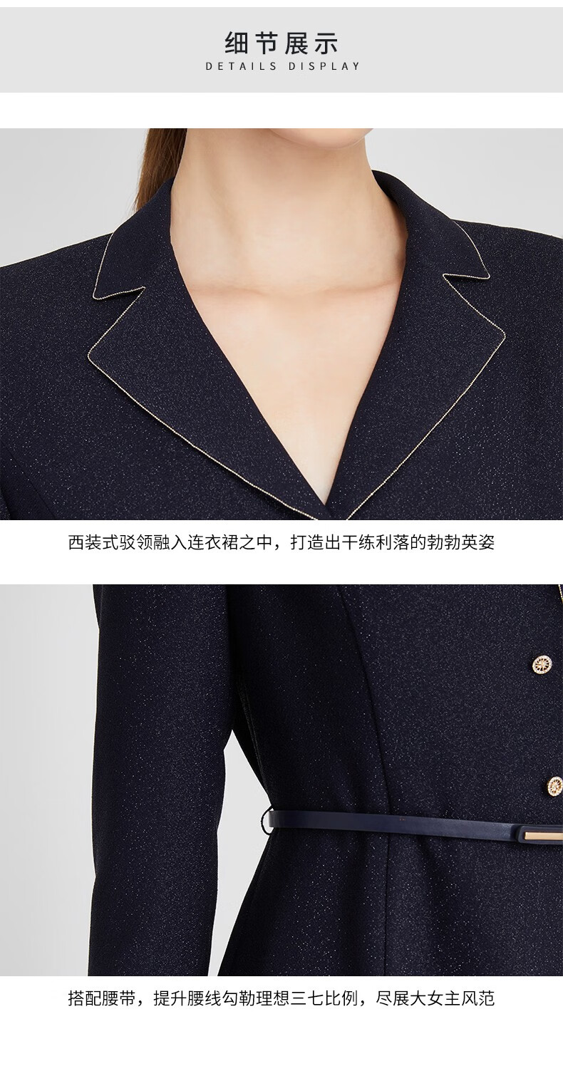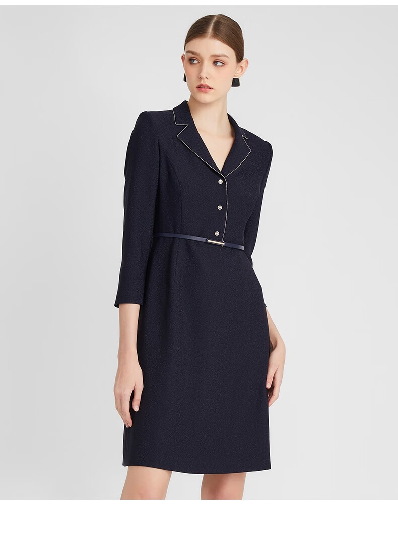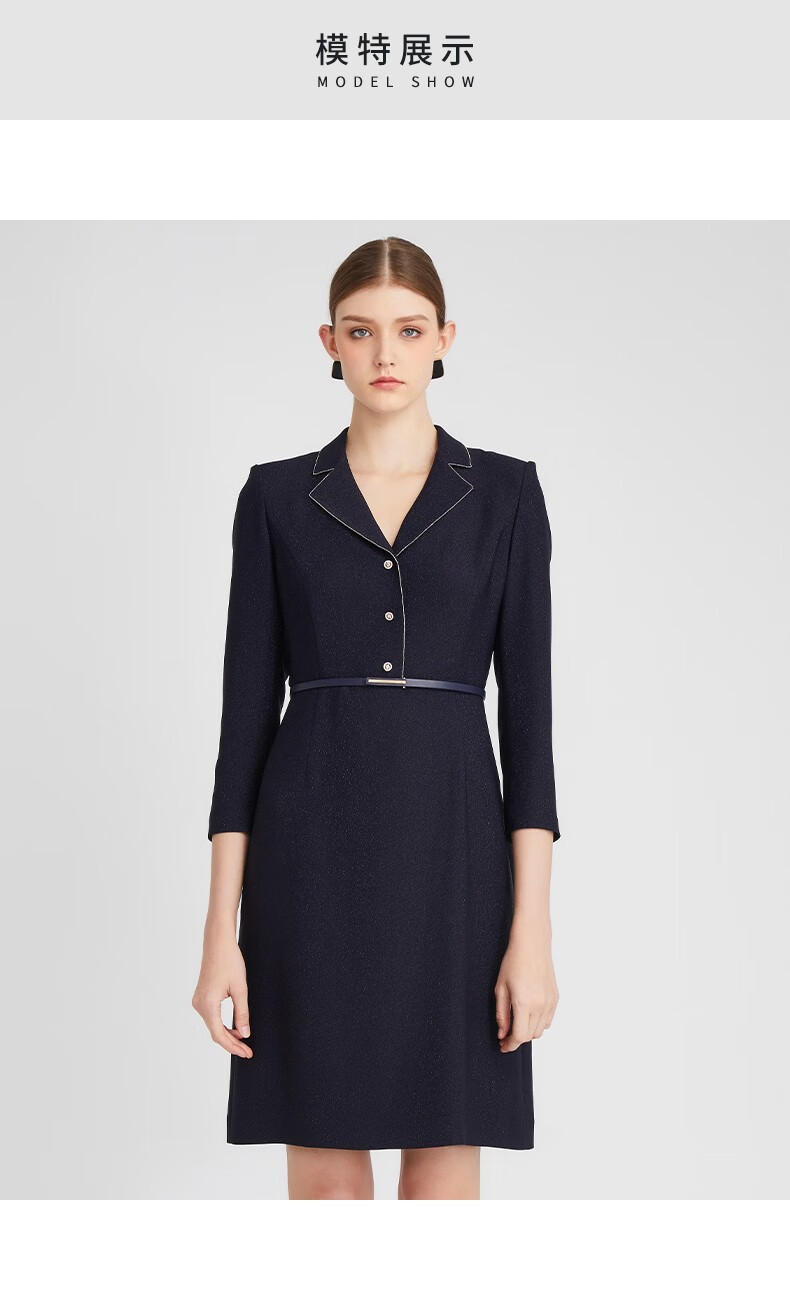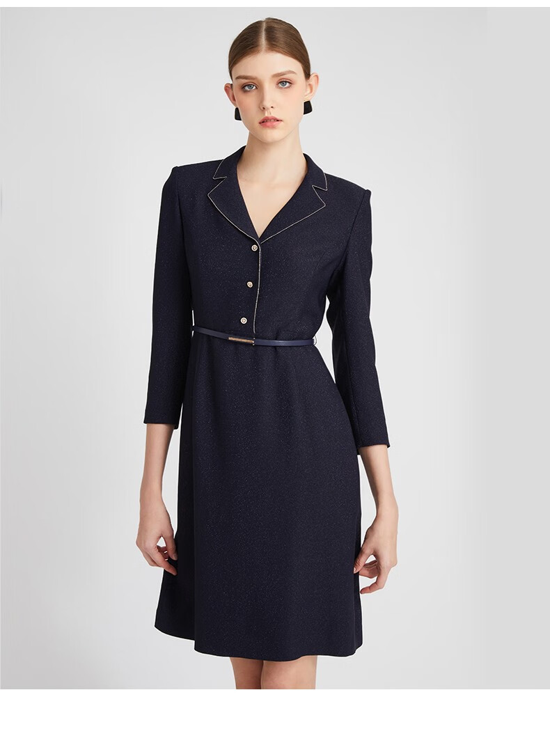 皮尔卡丹女装连衣裙藏蓝色西服领长袖春秋醋酸连衣裙P2302E2991N0