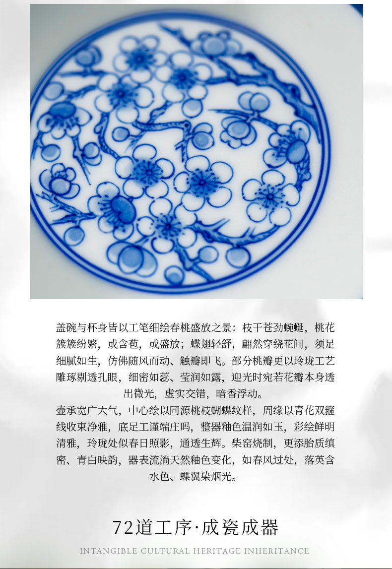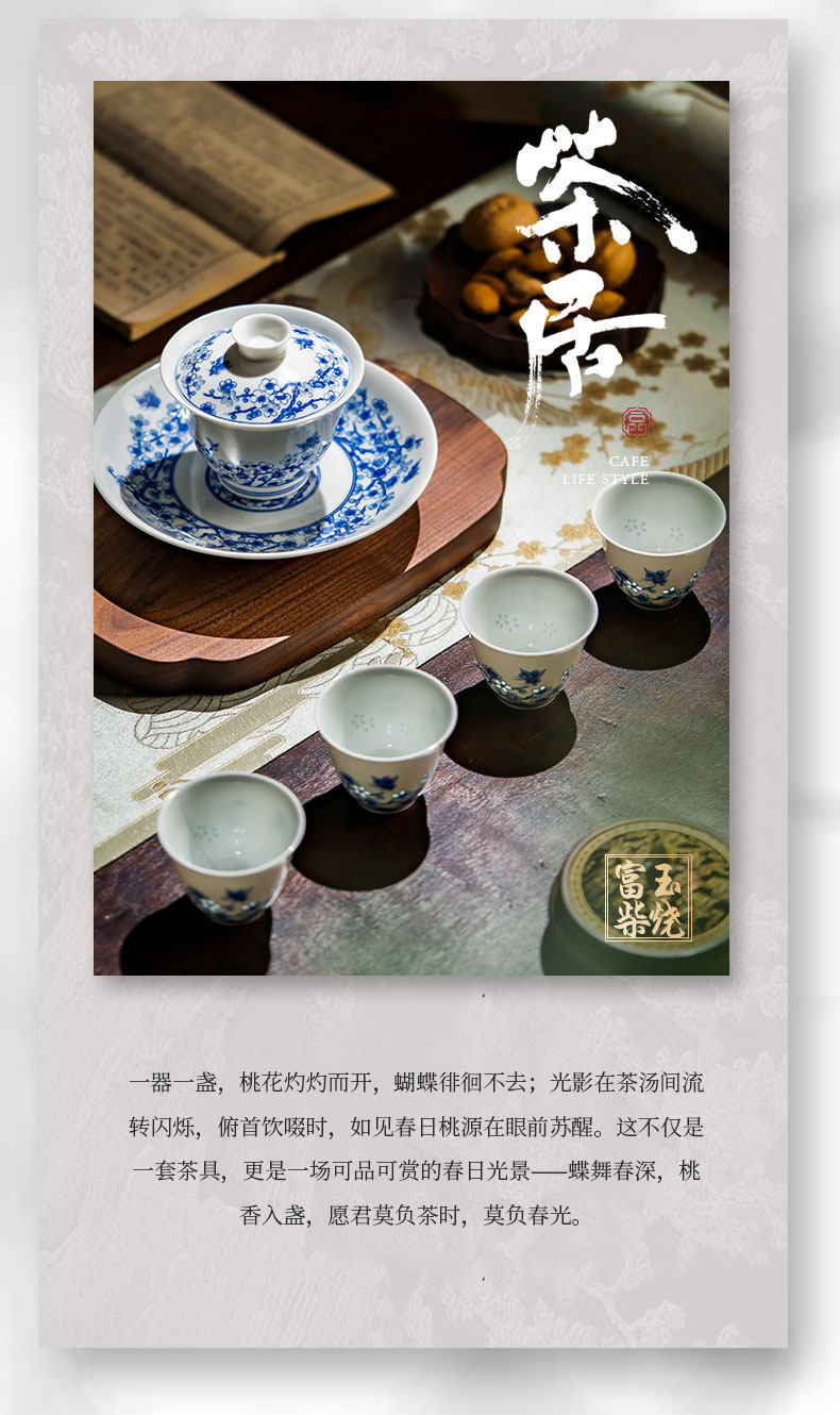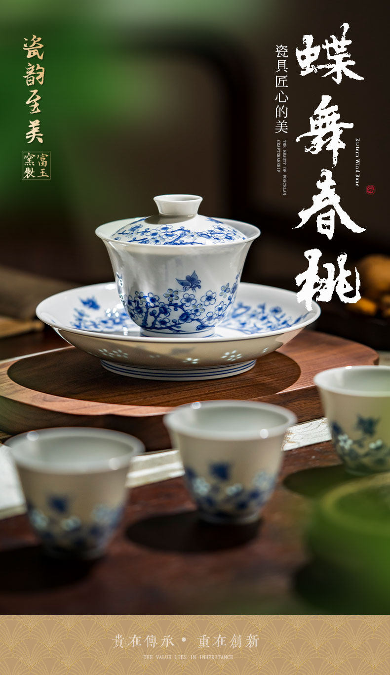 富玉窑 景德镇青花玲珑蝶舞春桃盖碗茶杯主人杯高档功夫泡茶具套装
