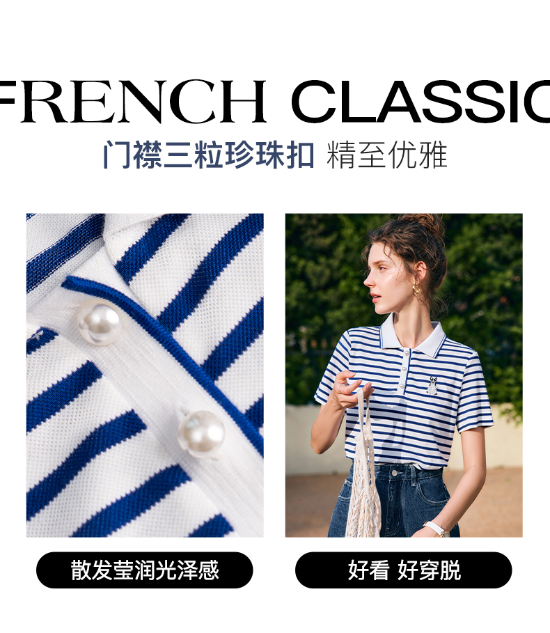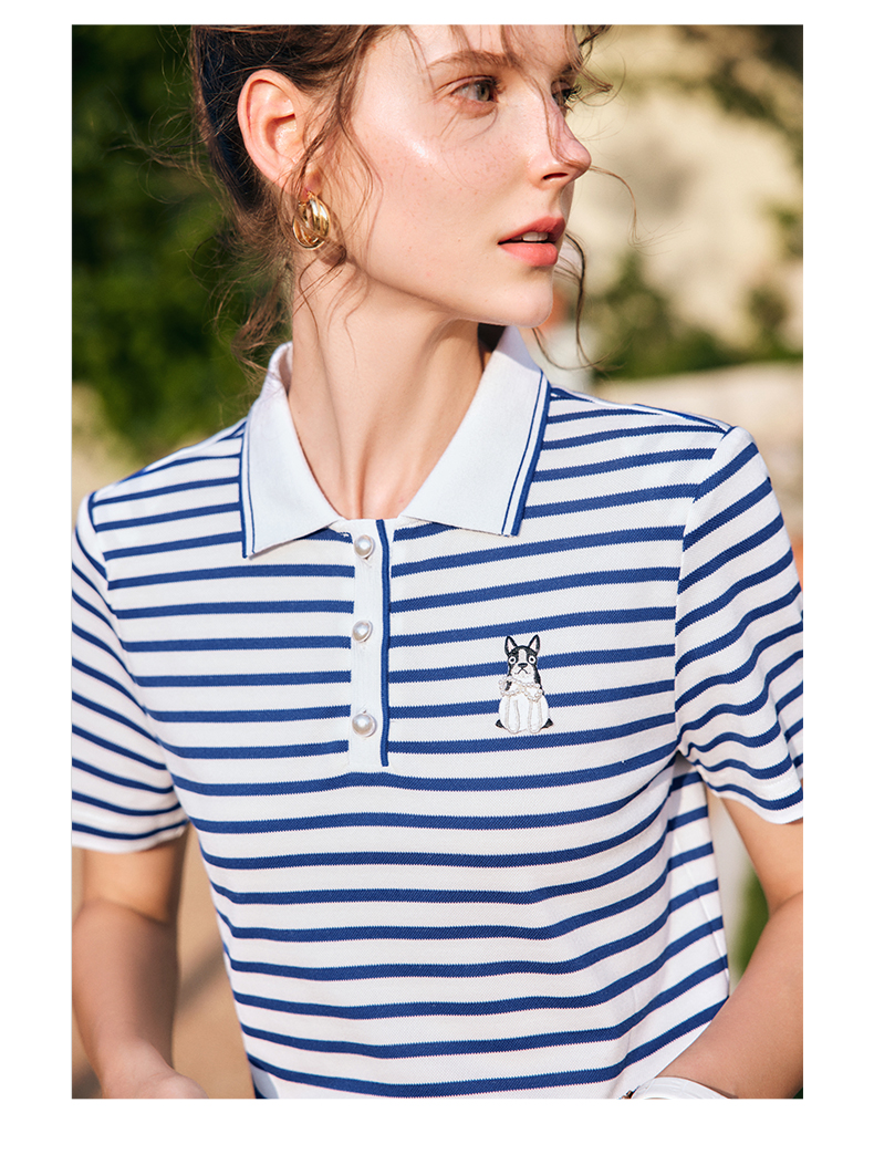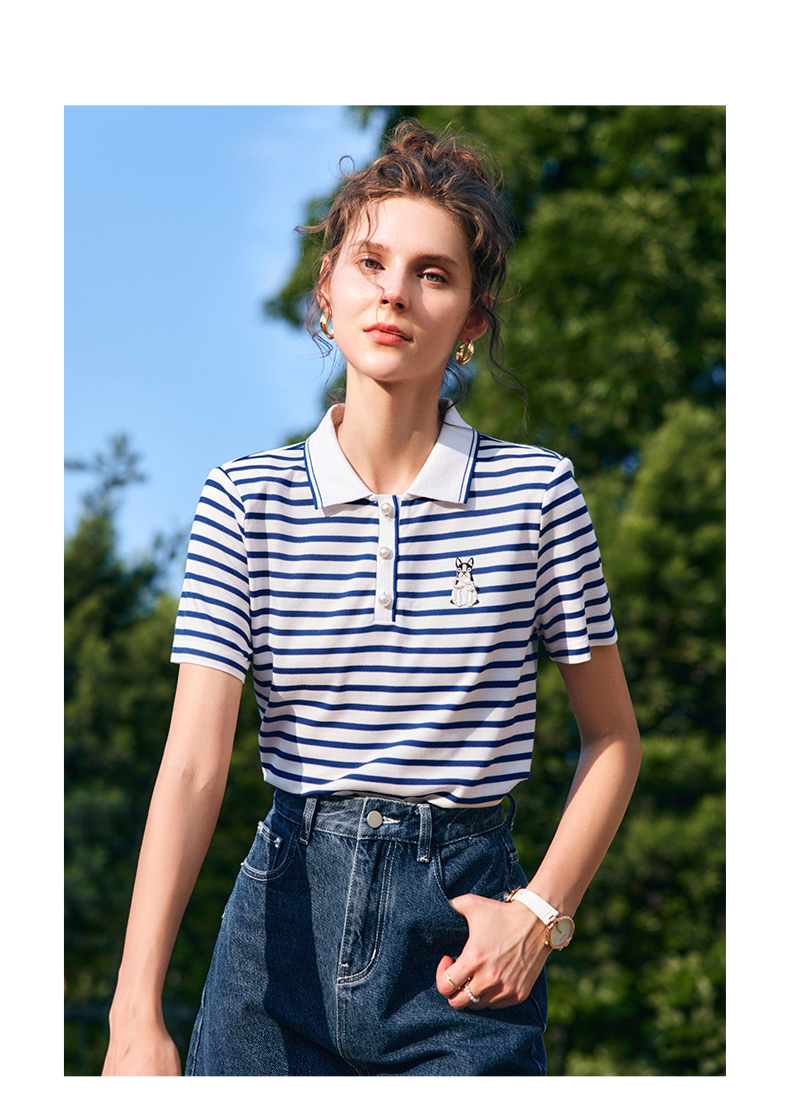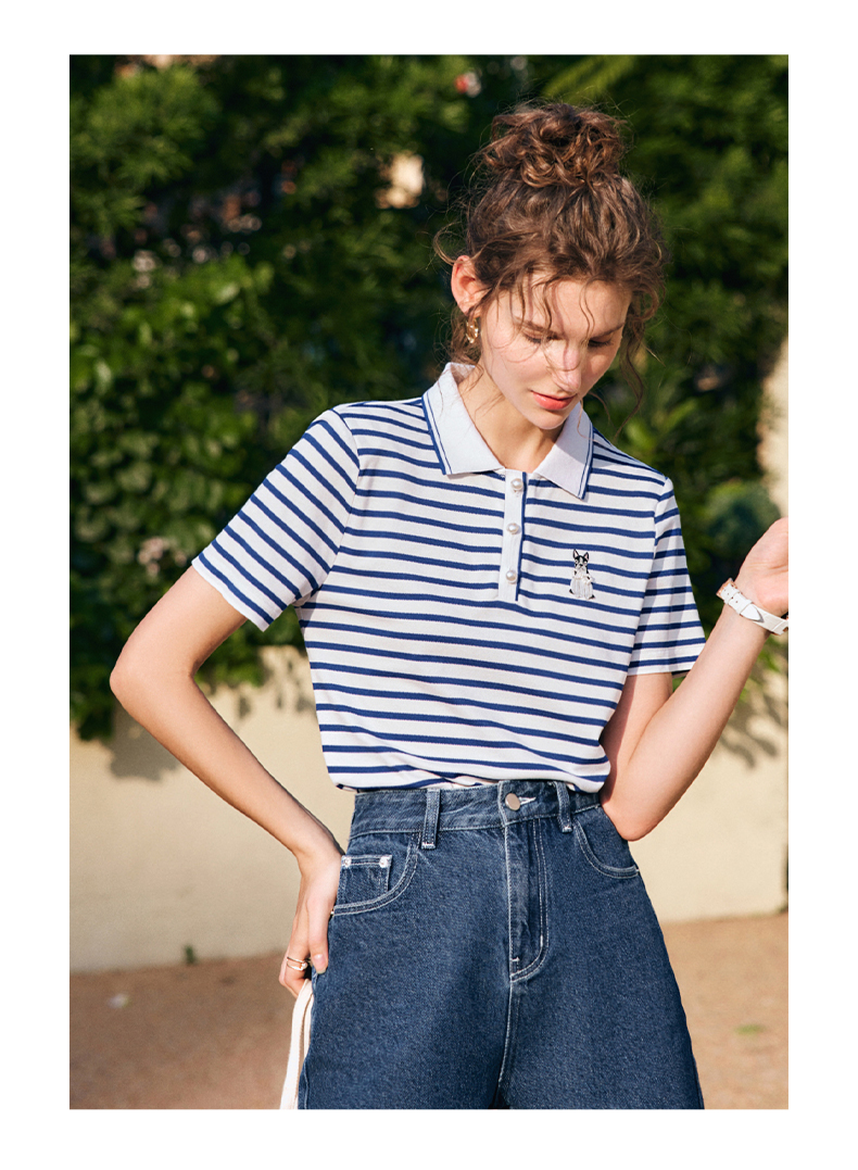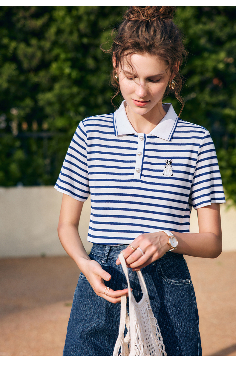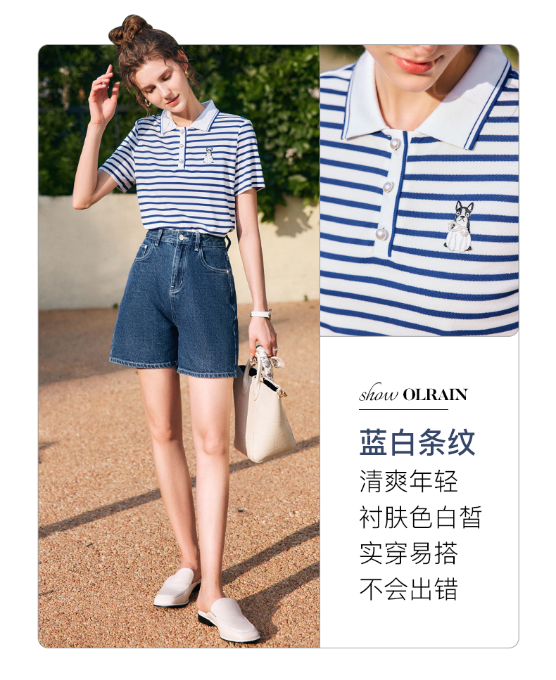 OLrain欧芮儿法式polo领条纹T恤女夏季2025年新款刺绣海军风上衣