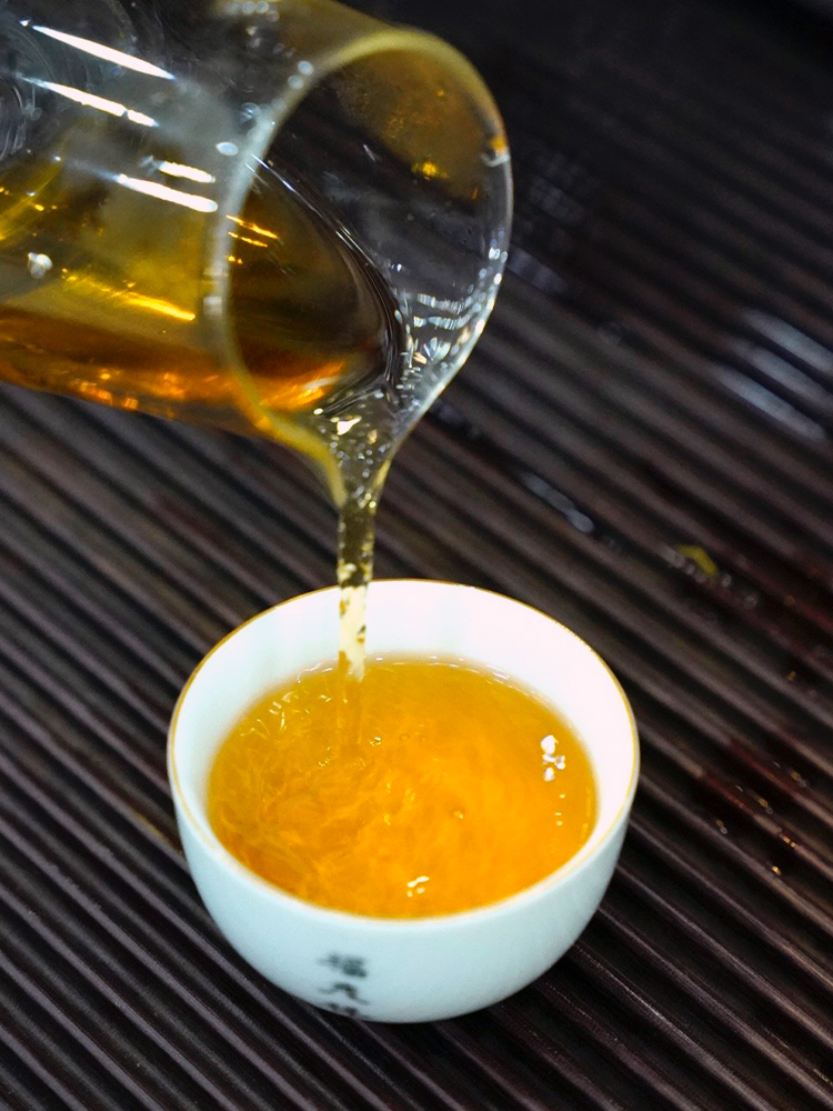 洗茶一泡,一出汤这个香气就出来了,这个时候闻公道杯的杯底也是香的,口感醇厚滑爽,齿颊留香,回甘无穷。轻含入口,滋味浓厚,轻咽入喉,滑爽怡然。既有暖暖的阳光味,又有浓浓甜香味。十三泡后,依旧纯爽回甘,很是好喝。