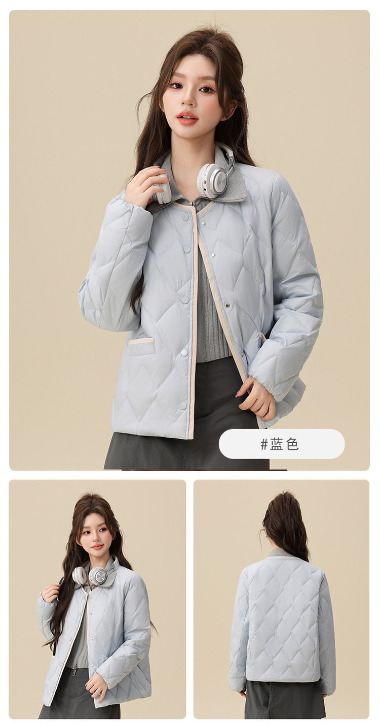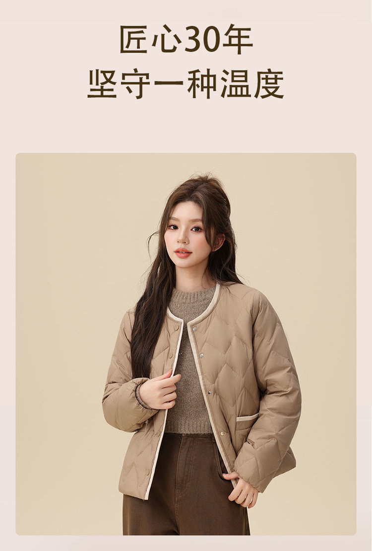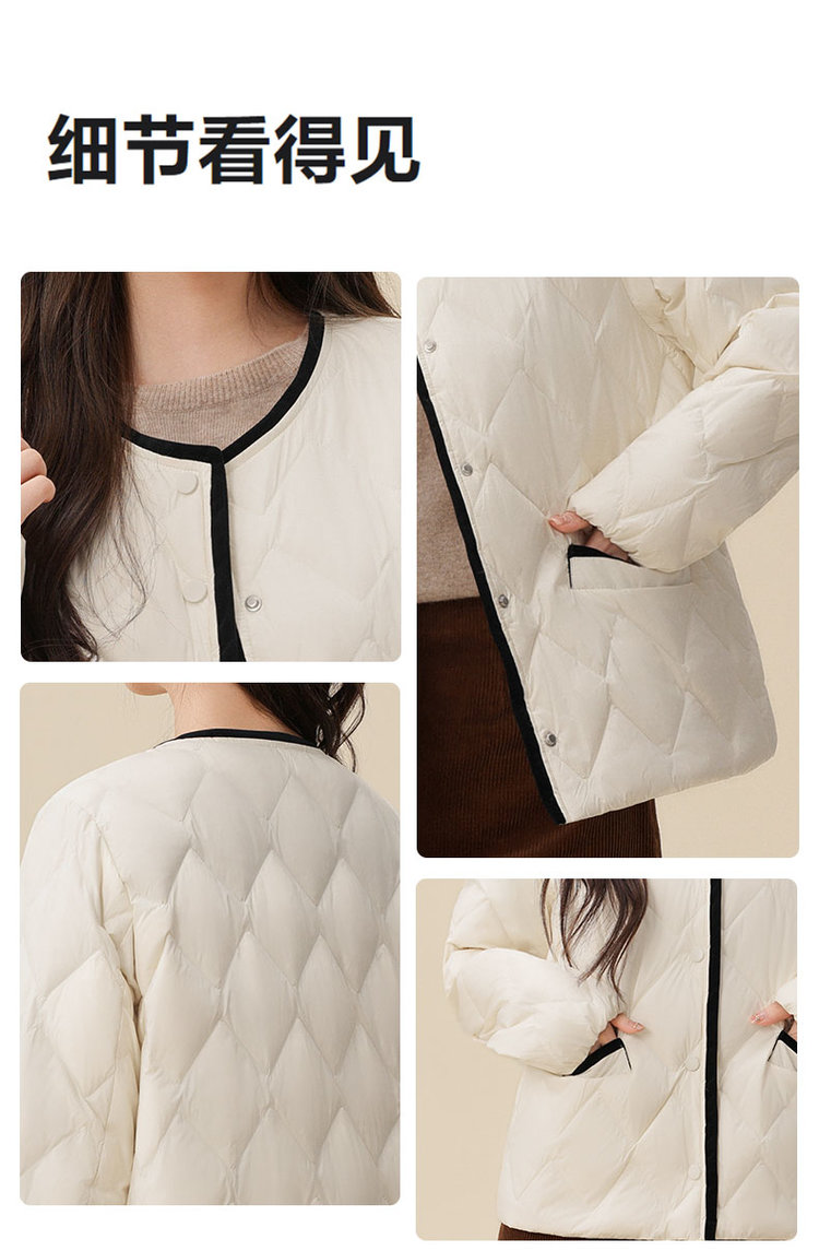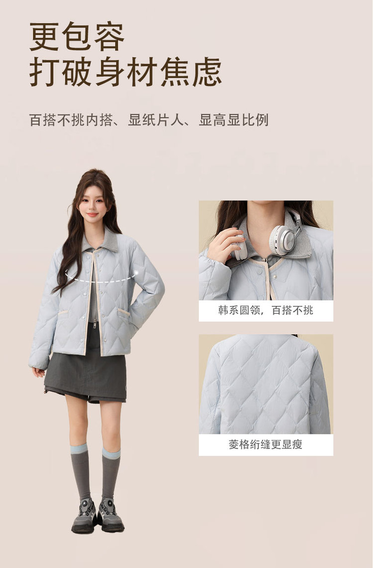 ✅ 轻量化,通勤/旅行随身带,折叠后的体积小。✅ 保暖性:600+蓬松度白鸭绒,采用新国标90绒,北方初冬,深冬可以搭配大衣,南方一件过冬。✅韩系设计,圆领设计简单大气又不失俏皮,多种场所随意搭配,菱格设计不显臃肿的“纸片人”效果。✅冬季出门百搭神器,搭配短裙+长靴=韩剧女主出街,搭配长裙+小皮鞋/小白鞋=小说白月光回归,甚至可以搭配长裤+高领内搭=都市丽人的日常穿搭