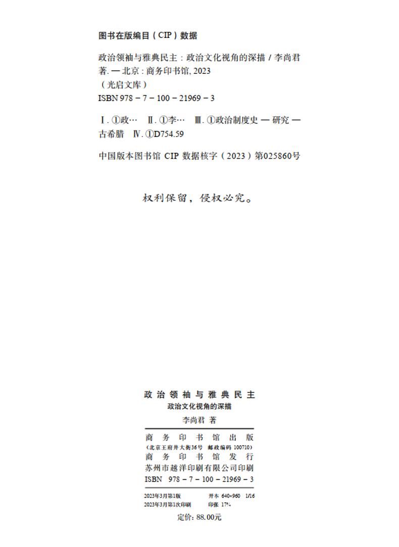 1. 本书采用历时性考察方式,以政治领袖在雅典民主制度中的特殊身份为切入点,从政治文化视角,综合社会经济、政治制度、表演文化、社会观念及意识形态等问题,考察雅典民主制语境中的政治领袖获取政治地位、从事政治活动、发挥领导权威的途径与方式,深入阐释雅典民主政治领导权的特征和性质。2. 本书逻辑清晰,以小见大,阐释清楚,从具体事件出发,阐释雅典政治领袖面临的不同困境,读者读后对于雅典民主政治可有较为深入的理解。3. 本书是“光启青年”系列的第一本,本系列收录青年学者的优秀著作,本书即为此系列首发。