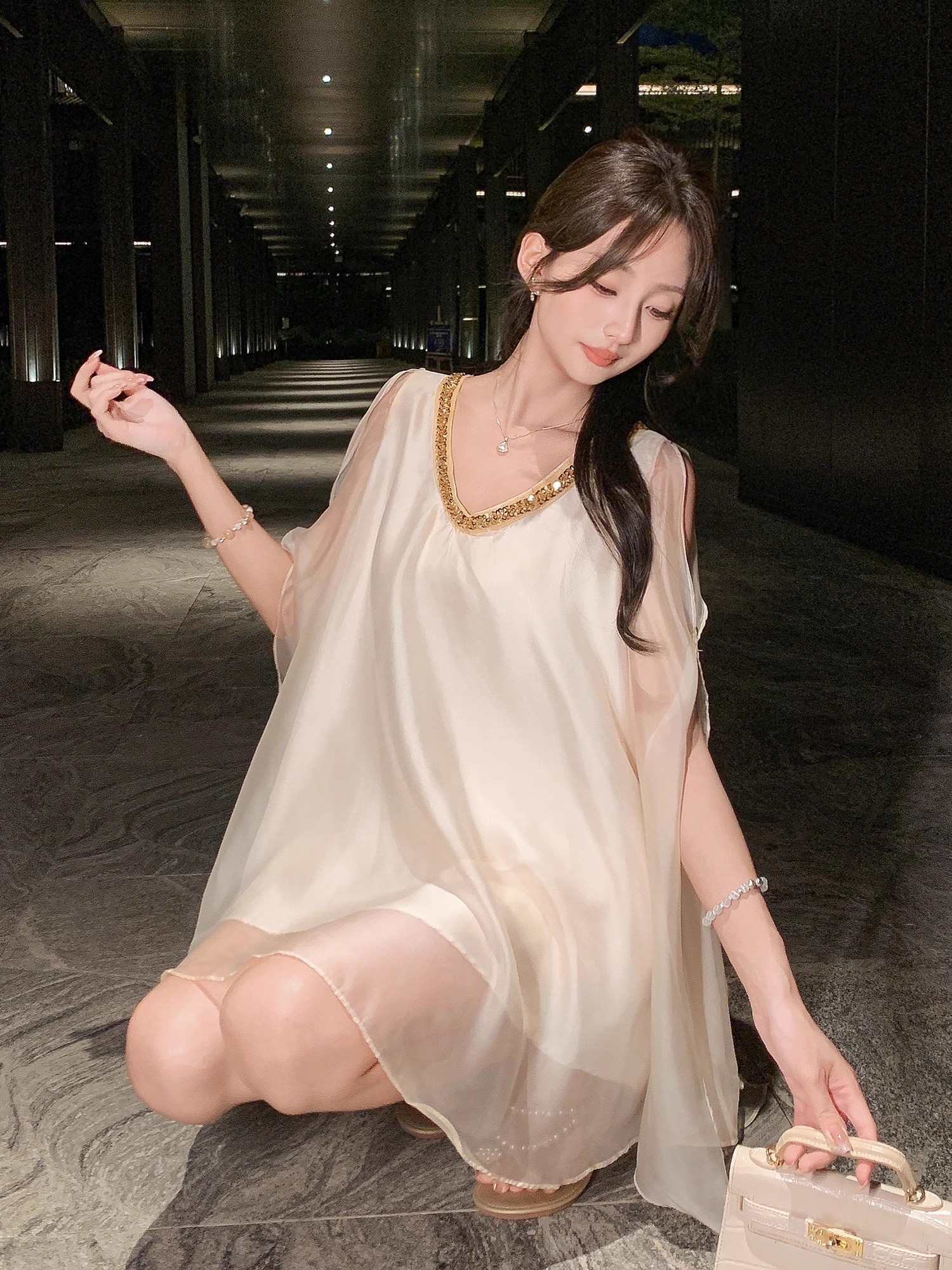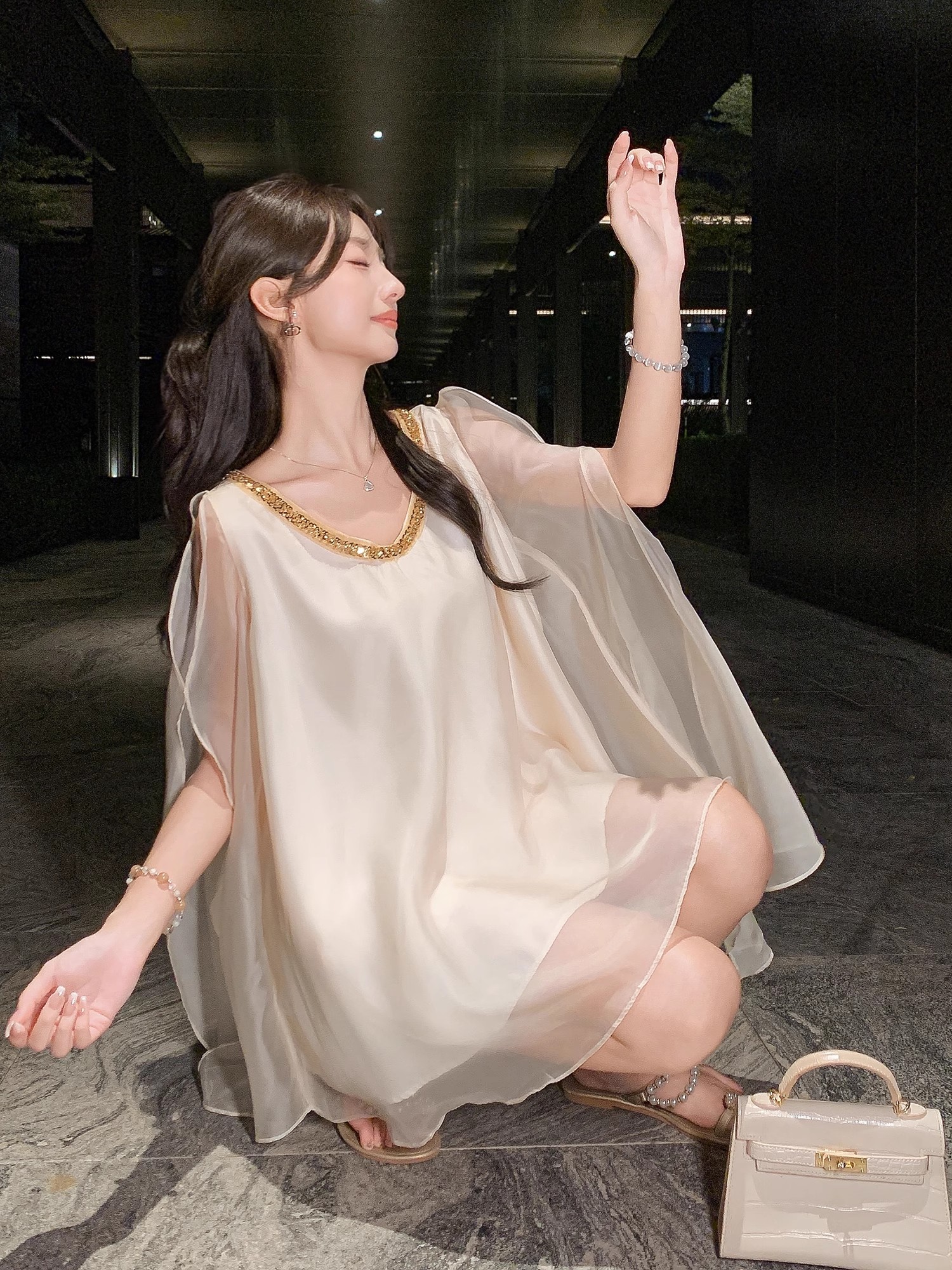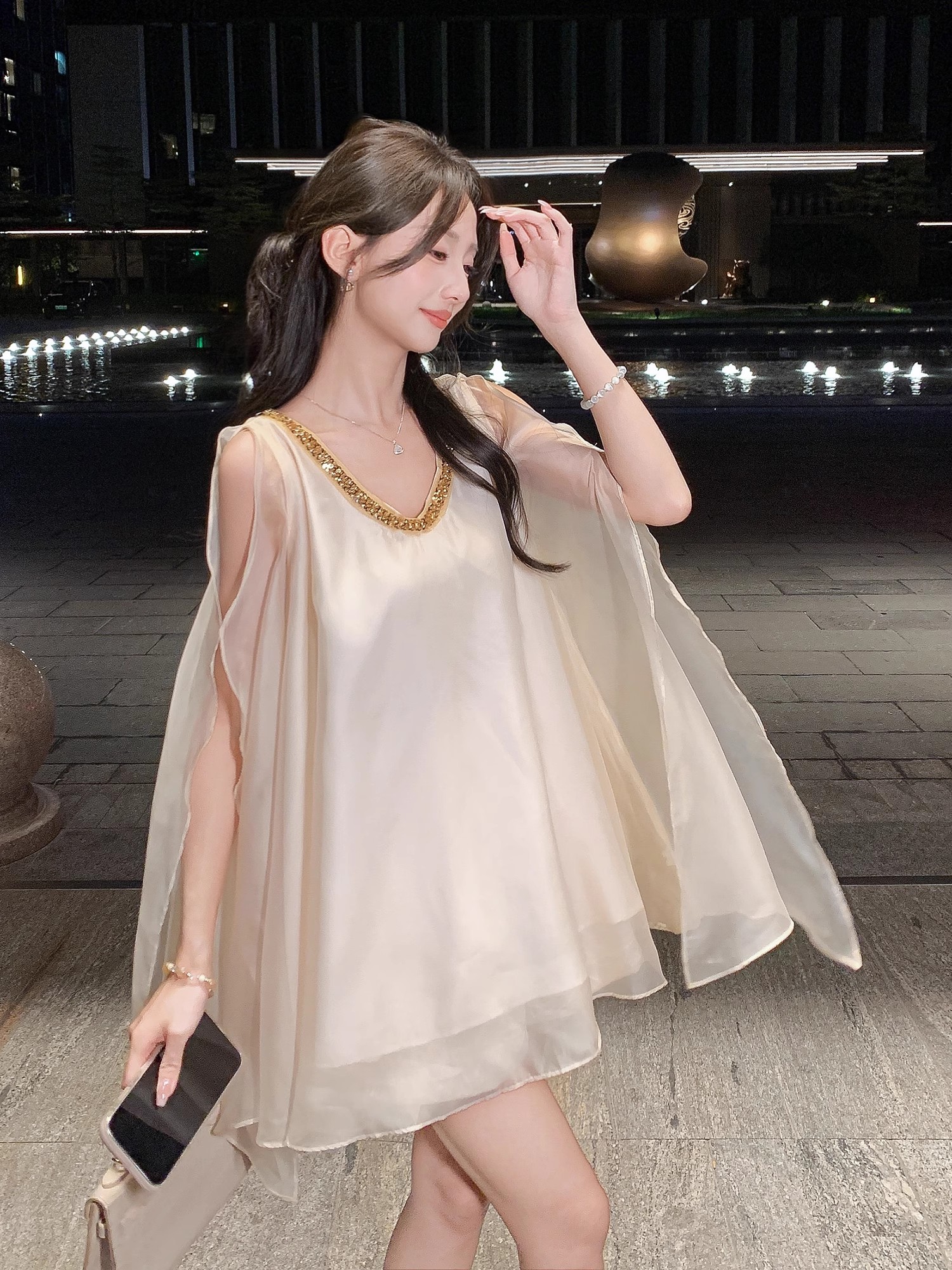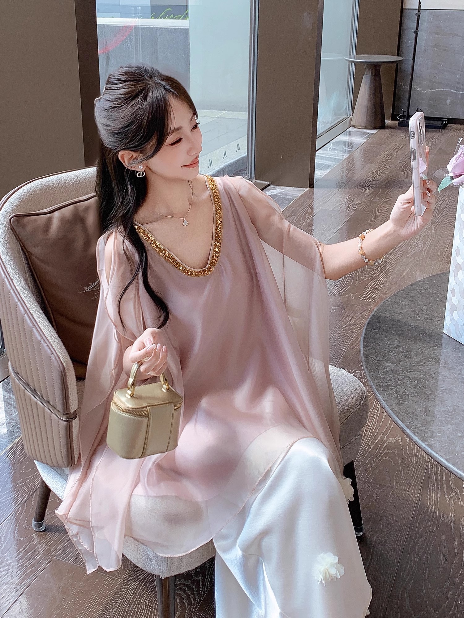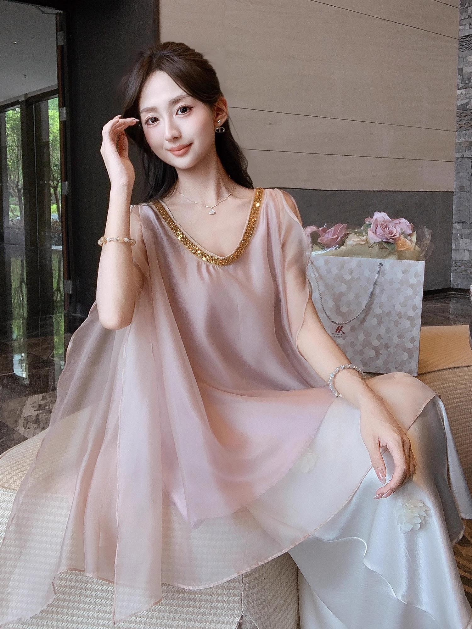 张心子【云织美学】V领宽松显瘦缎面上衣 U2506009