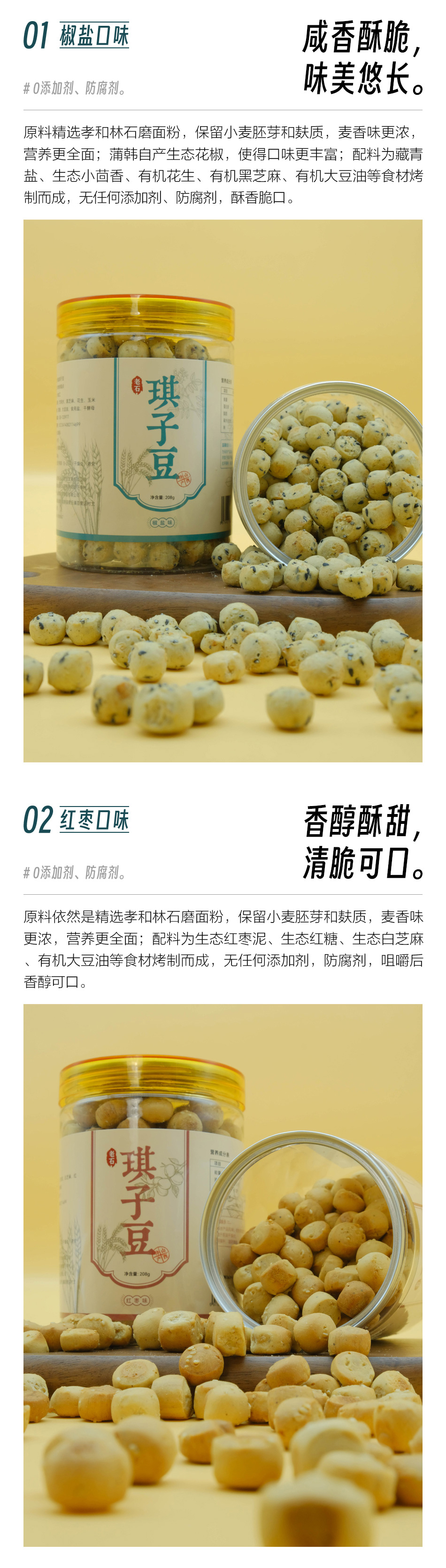 【口味】:椒盐味、红枣味 【配料】: 椒盐味:生态面粉、生态玉米面、有机花生、有机黑芝麻、有机大豆油、有机白砂糖、生态茴香、生态花椒面、干酵母、饮用水、藏青盐(无碘无抗凝结剂) 红枣味:生态面粉、生态红枣泥、生态白芝麻、生态红糖、有机大豆油、干酵母、饮用水、藏青盐(无碘无抗凝结剂) 【产地】:山西省运城市永济市韩阳镇下寺村 【净含量】:180g/罐 【保质期】:6个月 【储存方式】:置于阴凉(5-25℃)干燥处,避免阳光直射