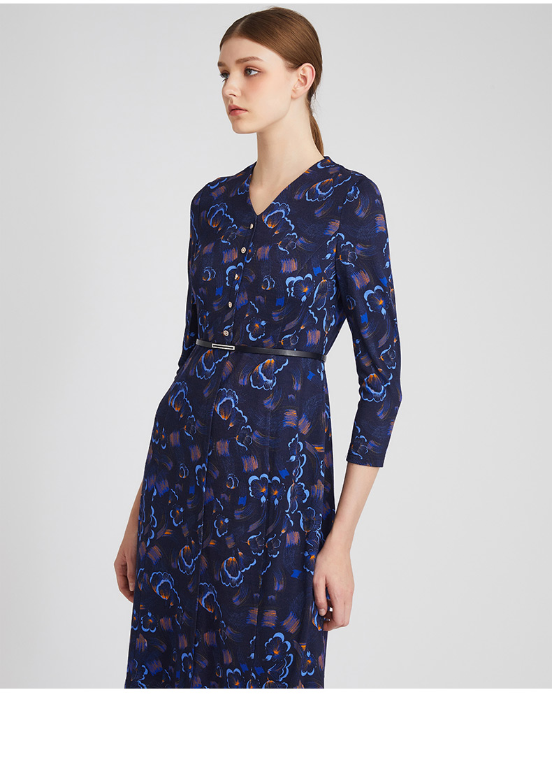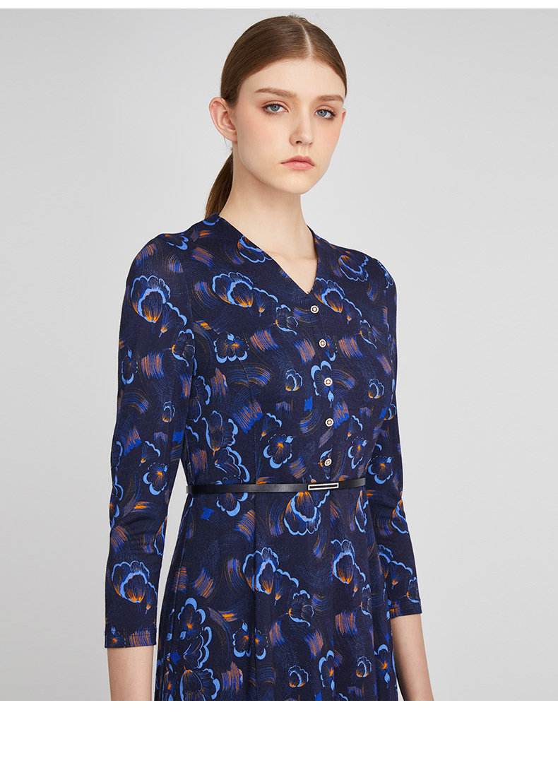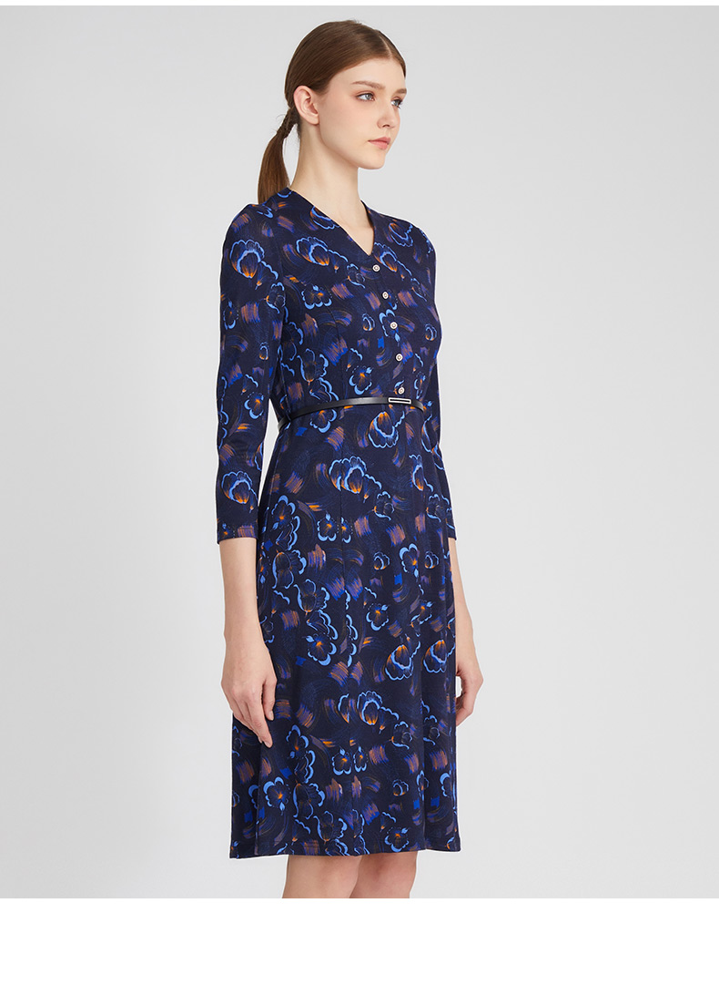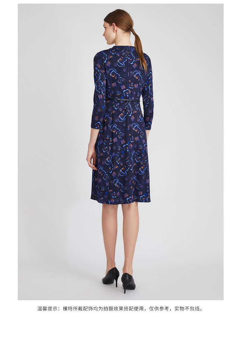 皮尔卡丹女装春季新款蓝色时尚圆领连衣裙知性女裙P01DL24N0