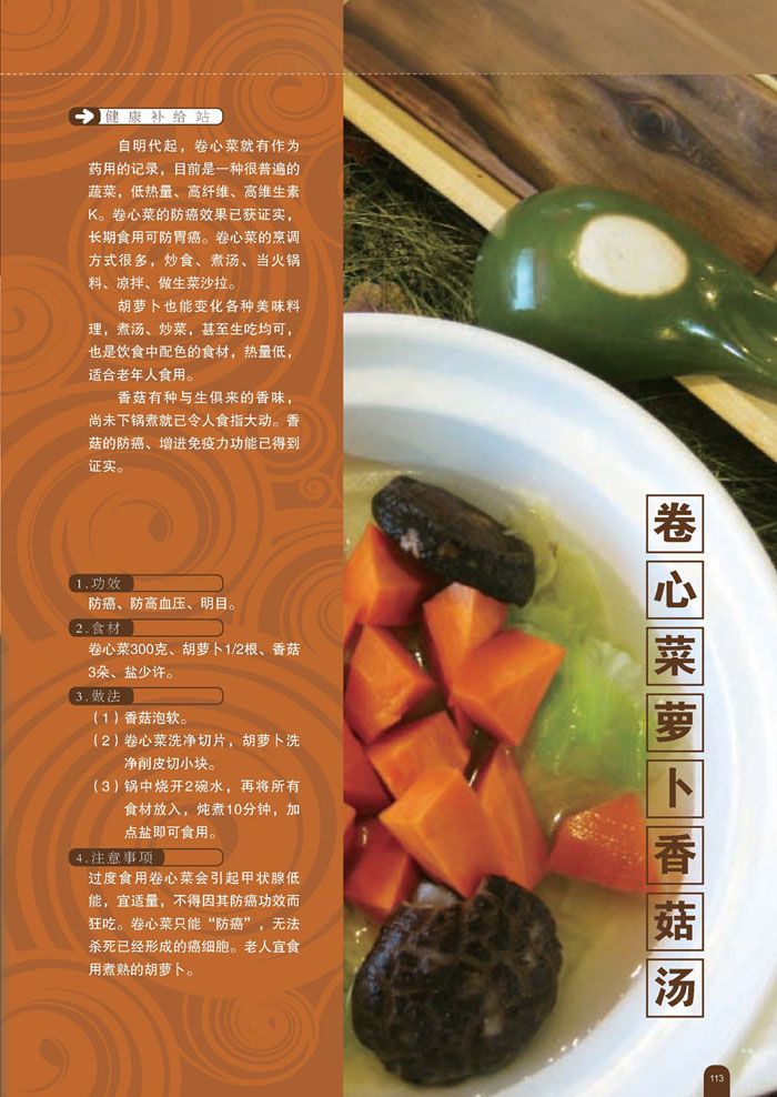 本书教大家做养生汤,在每篇文章中,用*通俗的语言详述健康概念,不需要医学背景,就能清楚明白,了解自己到底“为什么要补”“补什么”。“补得正确”,*比“补得多”可贵;食疗的副作用极小,甚至无副作用。即使短时间内看不到明显的效果,对身体也不会有害处。读者更需建立一个概念,补身固然很好,但过与不及都不健康,没有一种食物可以无节制地食用,更不应拒吃某些食物,才能达到各类营养均衡。