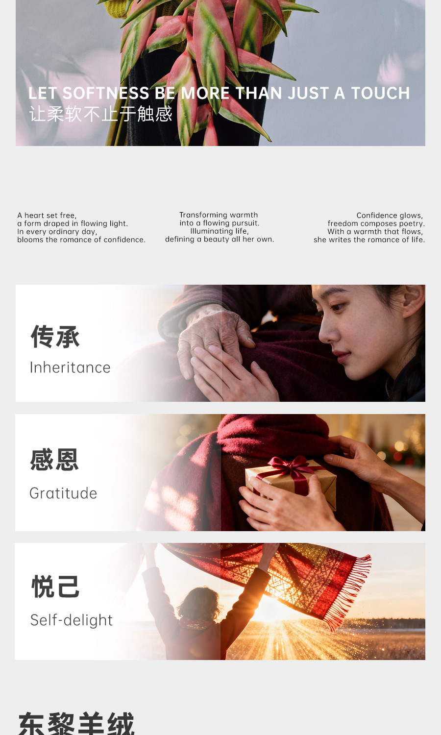 东黎羊绒是赤峰东荣集团自主品牌,自有牧场/羊绒制品全产业链优势,实现了羊绒从“牧场”到“商场”的华丽转变。