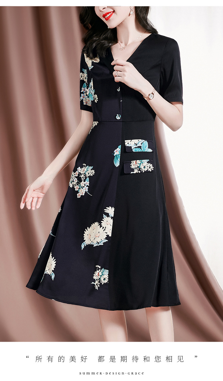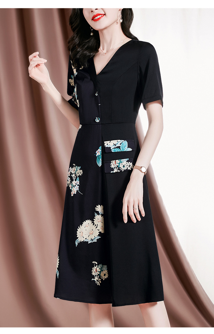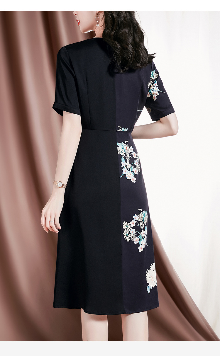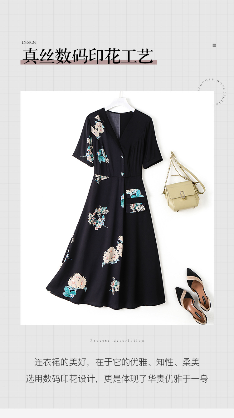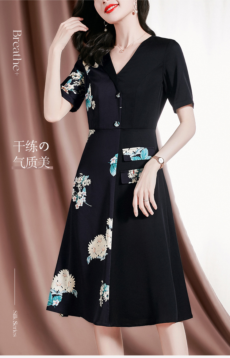 新款桑蚕丝印花优雅V领短袖女士连衣裙SM-82297329