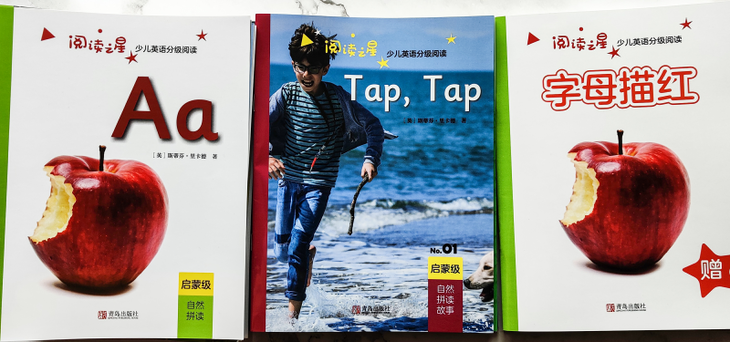 启蒙级中,包括26册字母拼读学习,短元音练习书,8册自然拼读故事书,随机字母描红本,字母挂图