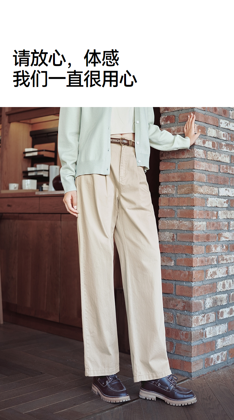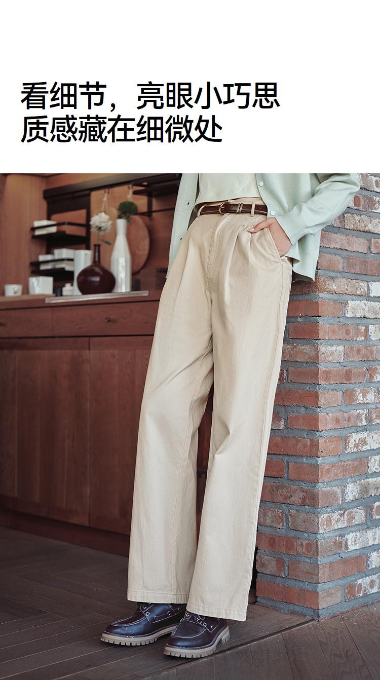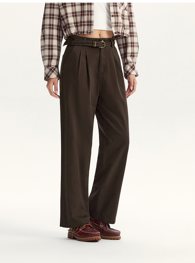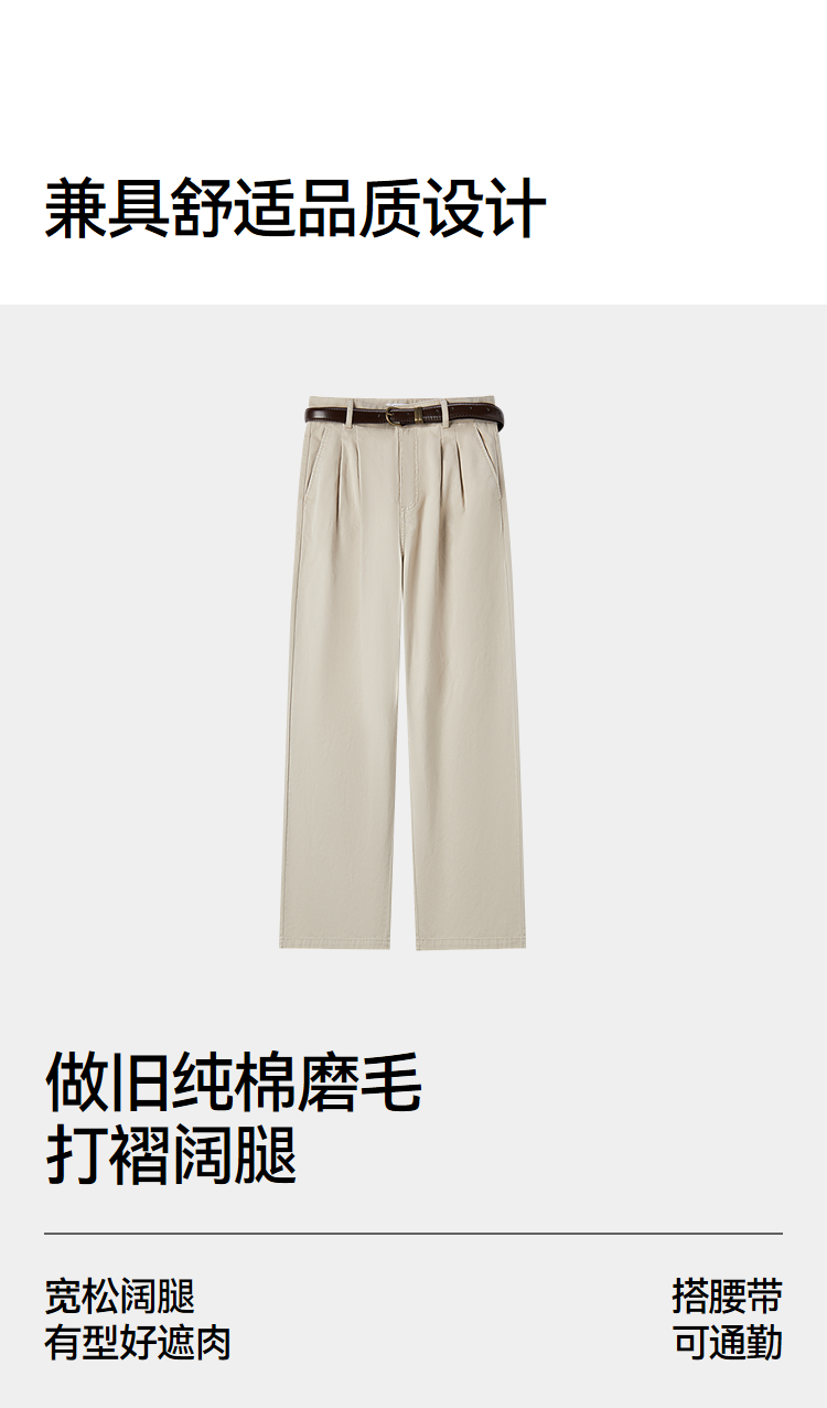 森马休闲裤女做旧宽松阔腿裤简约通勤秋磨毛纯棉打褶长裤腰带百搭