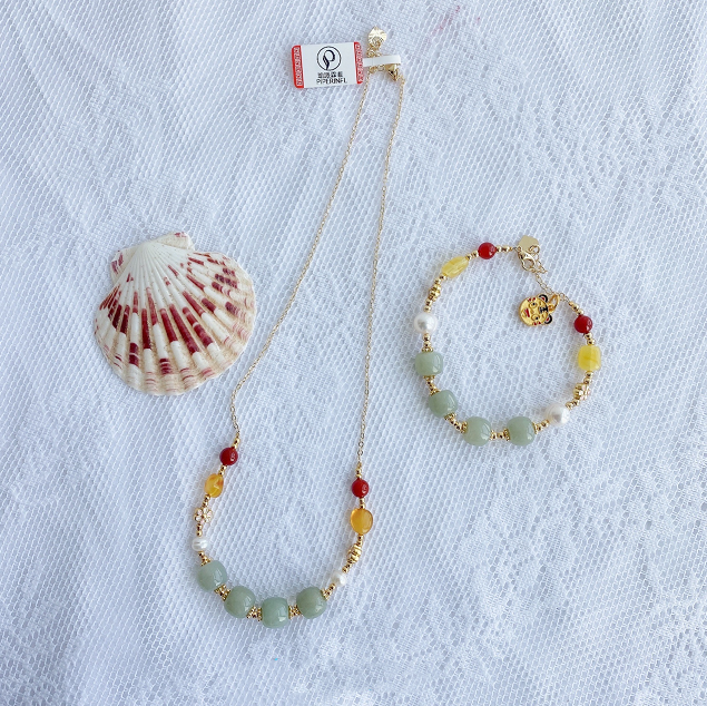 2:质感温润,色泽光亮,高级感满满,设计上时髦前卫,玉石的绿色,玛瑙的红色,珍珠的白色,组合在一起非常协调,清新气质款