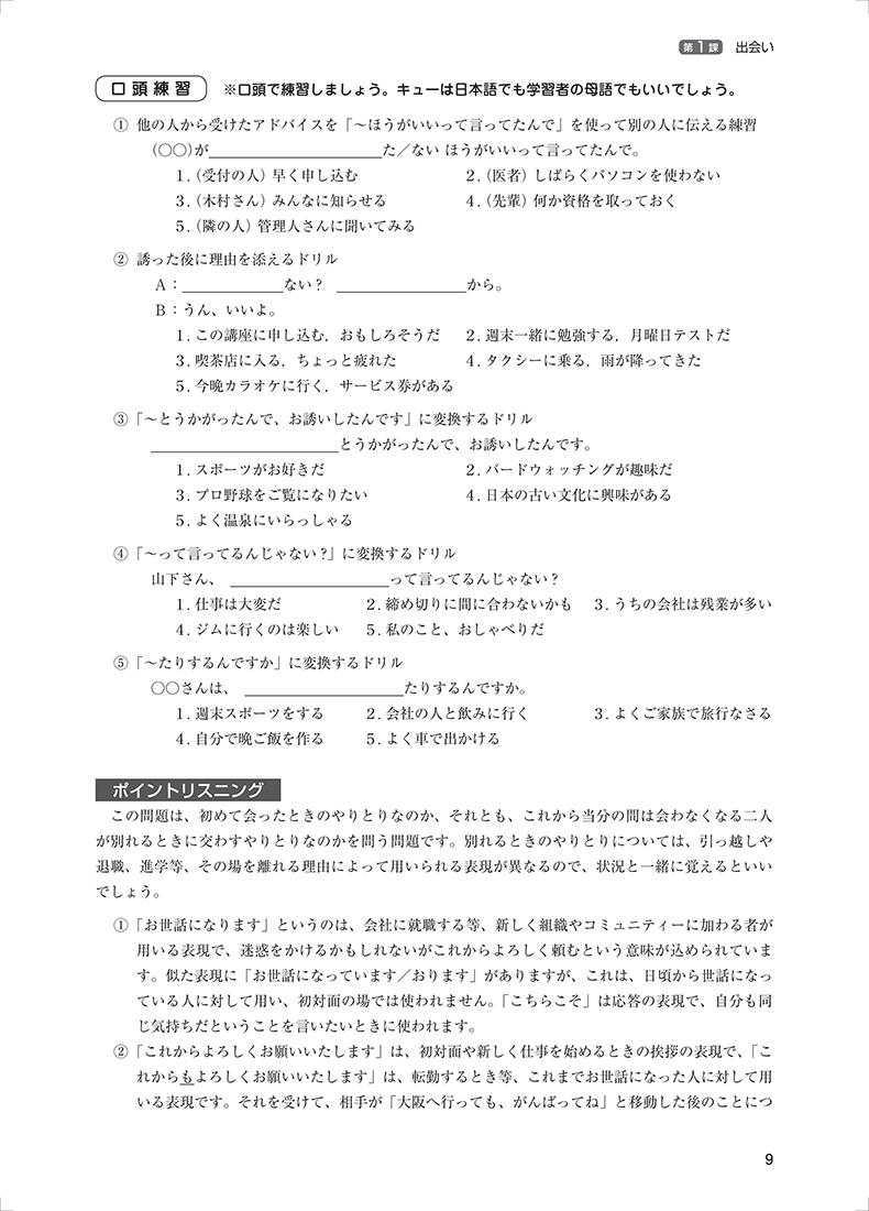 本书为主教材的学习辅导用书,共10课,全日文,就主教材每课的学习内容、听力练习注意要点、重要表达方式、重点词汇等进行学习指导,还配有一定的练习题目。