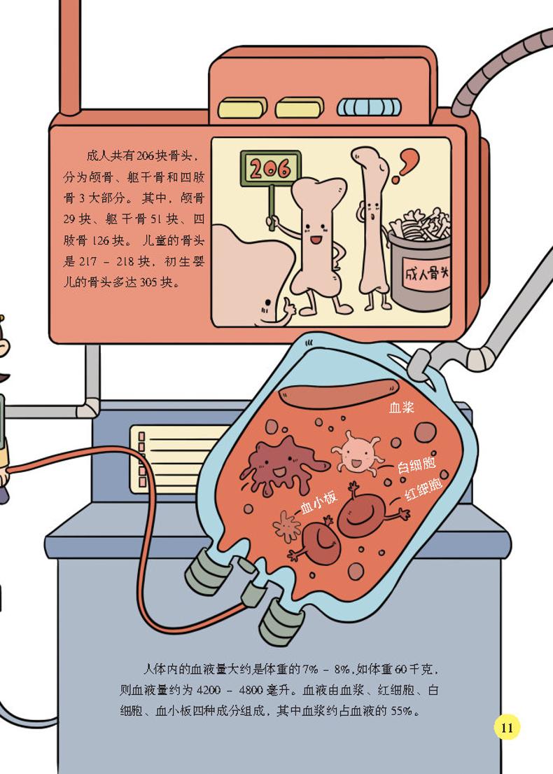 这是一本科普人体知识的图书,目标读者是6~10岁儿童。全书由上百个人体相关知识点组成,内容既涉及心脏、肺、脑、胃等器官,又涵盖血液、骨骼、肌肉等构成人体的各种重要组织。图书通过提问的形式引出一个又一个人体相关知识,再结合生动形象的手绘插画,将读者带入到人体内部众多场景中,便于读者更直观地认识人体中包括器官、组织在内的各个组成部分,最后利用说明文字对提出的疑问进行解答,让读者更科学地理解诸多人体知识,养成健康良好的生活习惯。