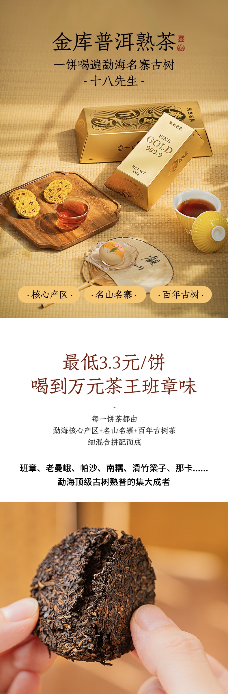 十八先生金库普洱熟茶 | 勐海名山古树茶拼配+十年广州干仓陈化,口粮茶价格品万元级普洱,独立小金币造型茶饼,搭配金砖造型礼盒,福气满满寓意好,送礼自藏都有面,春节礼赠佳品