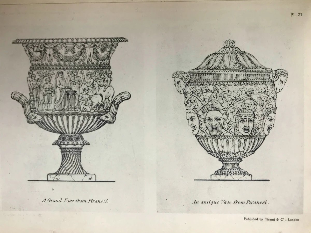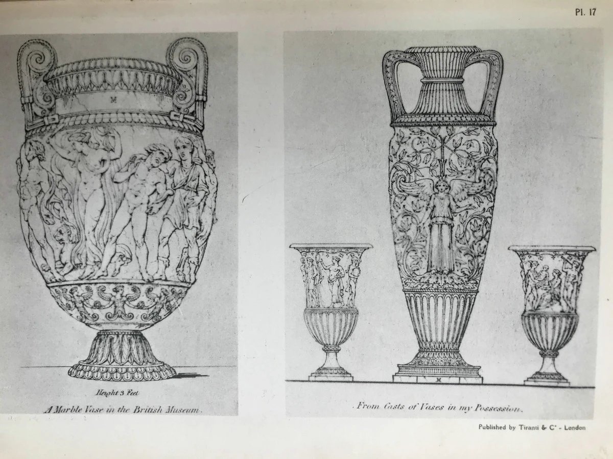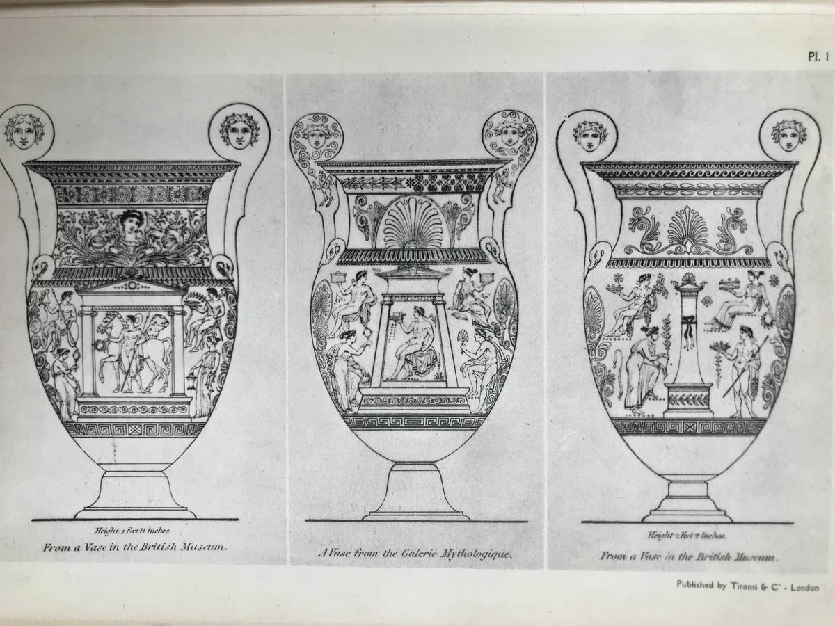 约翰·提兰提(John Tiranti)编选,亨利·摩西(Henry Moses)等人负责雕刻,首次出版于1921年,由伦敦的约翰·提兰提公司(John Tiranti & Co.)出版。这本书是对古代艺术品的一次精美展示,特别聚焦于花瓶、三脚架和烛台等物品,它们大多数来自欧洲和其他地区的博物馆和私人收藏。本书通过超过150幅精选的图像,展示了各种各样的古代器物。这些图像不仅精确地描绘了每一件艺术品的细节,还通过精湛的雕刻技巧展示了它们的艺术价值与历史意义。这些器物大多为古希腊、罗马以及其他古代文明的艺术珍品,它们通常具有极高的美学价值和文化遗产意义。约翰·提兰提(John Tiranti)是一位专注于艺术和博物学领域的专家,他的工作对古代艺术品的推广起到了重要作用。书中不仅展示了这些古物的视觉魅力,还通过简洁的说明介绍了它们的历史背景和文化含义。亨利·摩西(Henry Moses)等人的雕刻技艺将这些艺术品的细节精妙呈现,使得读者可以通过图像感受到每一件作品的独特美感。