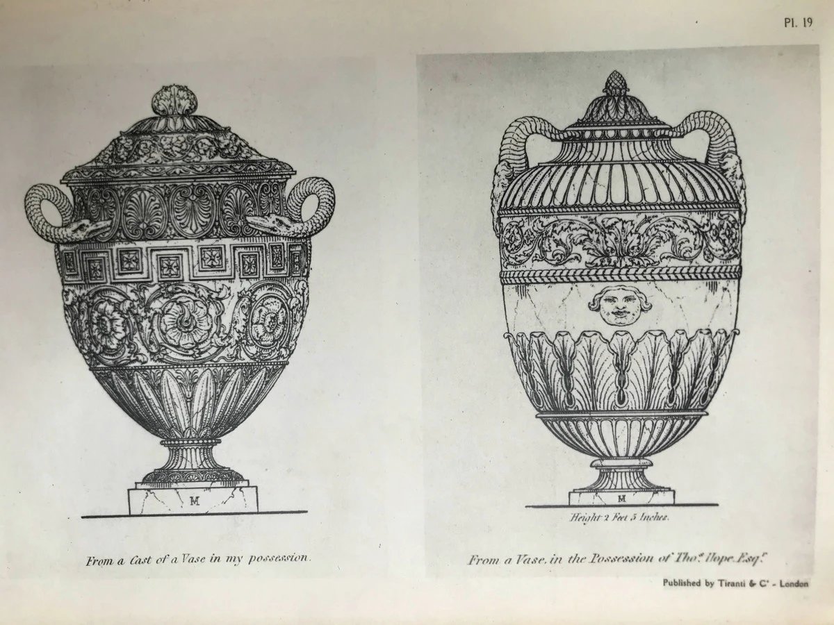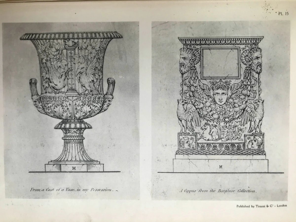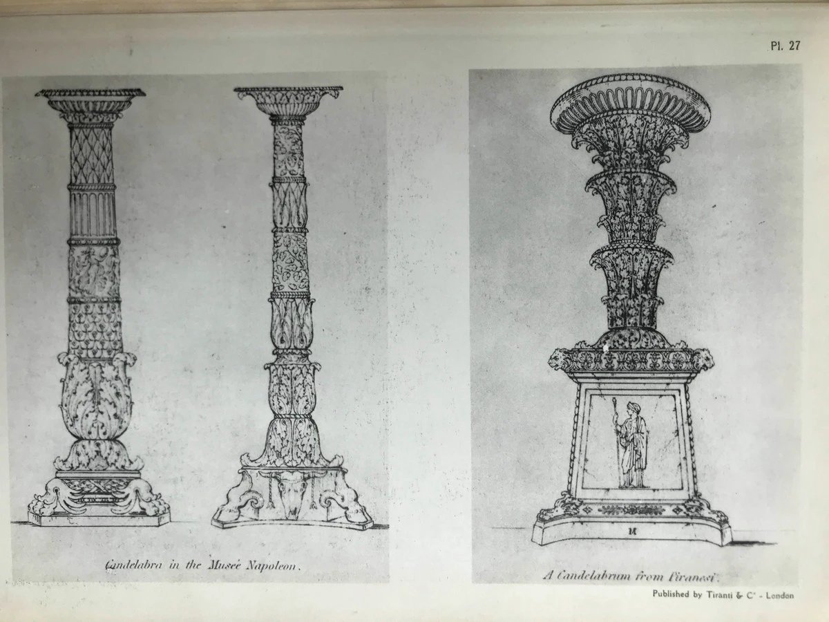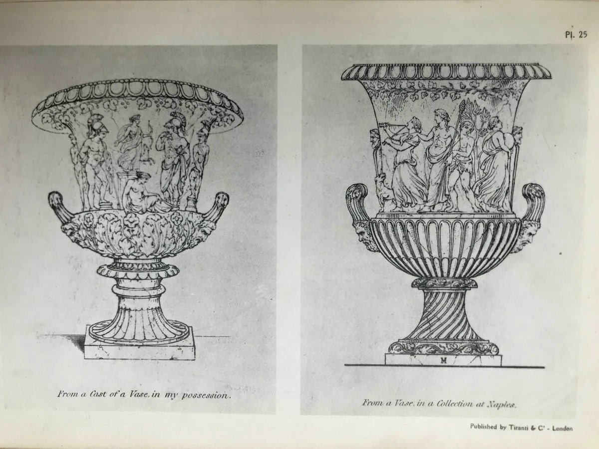 约翰·提兰提(John Tiranti)编选,亨利·摩西(Henry Moses)等人负责雕刻,首次出版于1921年,由伦敦的约翰·提兰提公司(John Tiranti & Co.)出版。这本书是对古代艺术品的一次精美展示,特别聚焦于花瓶、三脚架和烛台等物品,它们大多数来自欧洲和其他地区的博物馆和私人收藏。本书通过超过150幅精选的图像,展示了各种各样的古代器物。这些图像不仅精确地描绘了每一件艺术品的细节,还通过精湛的雕刻技巧展示了它们的艺术价值与历史意义。这些器物大多为古希腊、罗马以及其他古代文明的艺术珍品,它们通常具有极高的美学价值和文化遗产意义。约翰·提兰提(John Tiranti)是一位专注于艺术和博物学领域的专家,他的工作对古代艺术品的推广起到了重要作用。书中不仅展示了这些古物的视觉魅力,还通过简洁的说明介绍了它们的历史背景和文化含义。亨利·摩西(Henry Moses)等人的雕刻技艺将这些艺术品的细节精妙呈现,使得读者可以通过图像感受到每一件作品的独特美感。