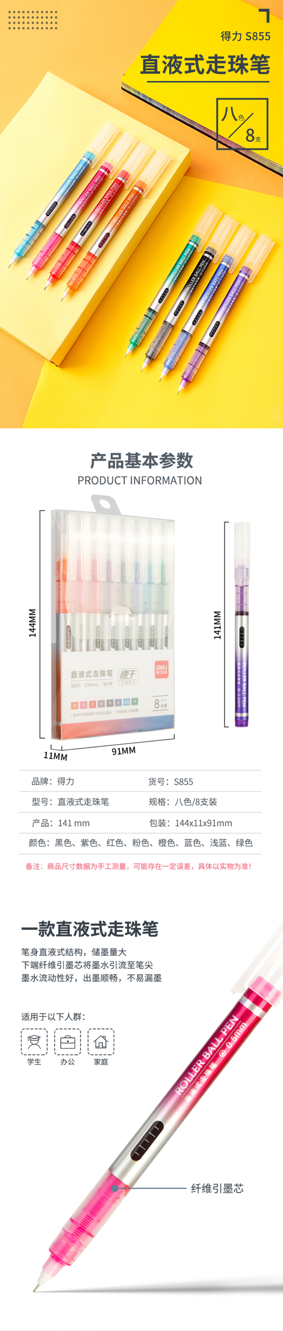 得力(deli)彩色直液笔套装 0.5mm全针管学生签字笔中性笔 水笔走珠笔 8支/盒S855