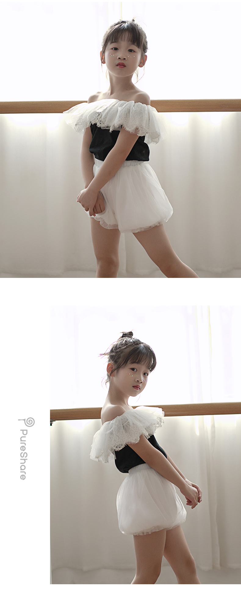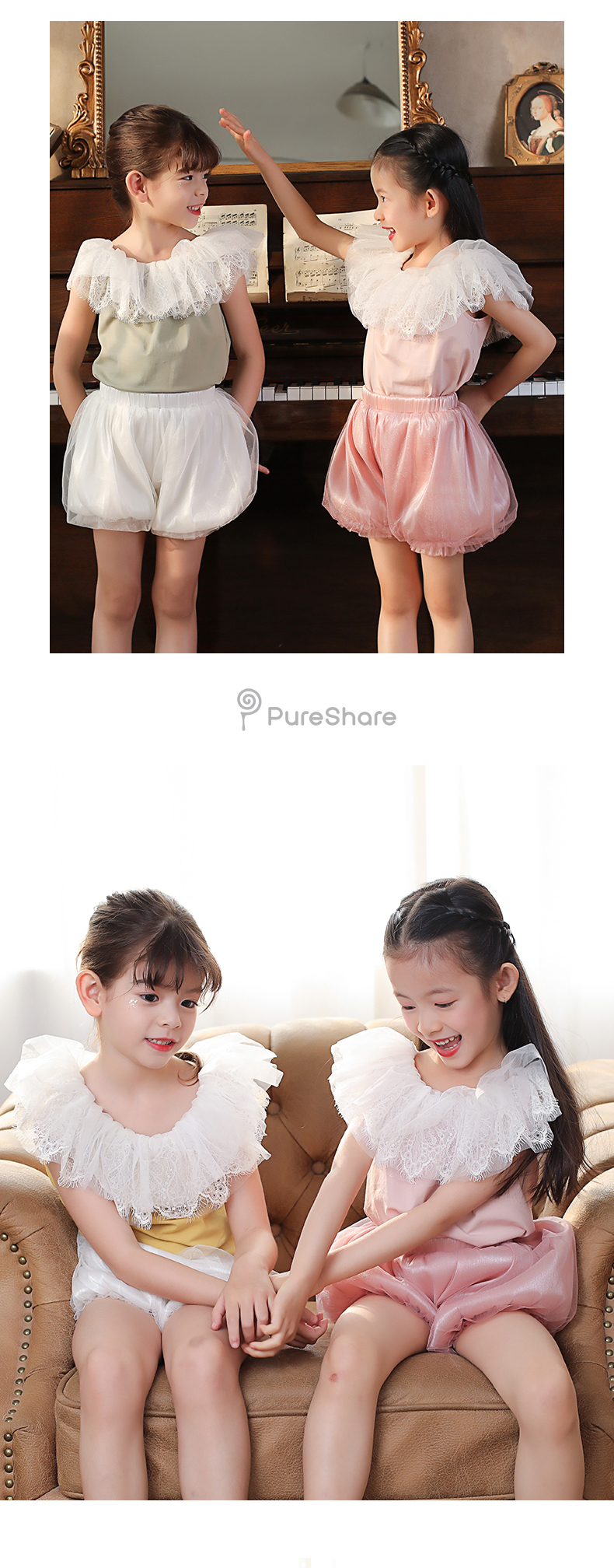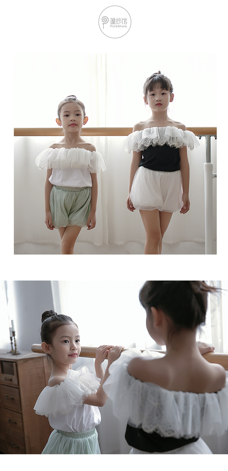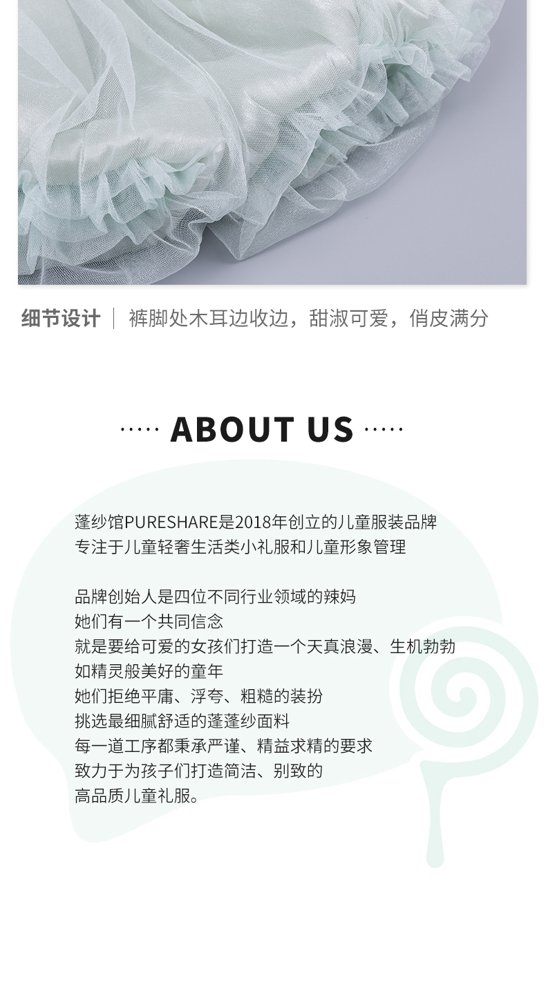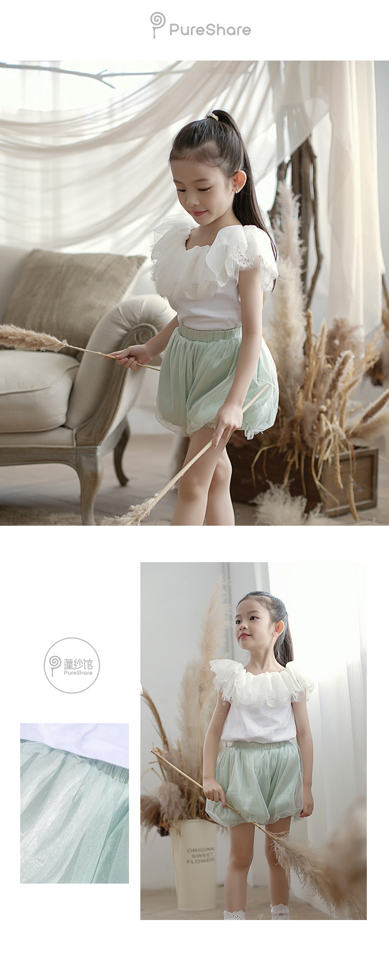 - PureShare蓬纱馆,2018年创立的儿童服装品牌,专注于儿童轻奢生活类小礼服,主张“让孩子做最独特的自己”的品牌理念,为孩子们提供时尚简洁、优雅而又不失童真的生活类礼服。