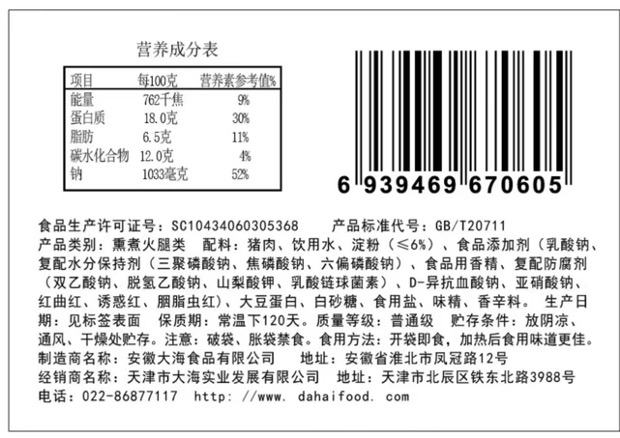 大海天津老火腿6根装