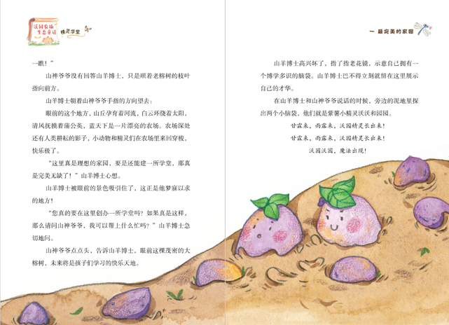 在一个满是星光的晚上,沃沃和园园从紫薯地里钻出来,星光在他们头顶的小叶片上撒了魔法粉,小叶片像螺旋桨一样转动起来,带着他们在田野里飞翔。他们对着田野里的植物唱起歌: