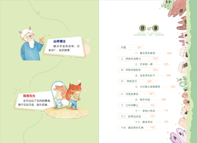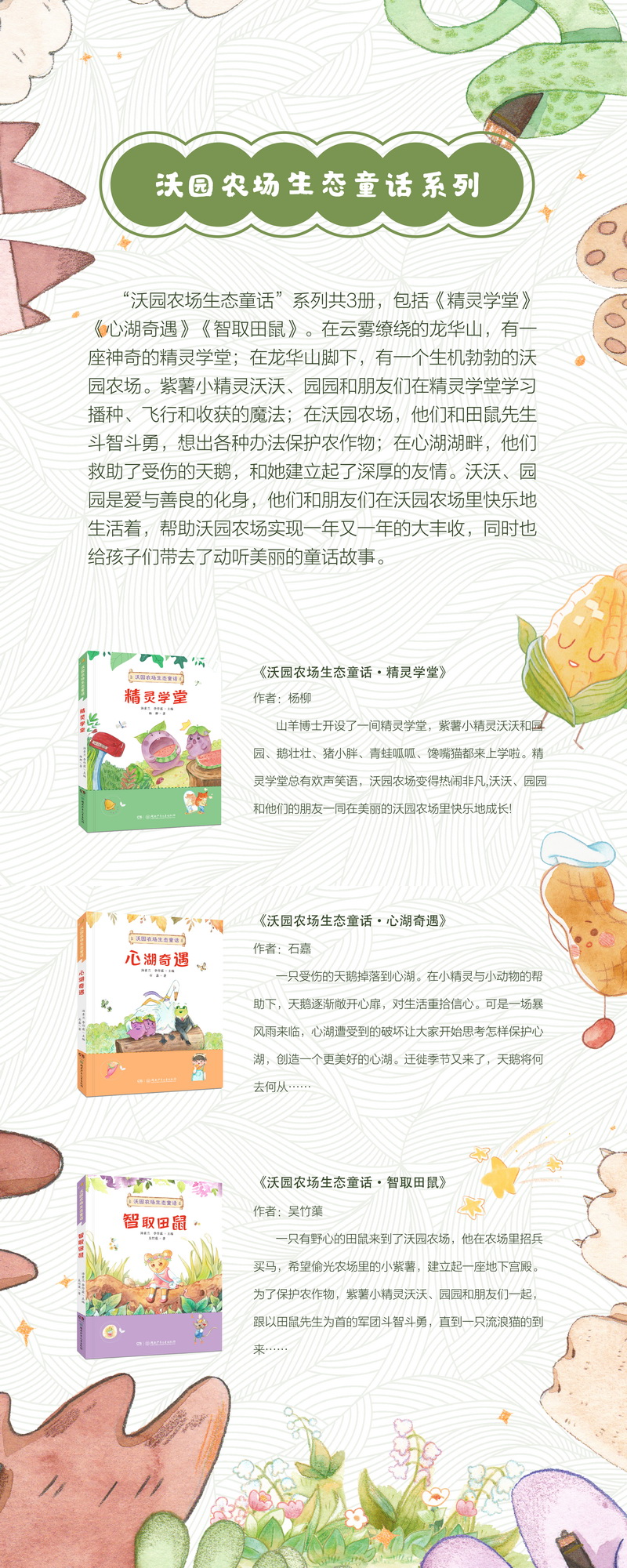 “沃园农场生态童话”系列共三册,包括《精灵学堂》《心湖奇遇》《智取田鼠》。在云雾缭绕的龙华山,有一座神奇的精灵学堂。在龙华山脚下,有一个生机勃勃的沃园农场。紫薯小精灵沃沃、园园和朋友们在精灵学堂学习播种、飞行和收获的魔法;在沃园农场,他们和田鼠先生斗智斗勇,想出各种办法保护农作物;在心湖湖畔,他们救助了受伤的天鹅,和她建立起了深厚的友情。沃沃、园园是爱与善良的化身,他们和朋友们在沃园农场里快乐地生活着,帮助沃园农场实现一年又一年的大丰收,同时也给孩子们带去了动听美丽的童话故事。