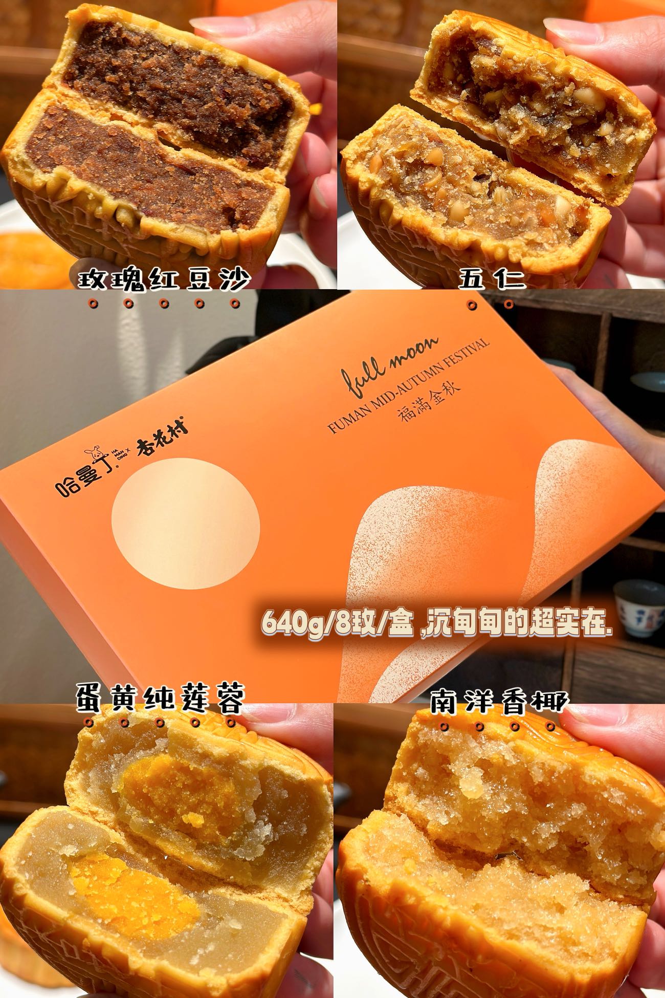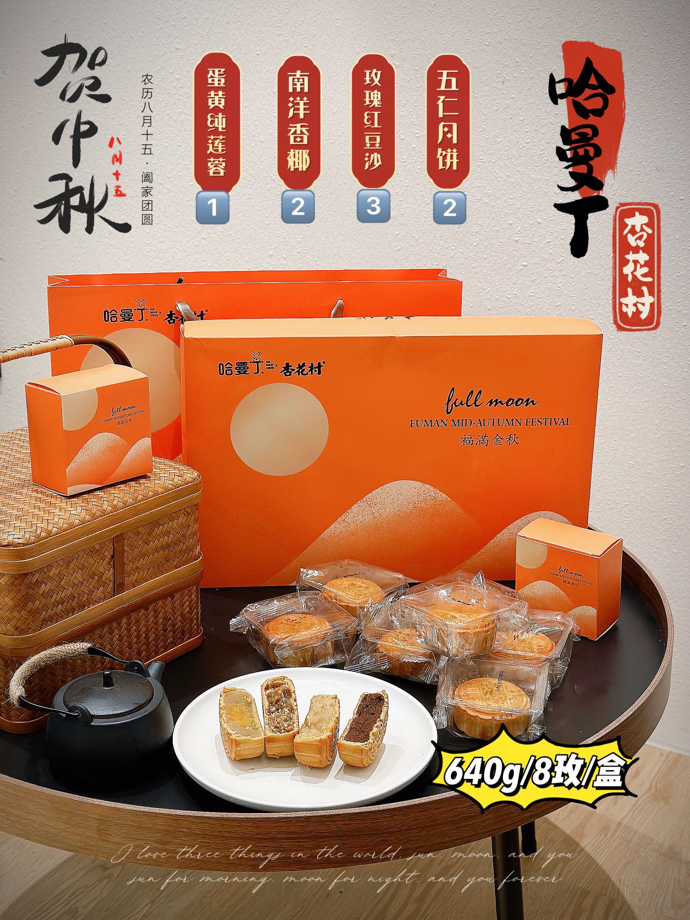 【品牌授权】哈曼丁&杏花村 联名款 星火耀月*广式月饼 640g/8玫/盒 蛋黄纯莲蓉1个 南洋香椰2个 玫瑰红豆沙3个 五仁月饼2个