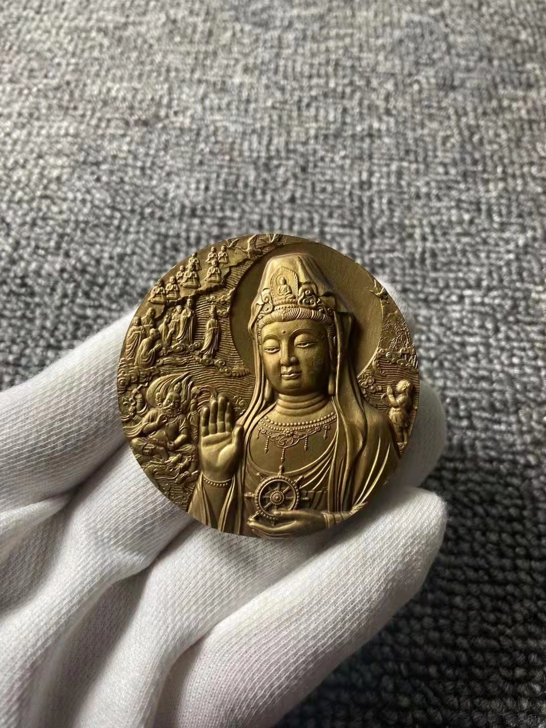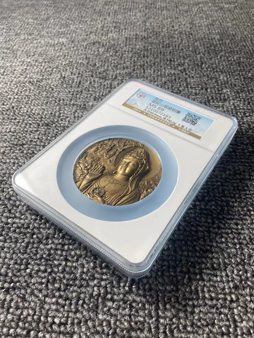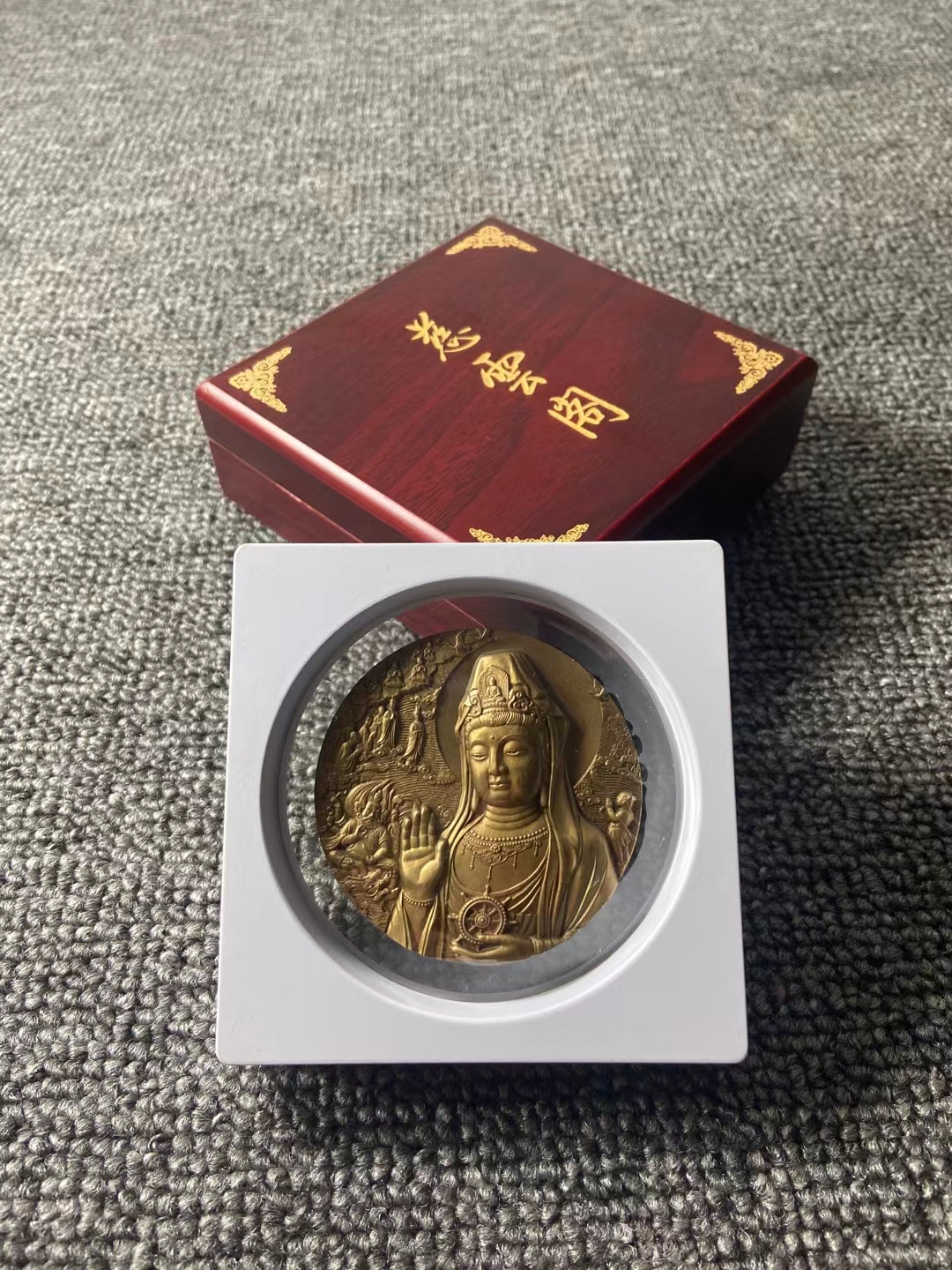 中国四大佛教名山-普陀山观世音大铜章.60mm.普陀铜章.带证书。