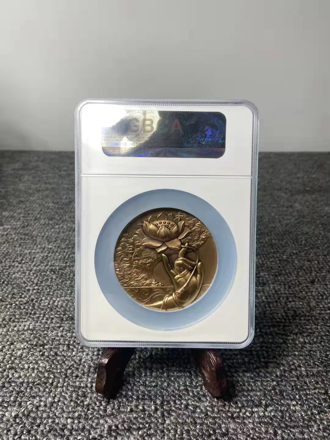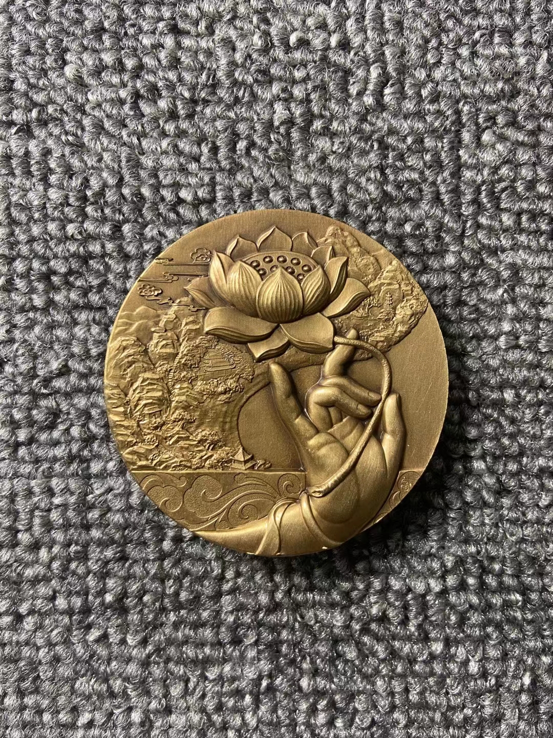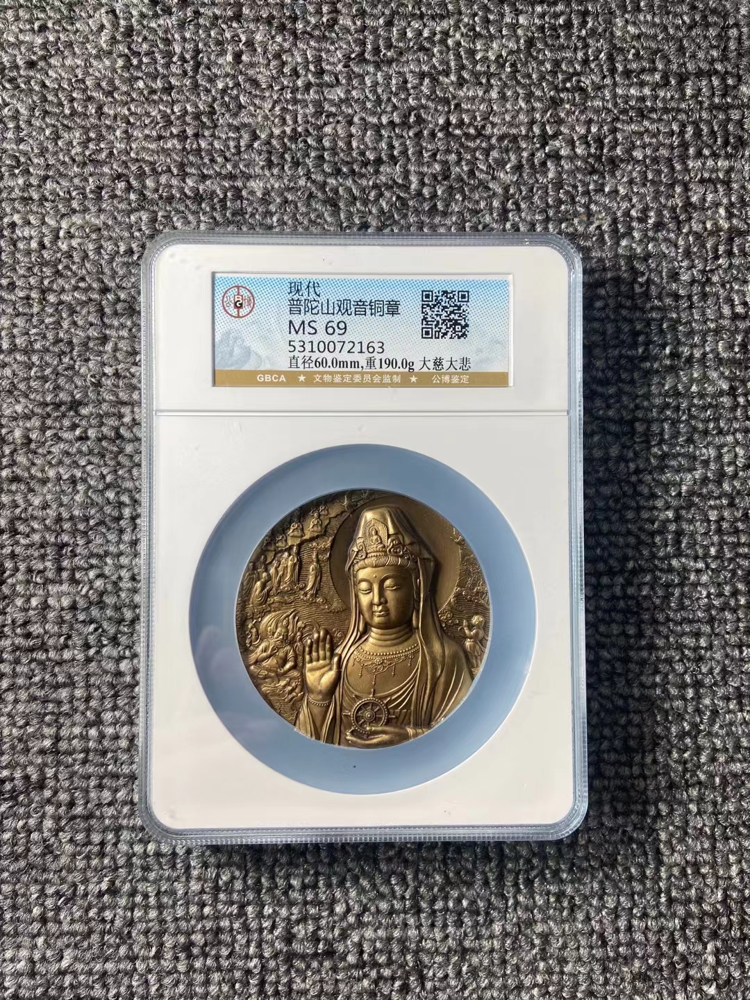 中国四大佛教名山-普陀山观世音大铜章.60mm.普陀铜章.带证书。