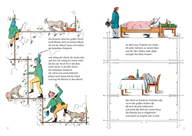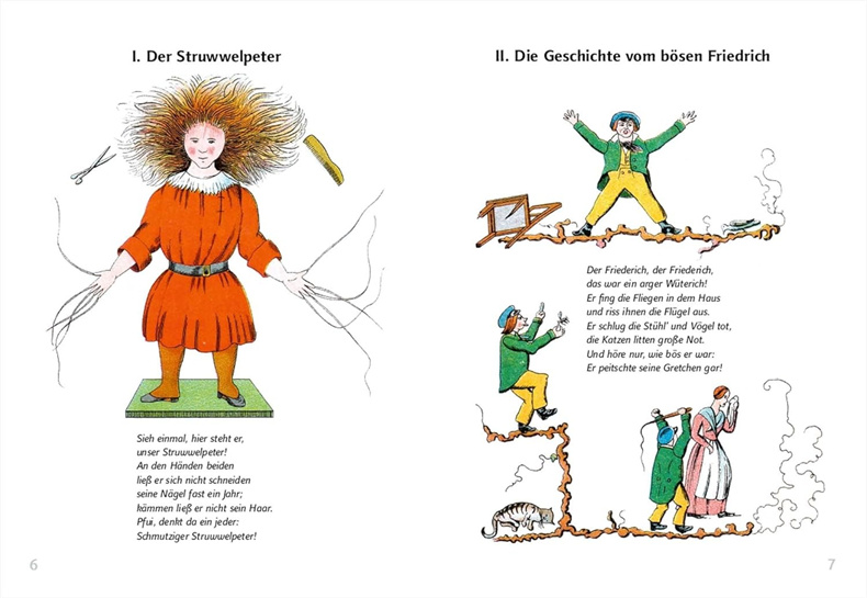 1844年圣诞节,法兰克福医生海因里希·霍夫曼送给他三岁的儿子卡尔一本自制的图画书《Struwwelpeter》。所有看到的人都鼓励他把它印出来——于是,这位父亲送给儿子的这份私人礼物就变成了一本附有文字的图画书,至今仍摆放在每个孩子的房间里。书中的一些诗句甚至成了家喻户晓的口头禅:“不,我不吃汤。”