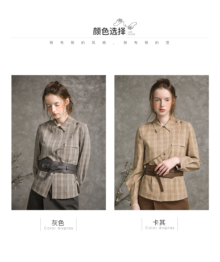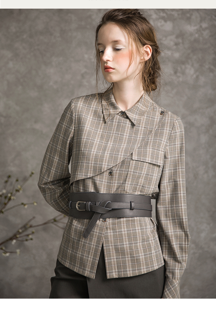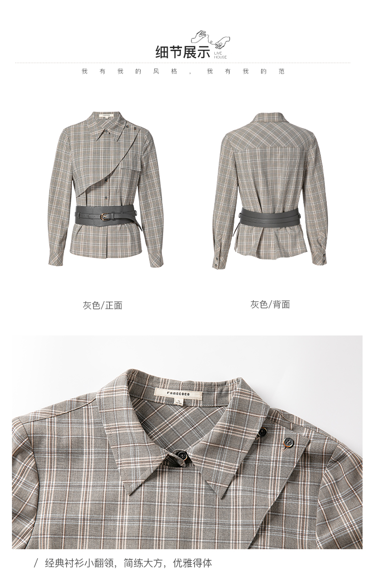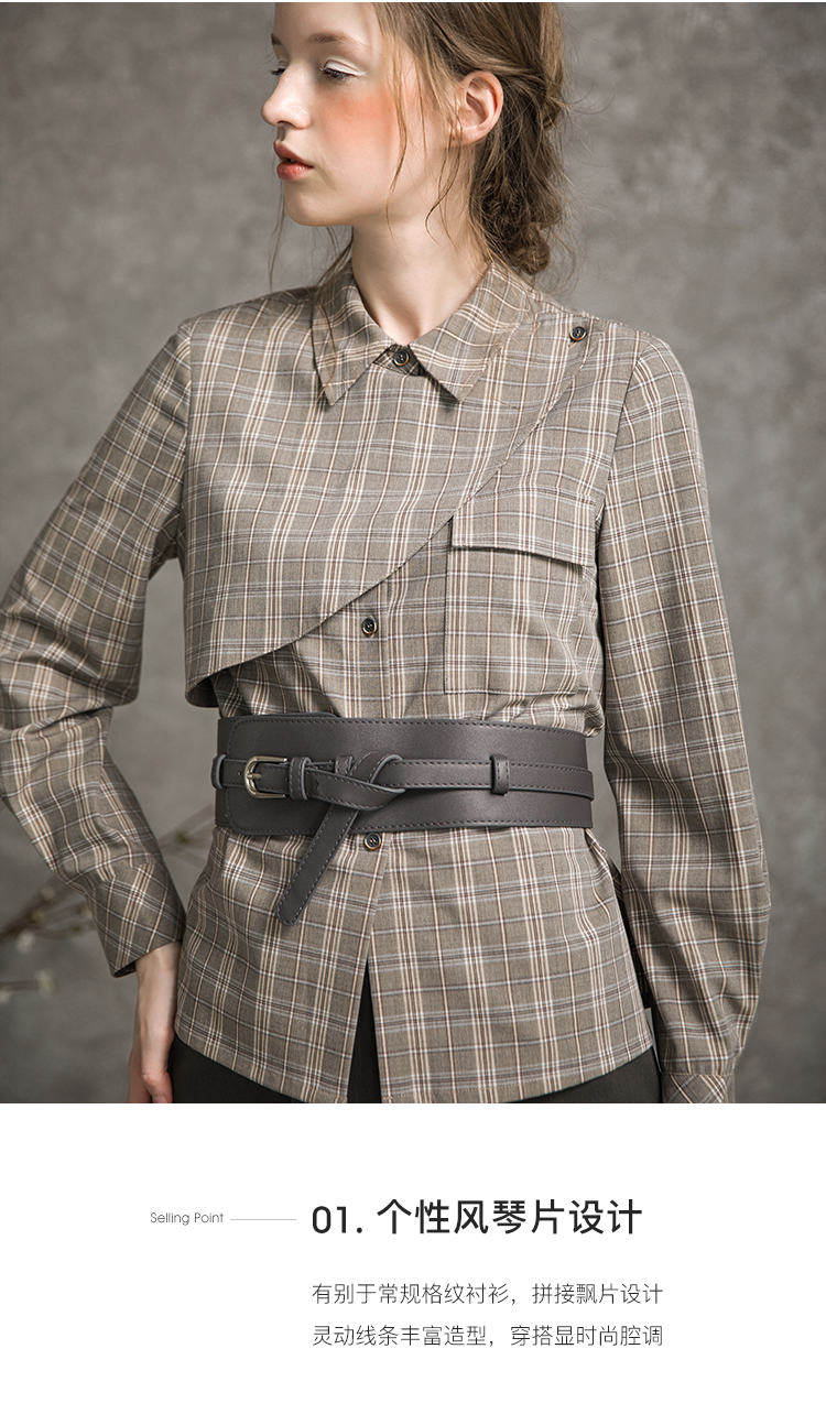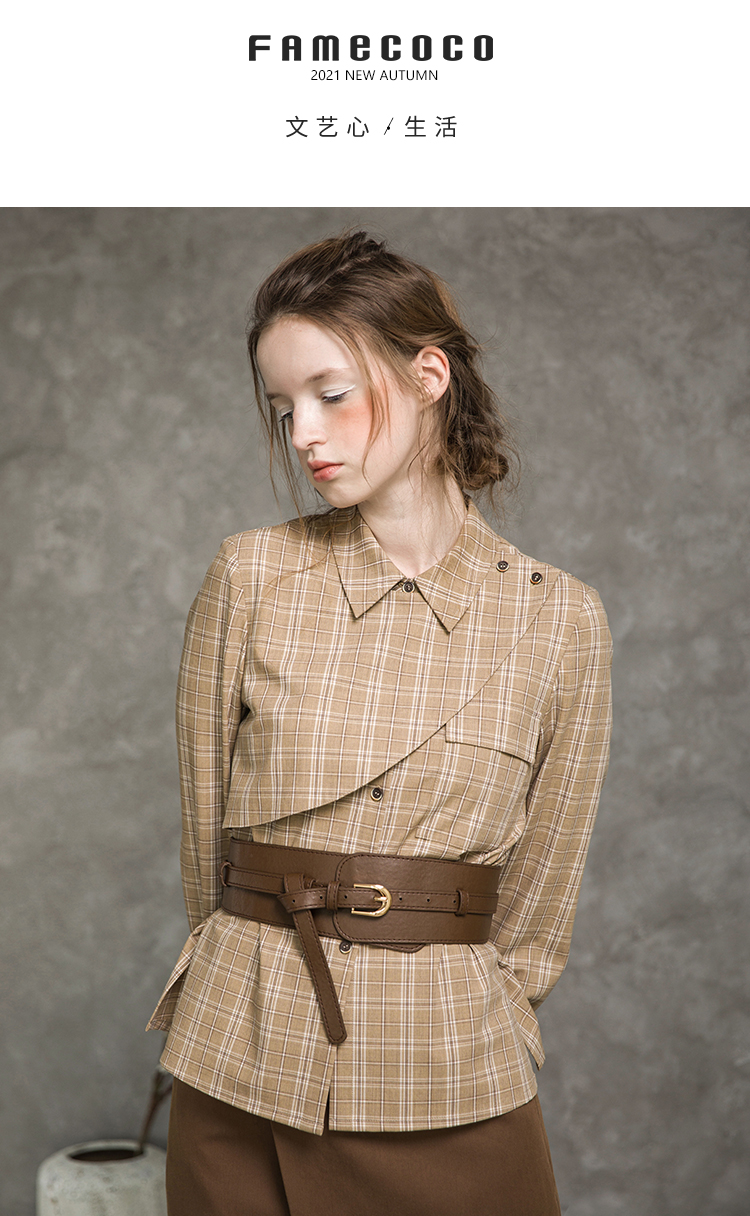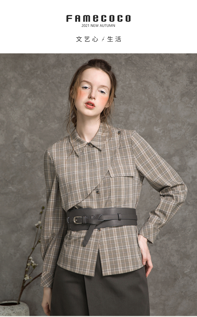 Famecoco范可儿个性格子衬衫女秋薄款腰封收腰衬衣F216BH013