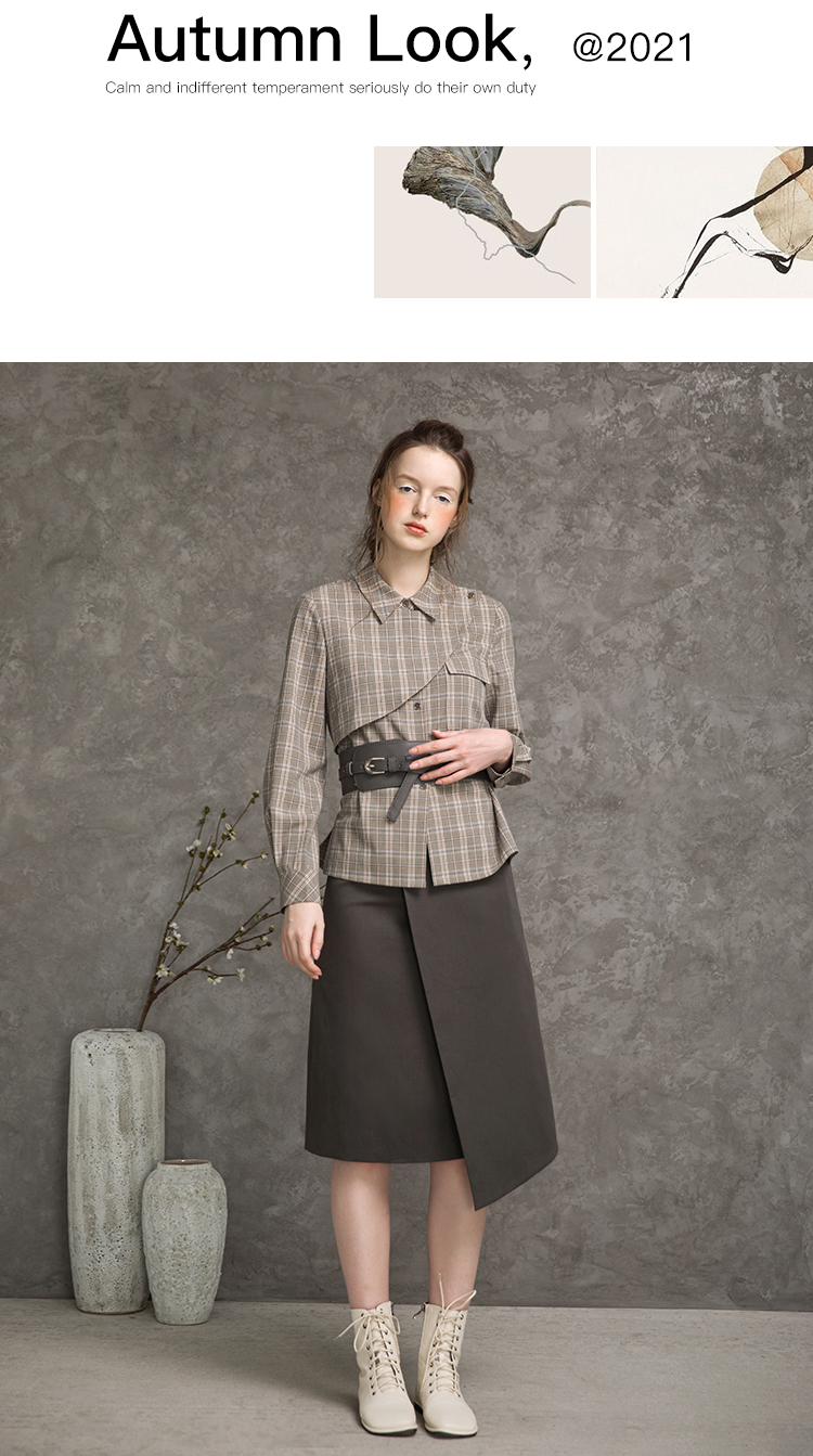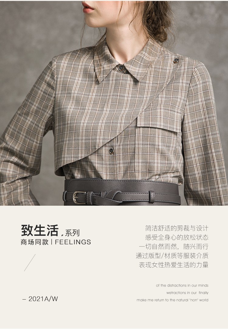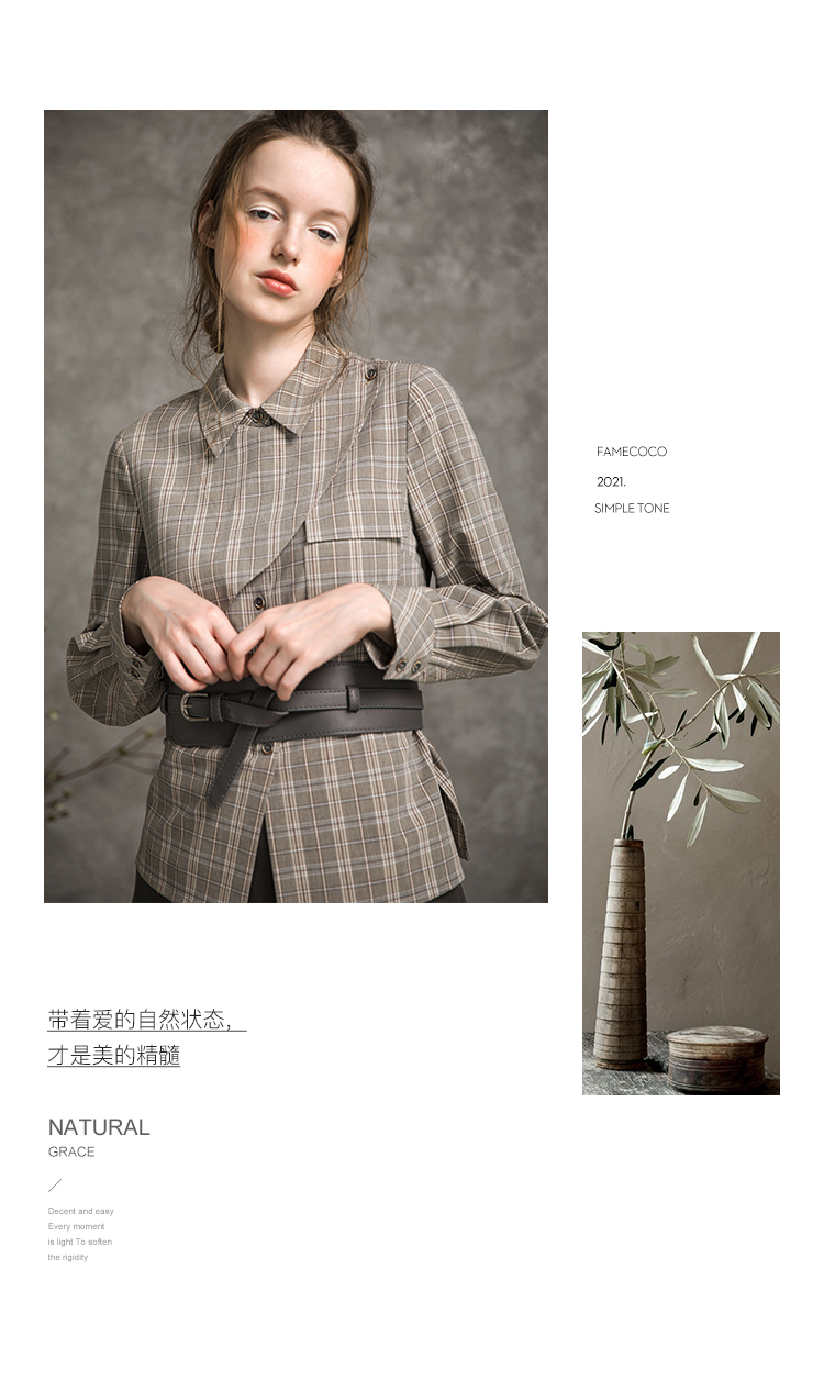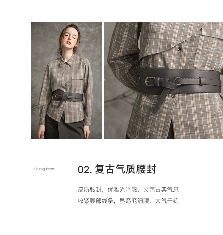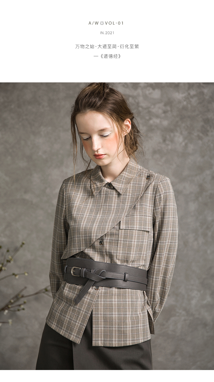 Famecoco范可儿个性格子衬衫女秋薄款腰封收腰衬衣F216BH013