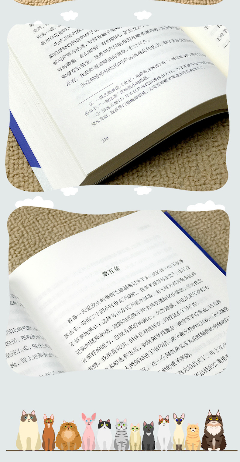 《我是猫》是夏目漱石的代表作。小说以一只猫的视角,观察并评述身为中学教师的主人苦沙弥和他的朋友们的日常生活。小说中的猫语言幽默机智,妙语连珠,作者借其口嘲笑了明治社会矢目识分子空虚的精神世界,揭露了金田等资产阶级及其帮凶的势利、粗鄙、凶残的本性。全书构思灵巧,手法夸张,具有鲜明的艺术特色。