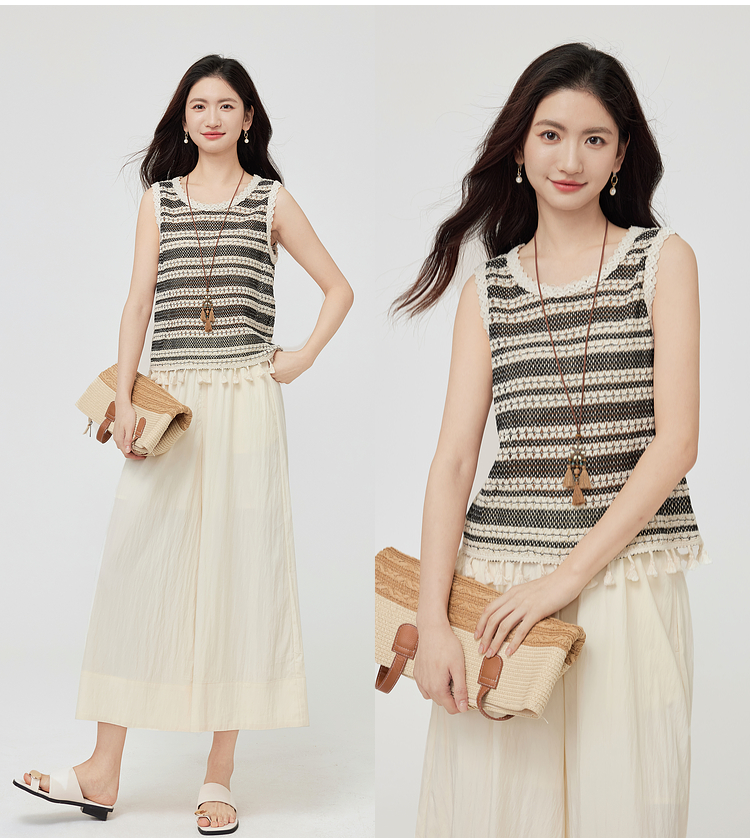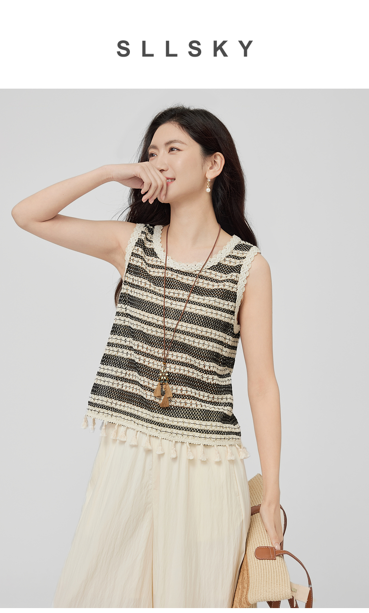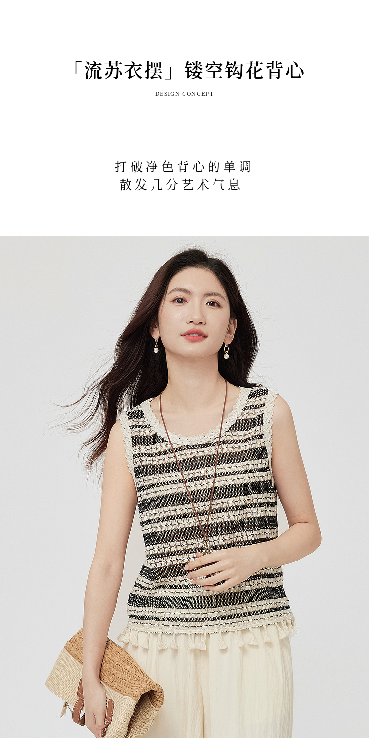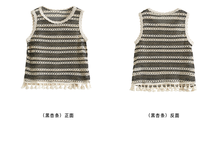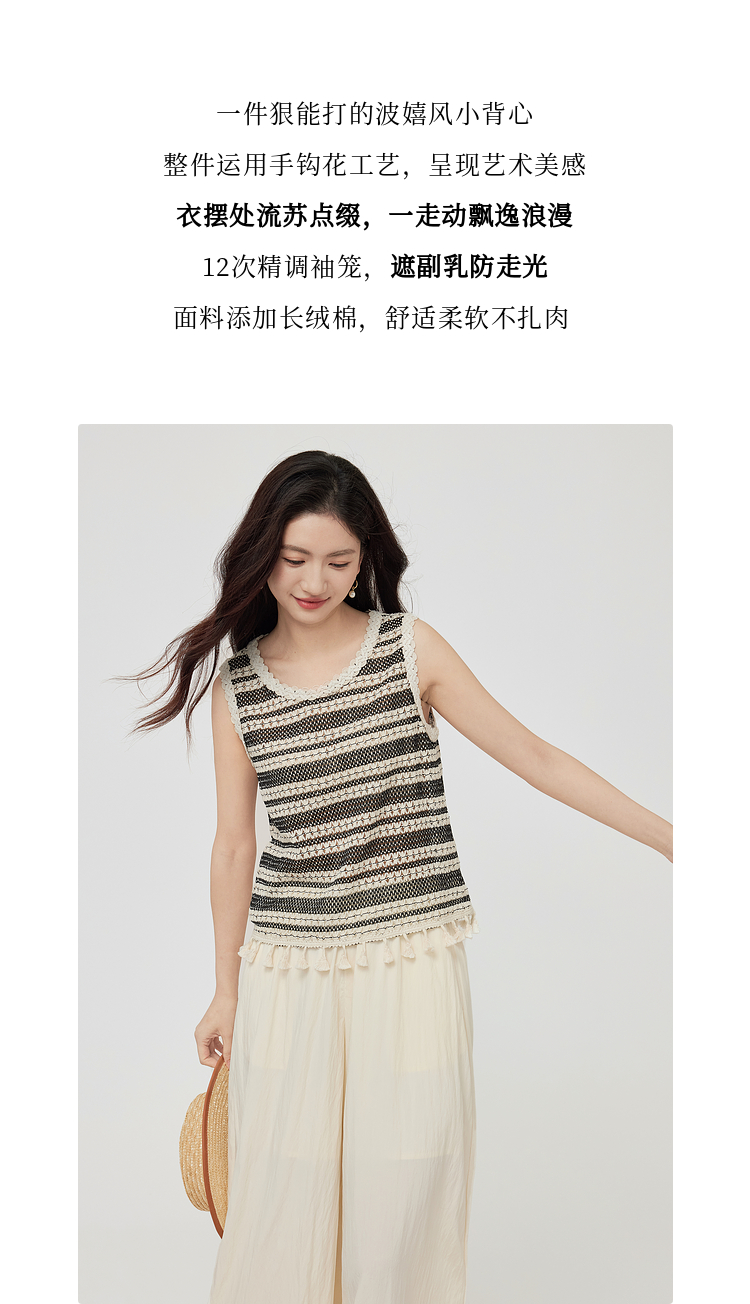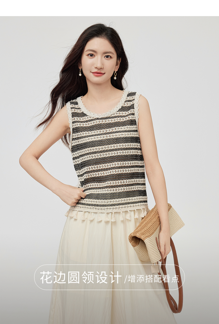 【07/30新品6.5折】熙世界波西米亚镂空钩花条纹背心女夏季外穿时尚流苏圆领无袖上衣