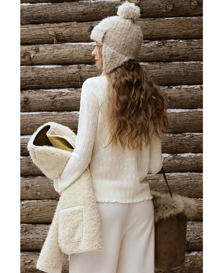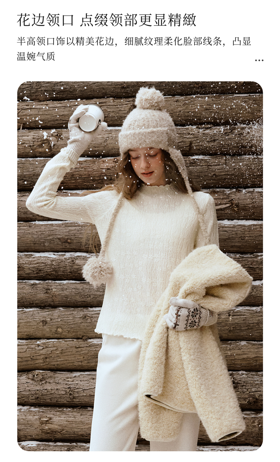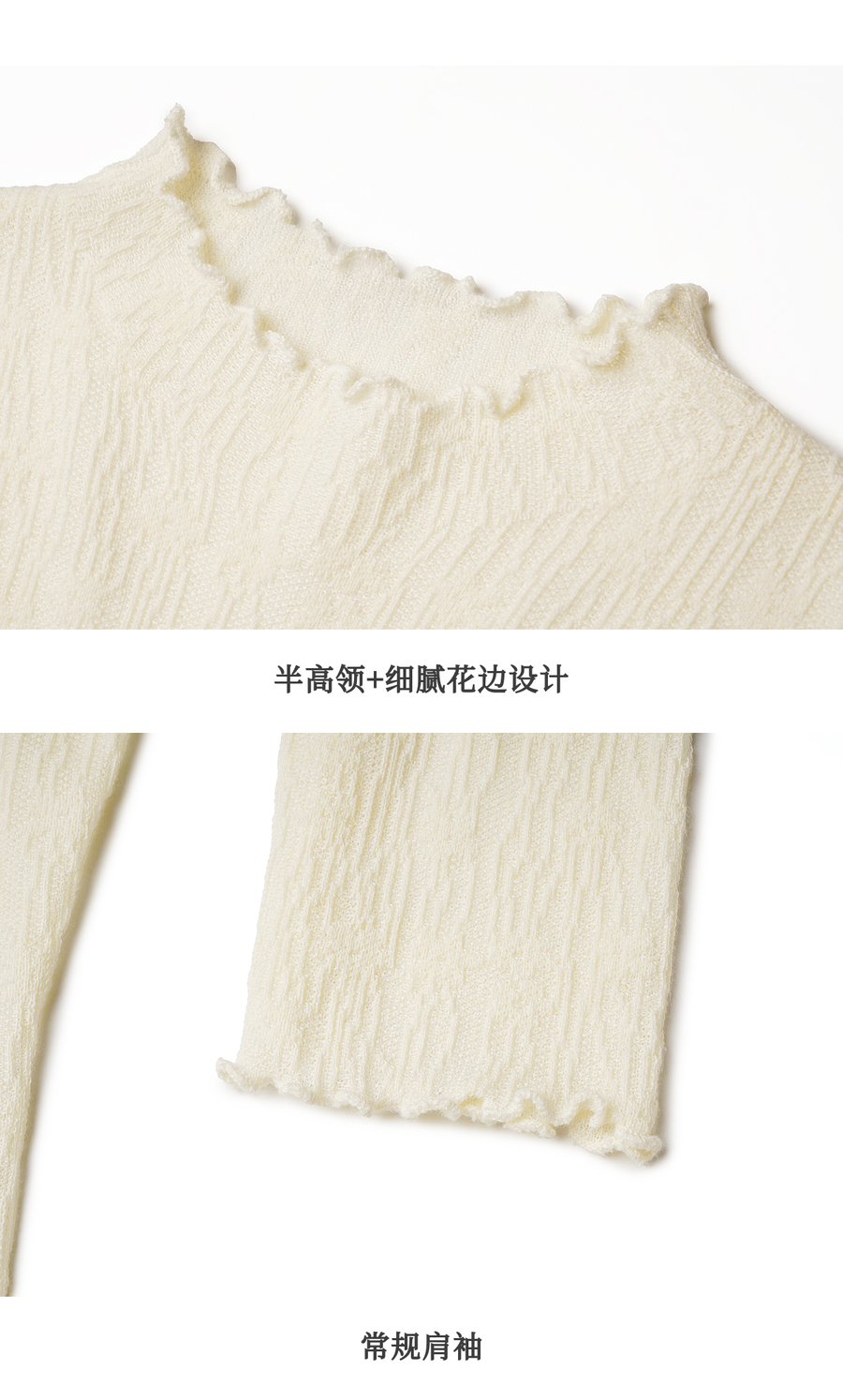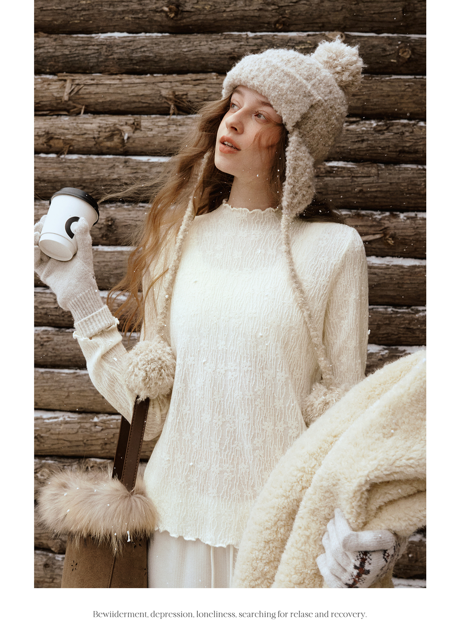 木耳边蕾丝提花半高领微透套头针织衫女冬季内搭法式杏色长袖T恤