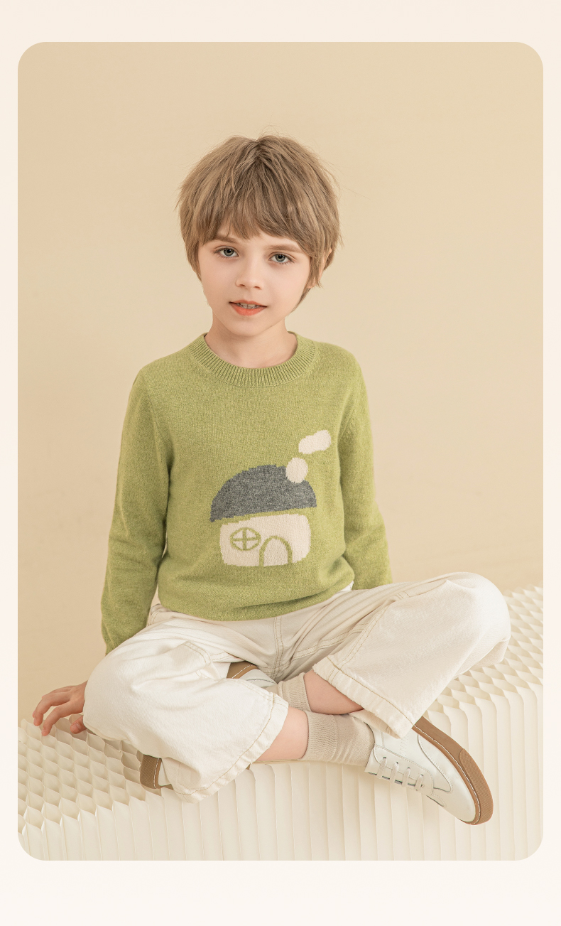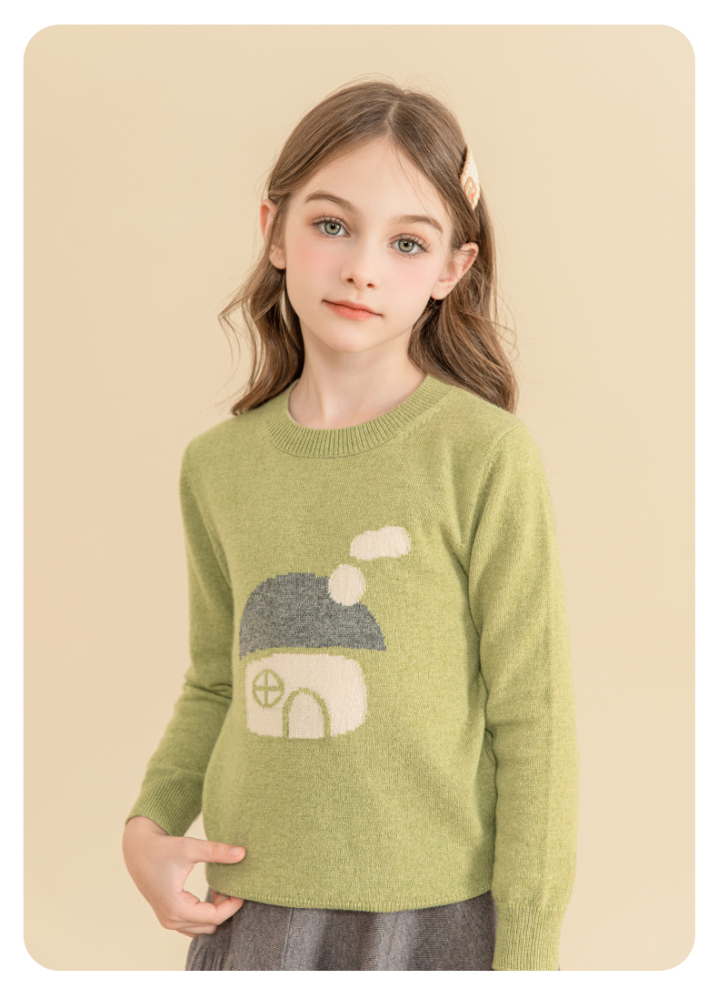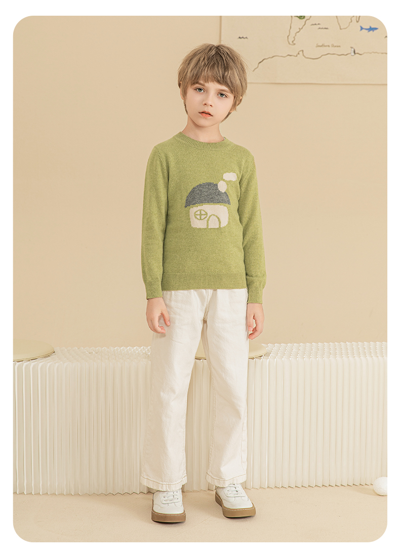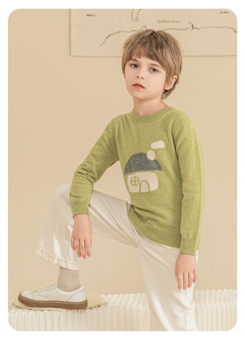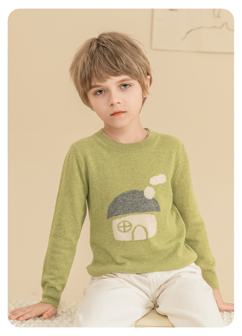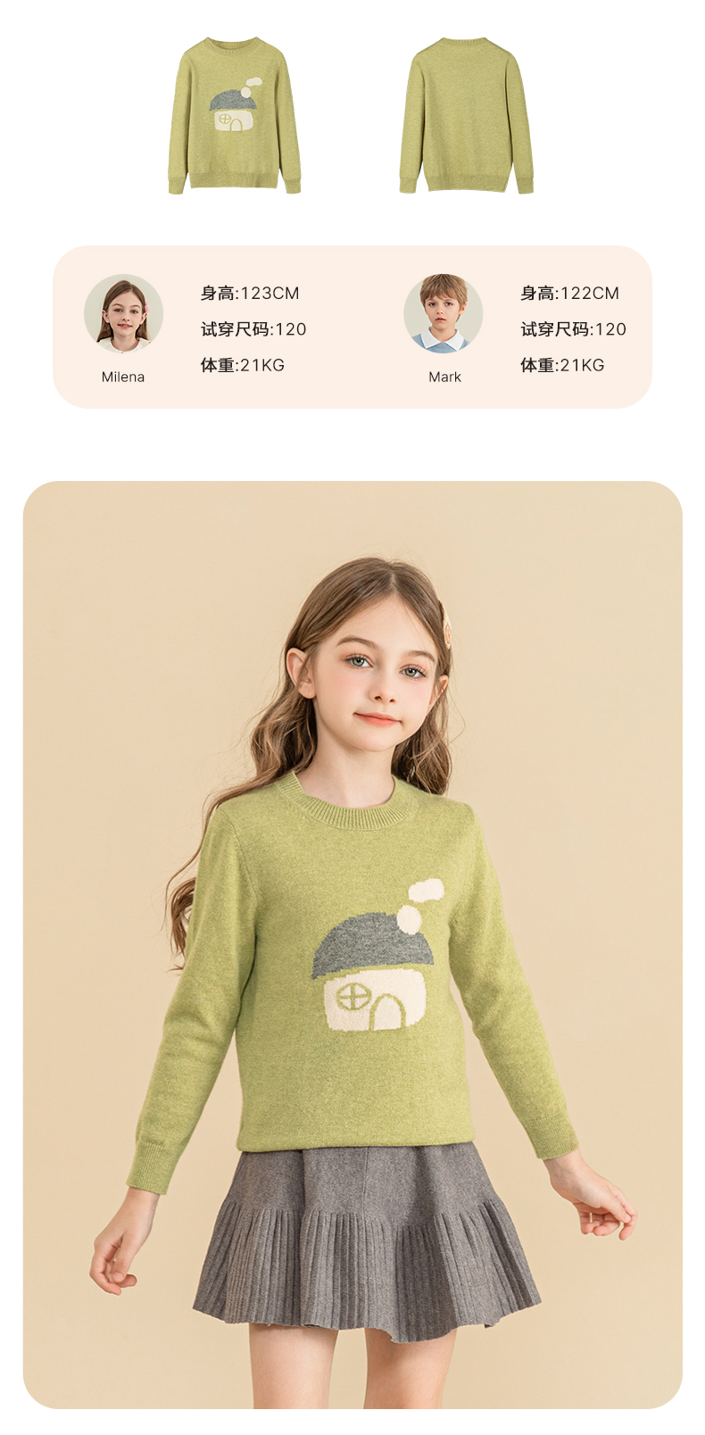 mettekids儿童羊绒衫2023秋季新款抹茶绿针织衫男童女童卡通毛衣