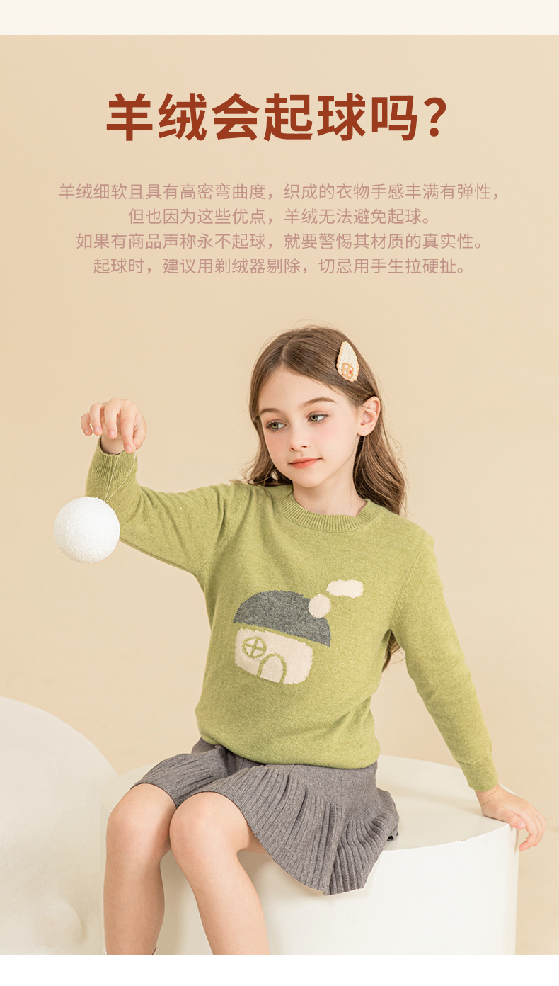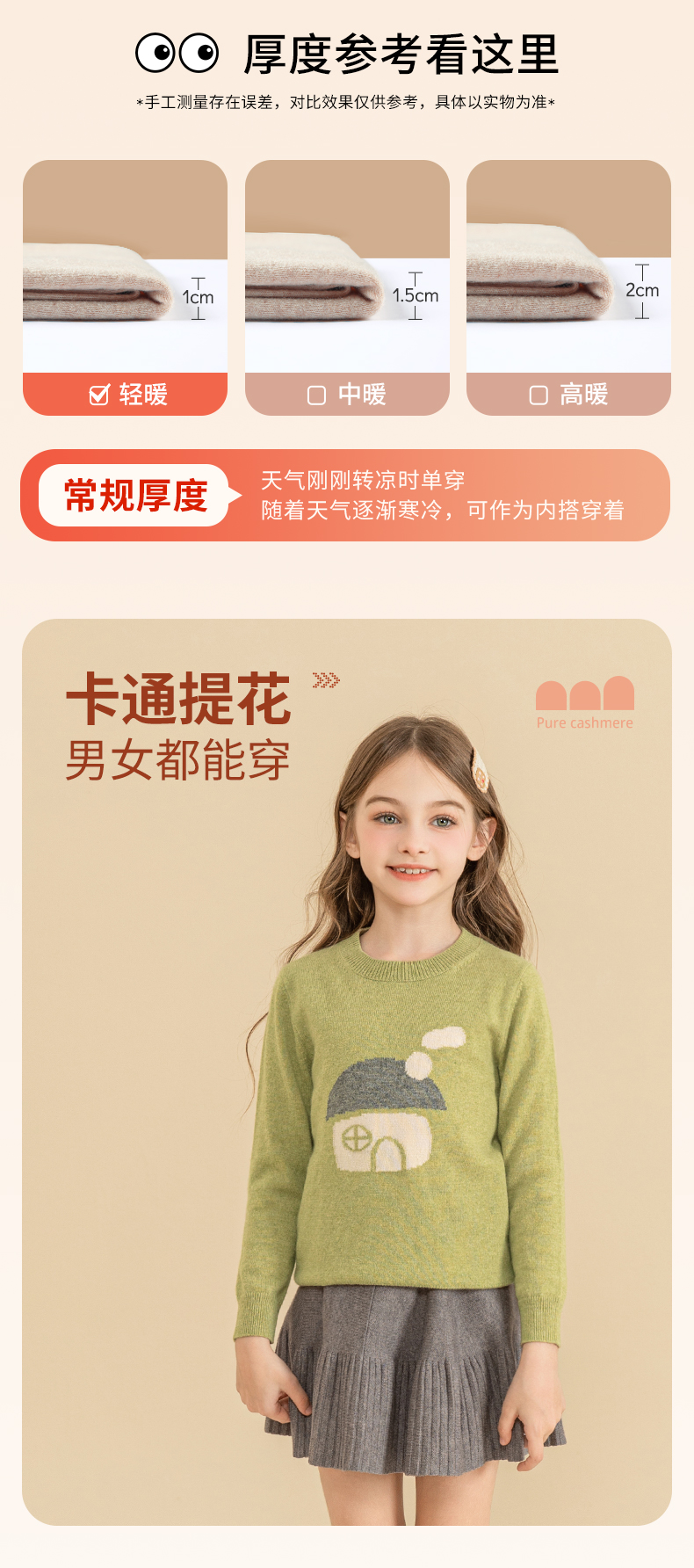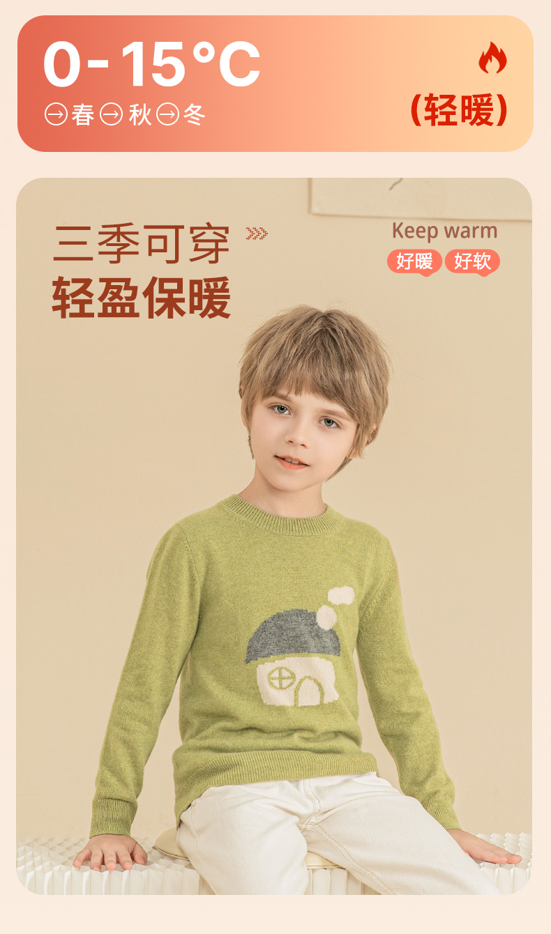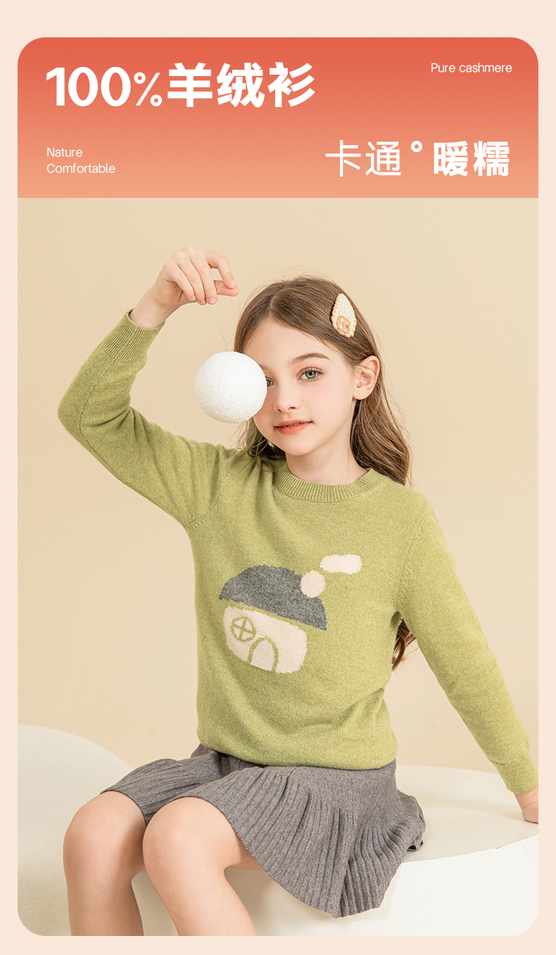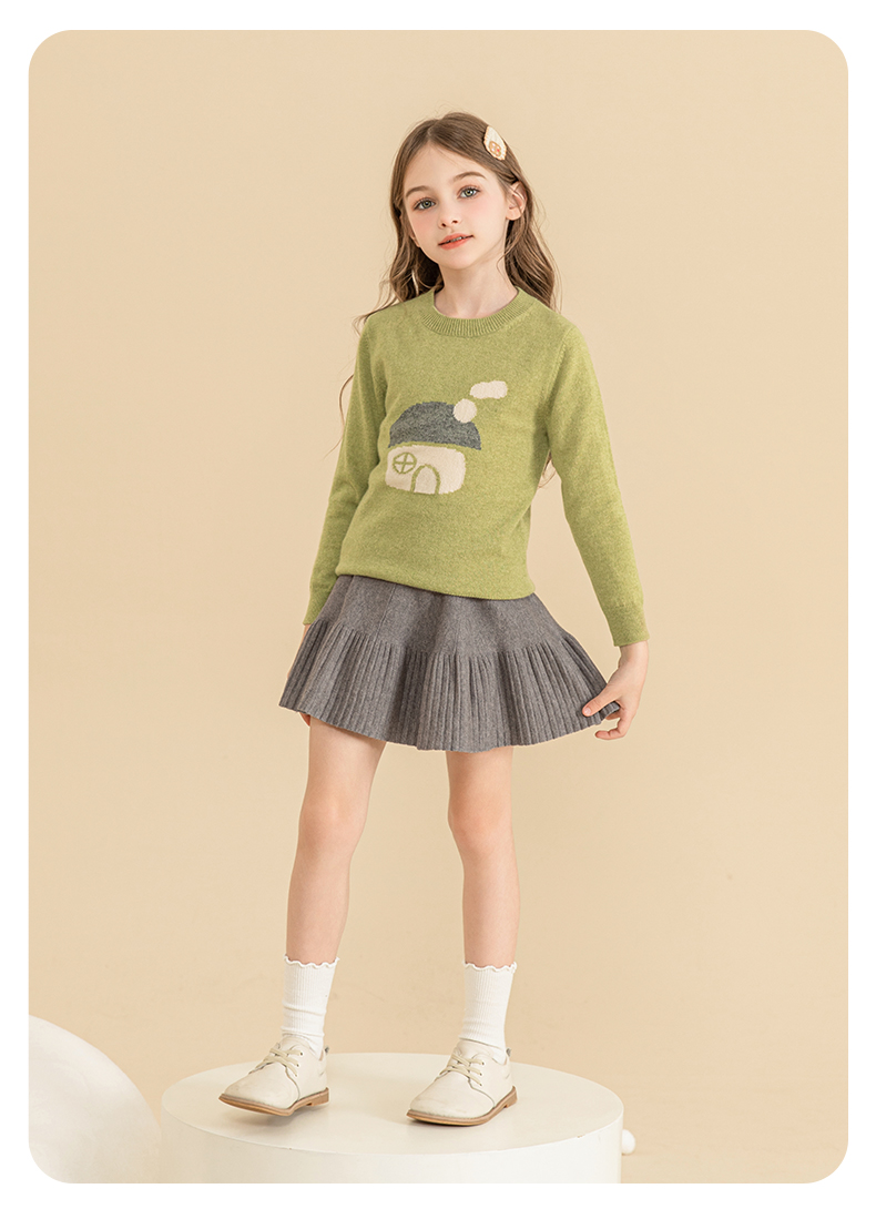 mettekids儿童羊绒衫2023秋季新款抹茶绿针织衫男童女童卡通毛衣