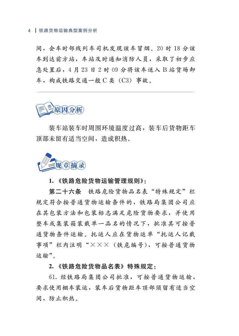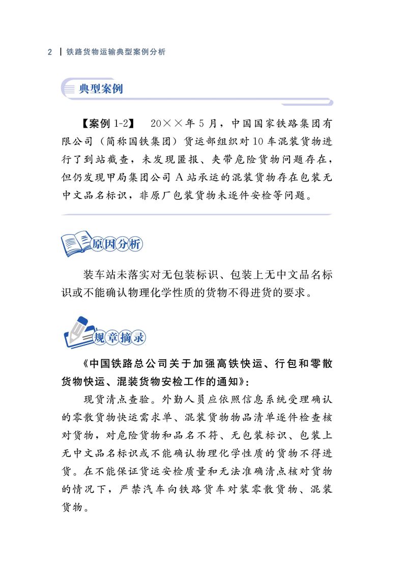 本书有北京局集团公司货运部宫丹青、苑晓明主编,针对铁路货物运输过程中常见典型案例进行分析,将事故案例概况、原因分析、处理规章依据进行了整理,对现场作业具有很好的指导作用。全书共分12章,包括危险货物运输、集装箱运输、散堆装货物装载、专用线管理、装卸安全、装卸车质量、篷布管理、装载加固、货场管理、车辆使用、货运计量安全检测设备和其他。本书可供铁路货运人员日常参考使用,也可作为铁路货运岗位职工培训用书。