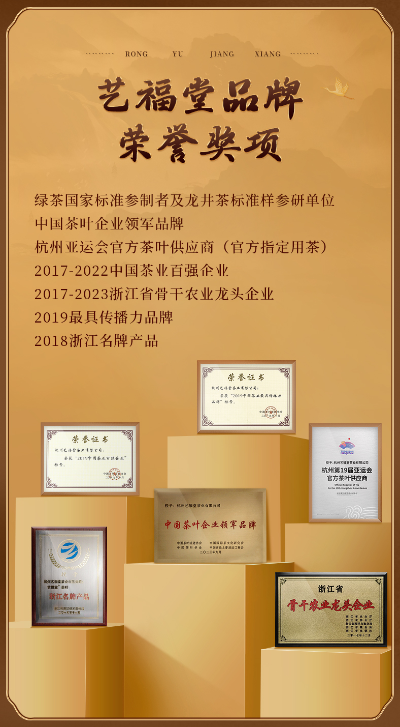 - “艺福堂茶业”创立于2008年,是一家集生产、销售、科研为一体的现代茶业企业,主打西湖龙井,兼营世界各地名优茗茶及花草茶,是中国茶行业为数不多的年销售额过5亿的品牌之一,是杭州亚运会官方指定用茶!