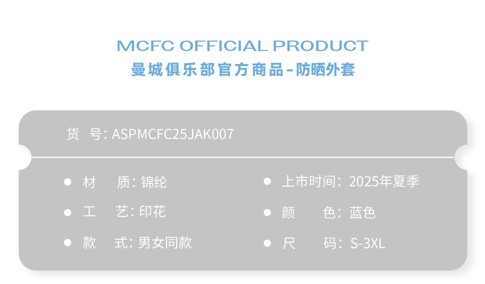 【官方正版】曼城俱乐部 | 夏季轻薄防晒外套蓝色凉爽连帽外搭